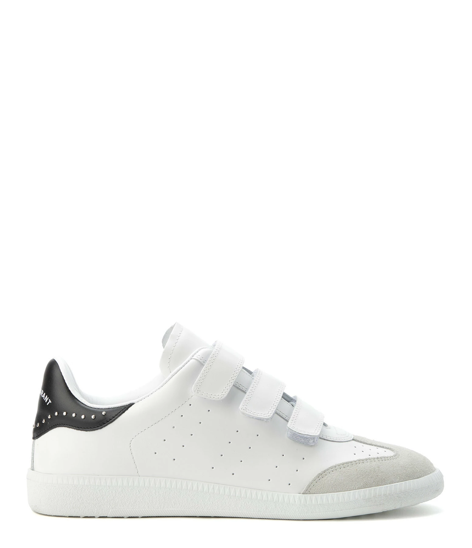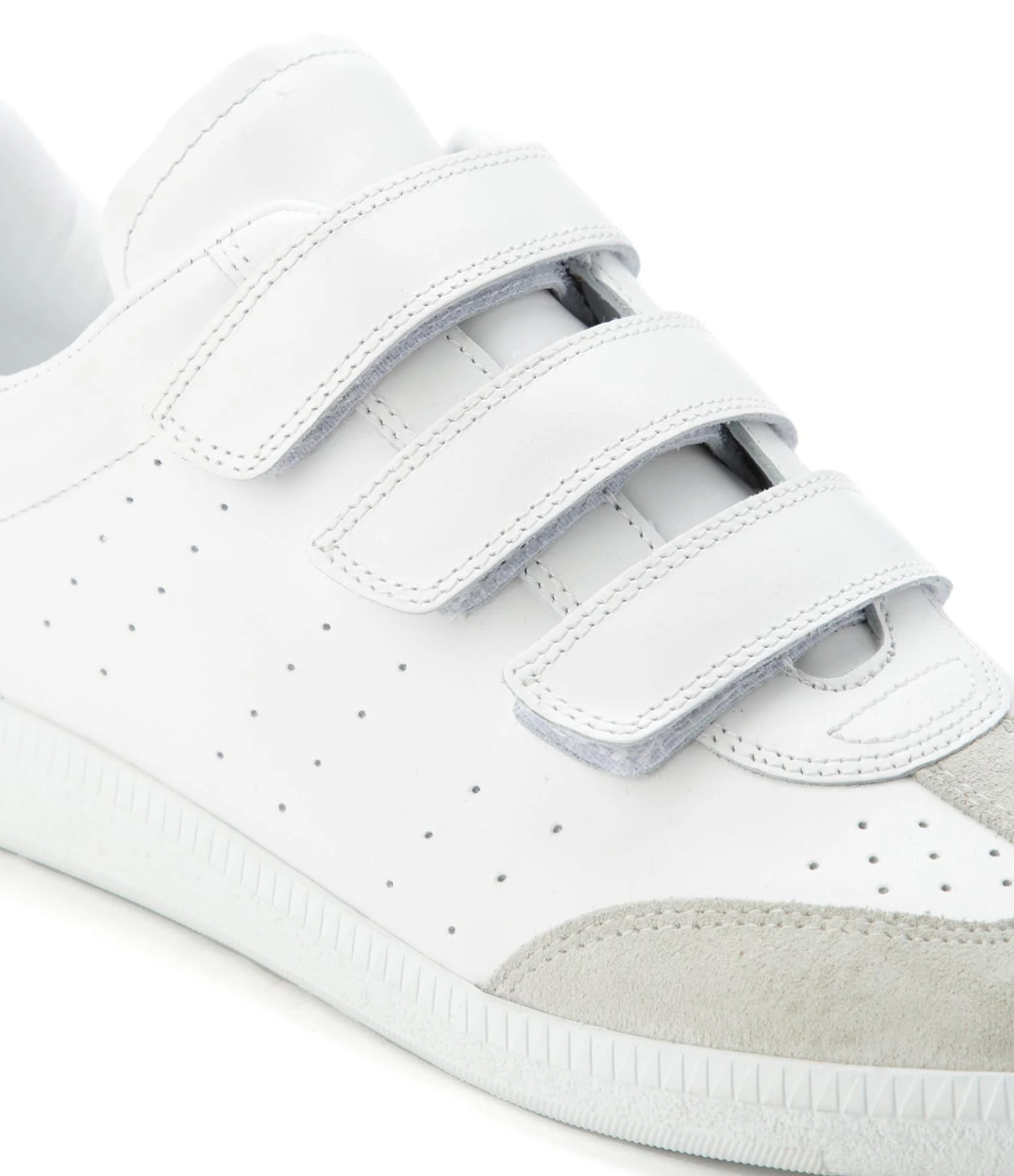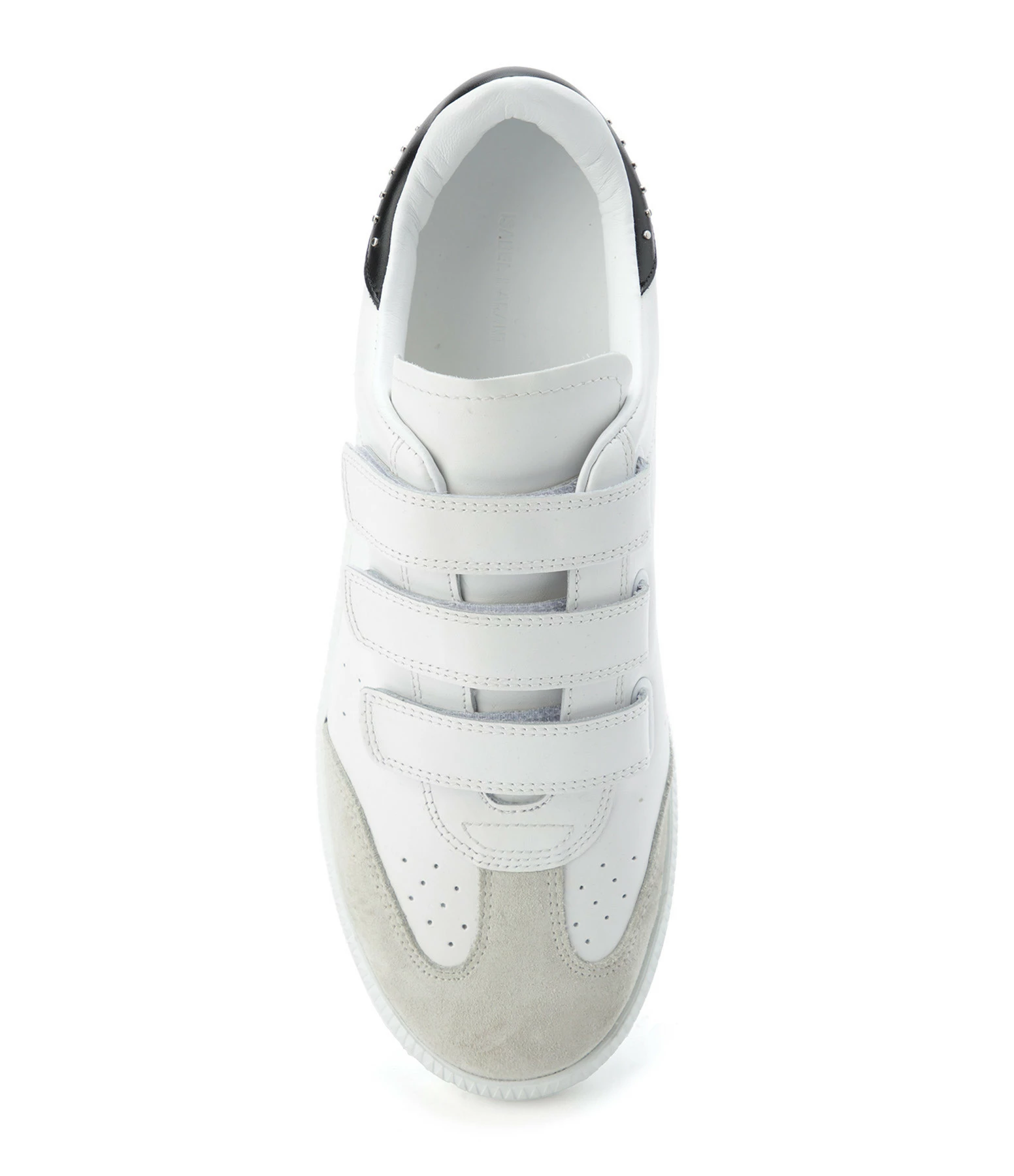 Basket basses en cuir lisse blanc perforé. Empiècement en cuir suédé gris sur l’avant et renfort talon en cuir lisse noir avec rivets métalliques avec inscription “ISABEL MARANT” en lettres argentées. Fermeture par trois scratchs.