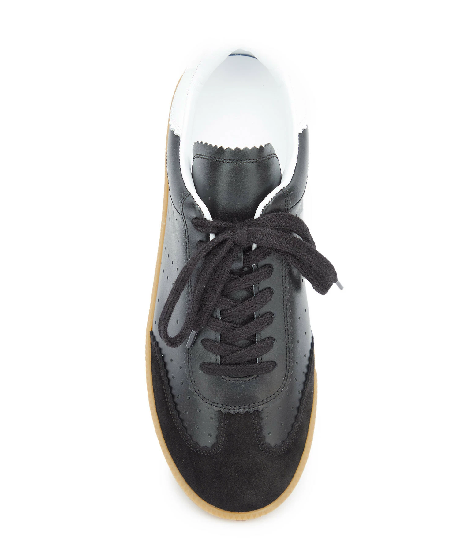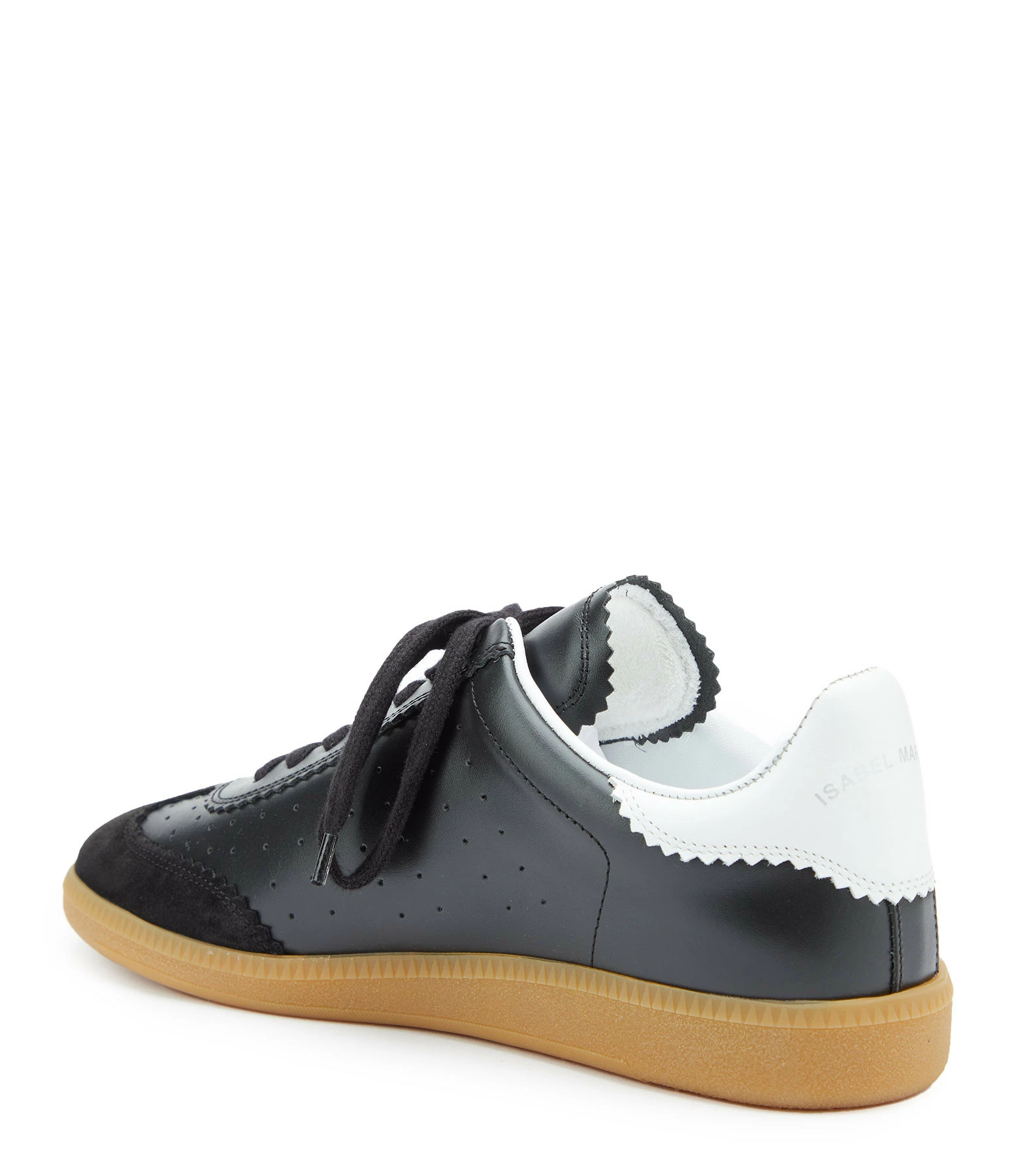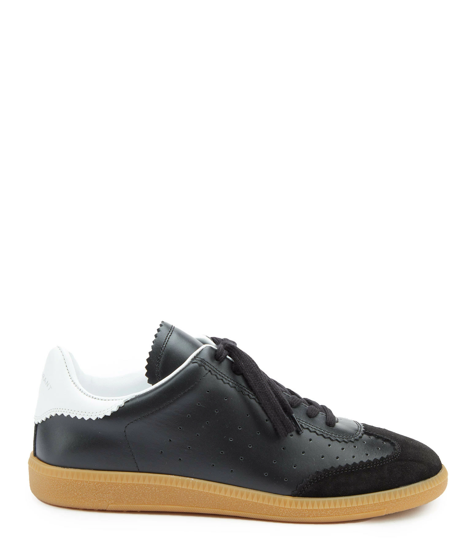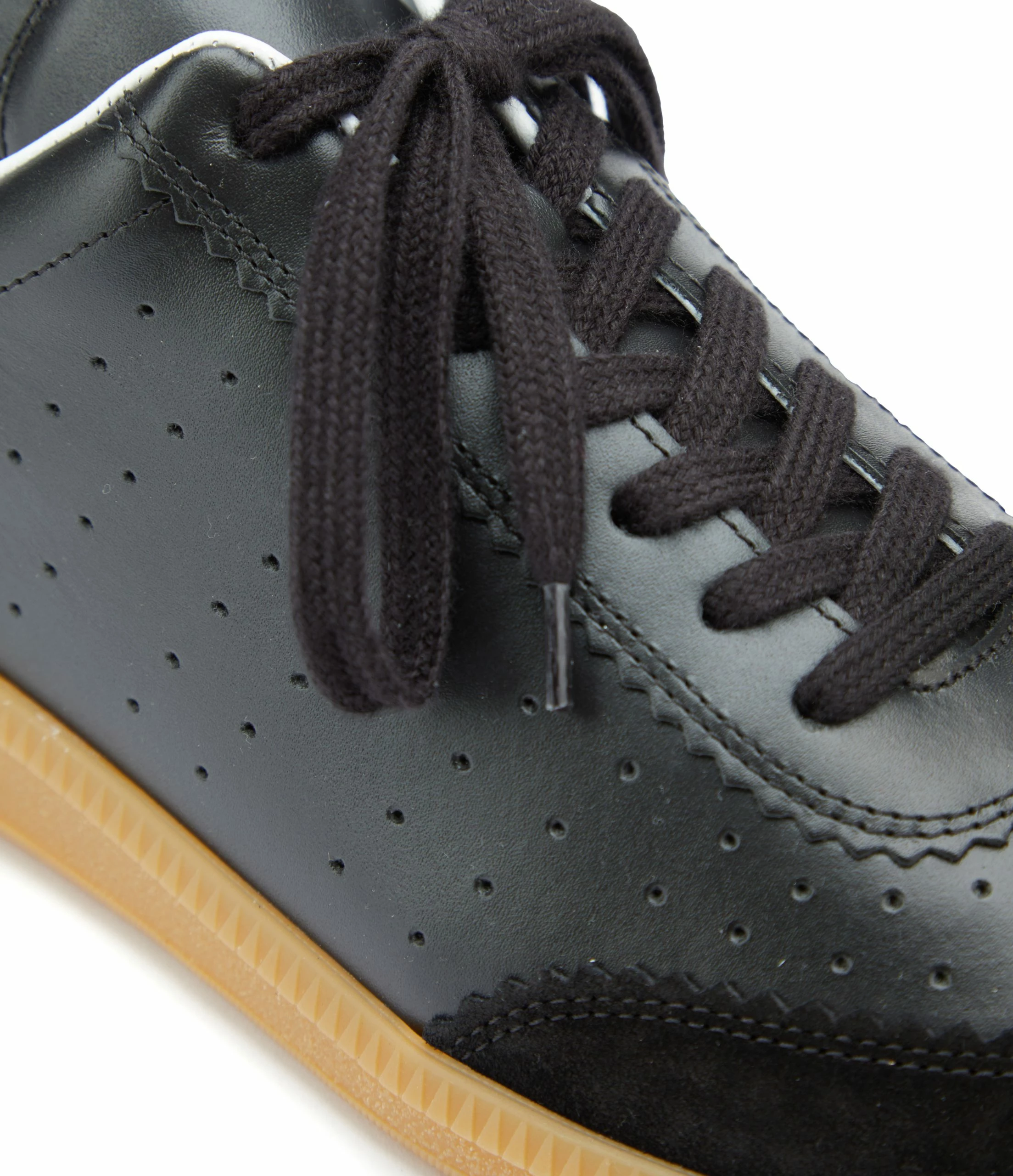 Baskets basses en cuir lisse noir et empiècement en cuir suédé noir. Renfort talon en cuir lisse blanc. Lacets noirs.