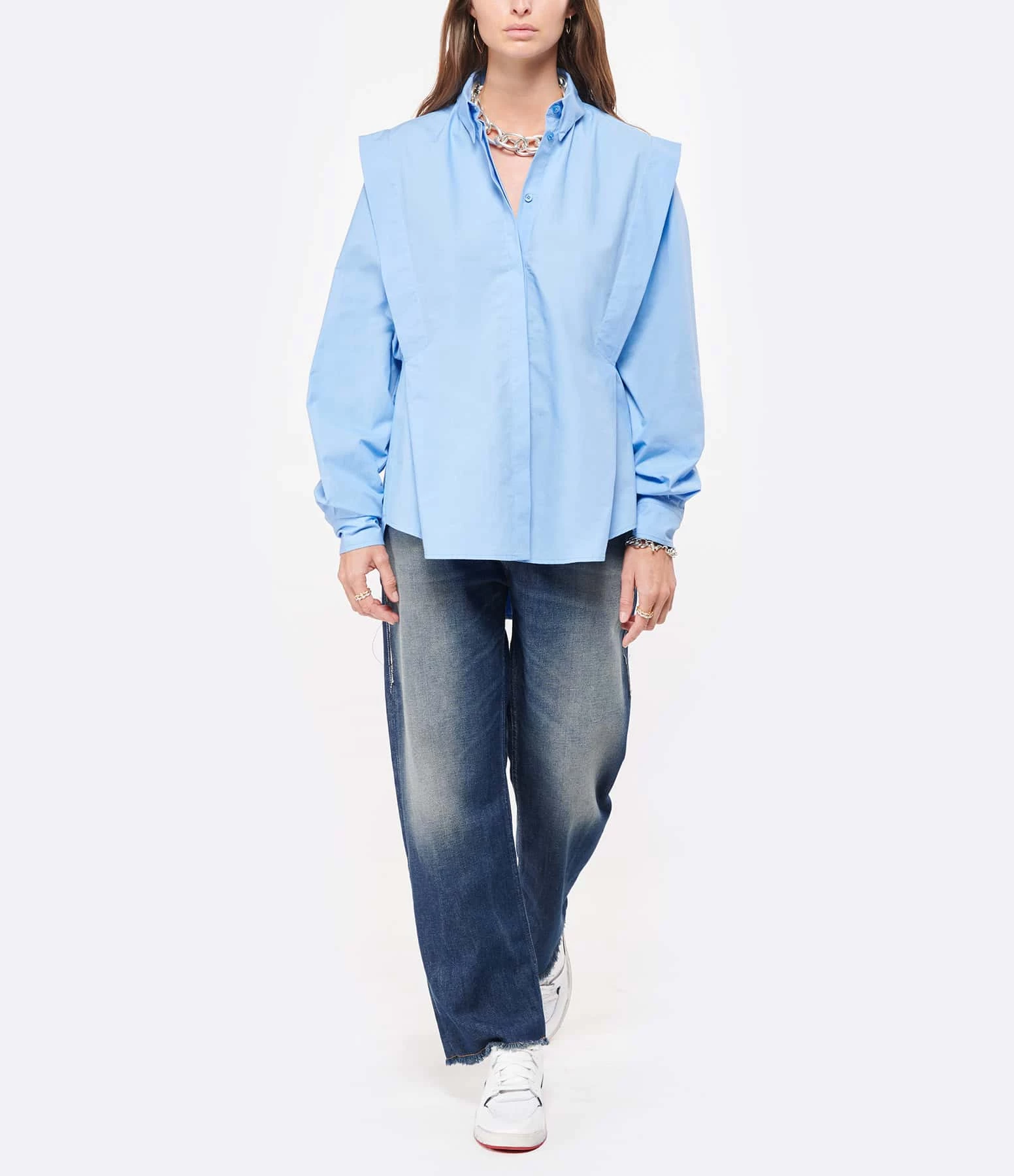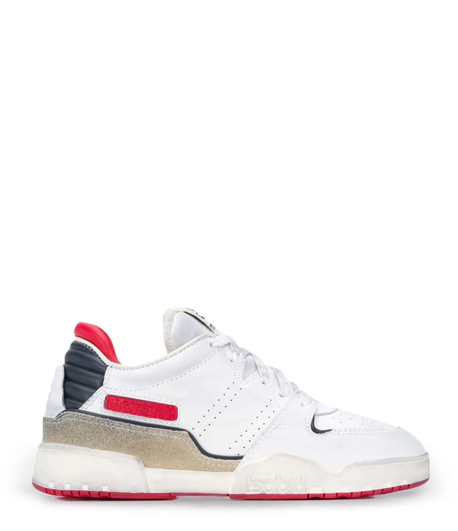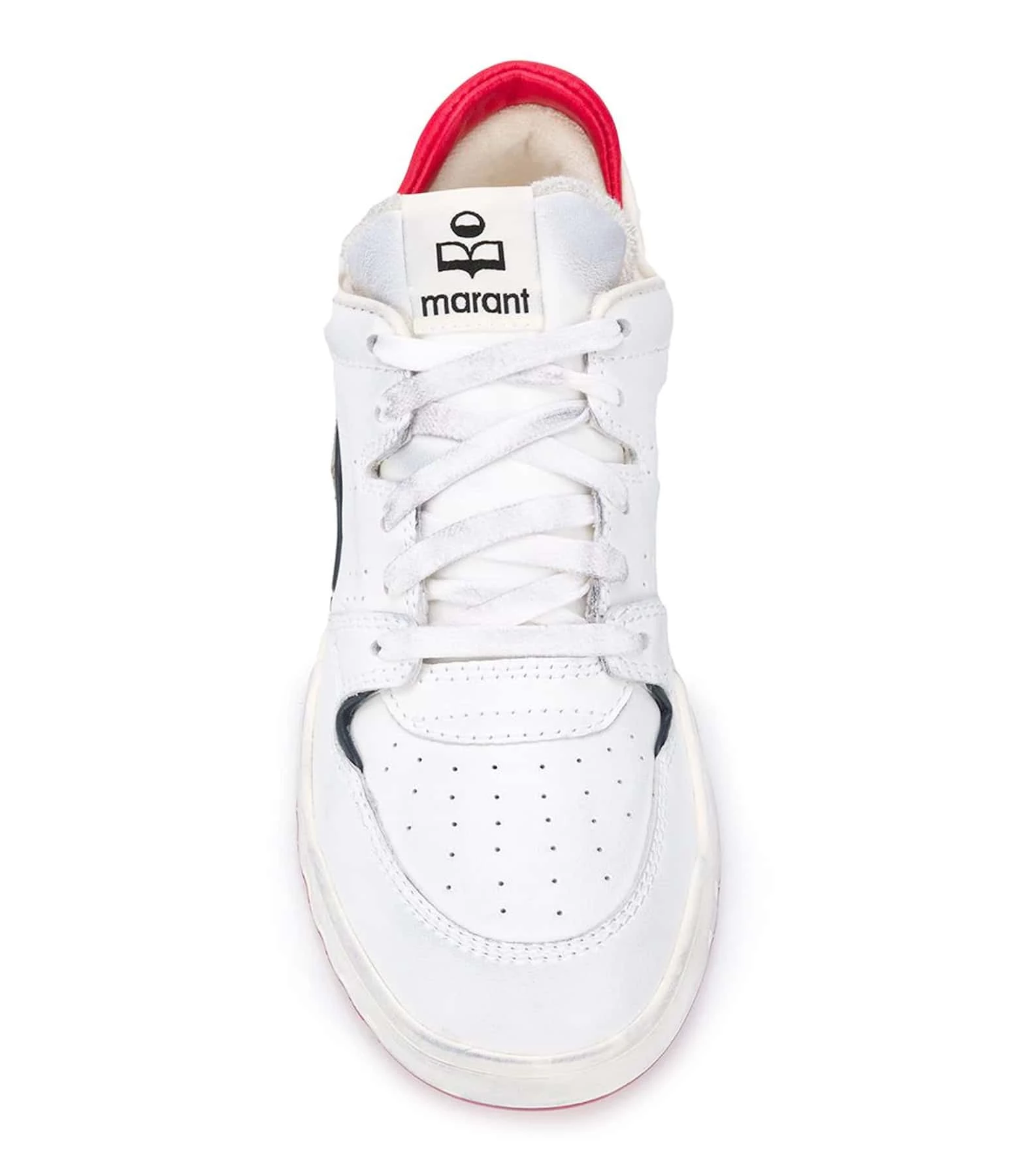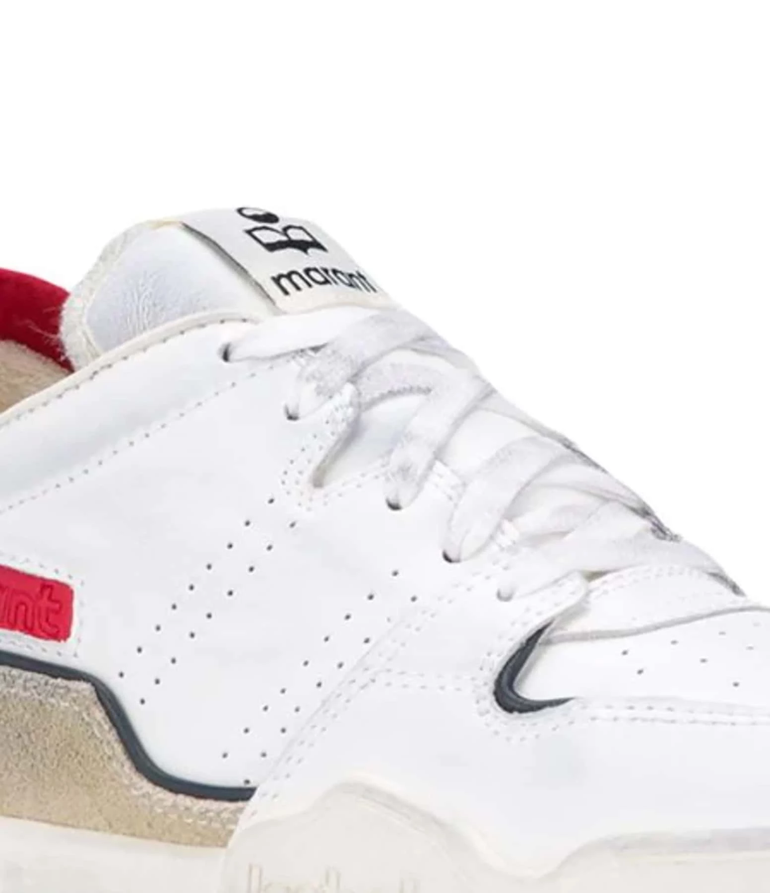 Baskets basses en cuir blanc. Détails rouges et bleus. Empiècements en cuir multi-matières. Logos “Isabel Marant” sur les côtés de la chaussure. Bout arrondi. Intérieur entièrement doublé. Effets usés et tâchés par endroits volontaires.