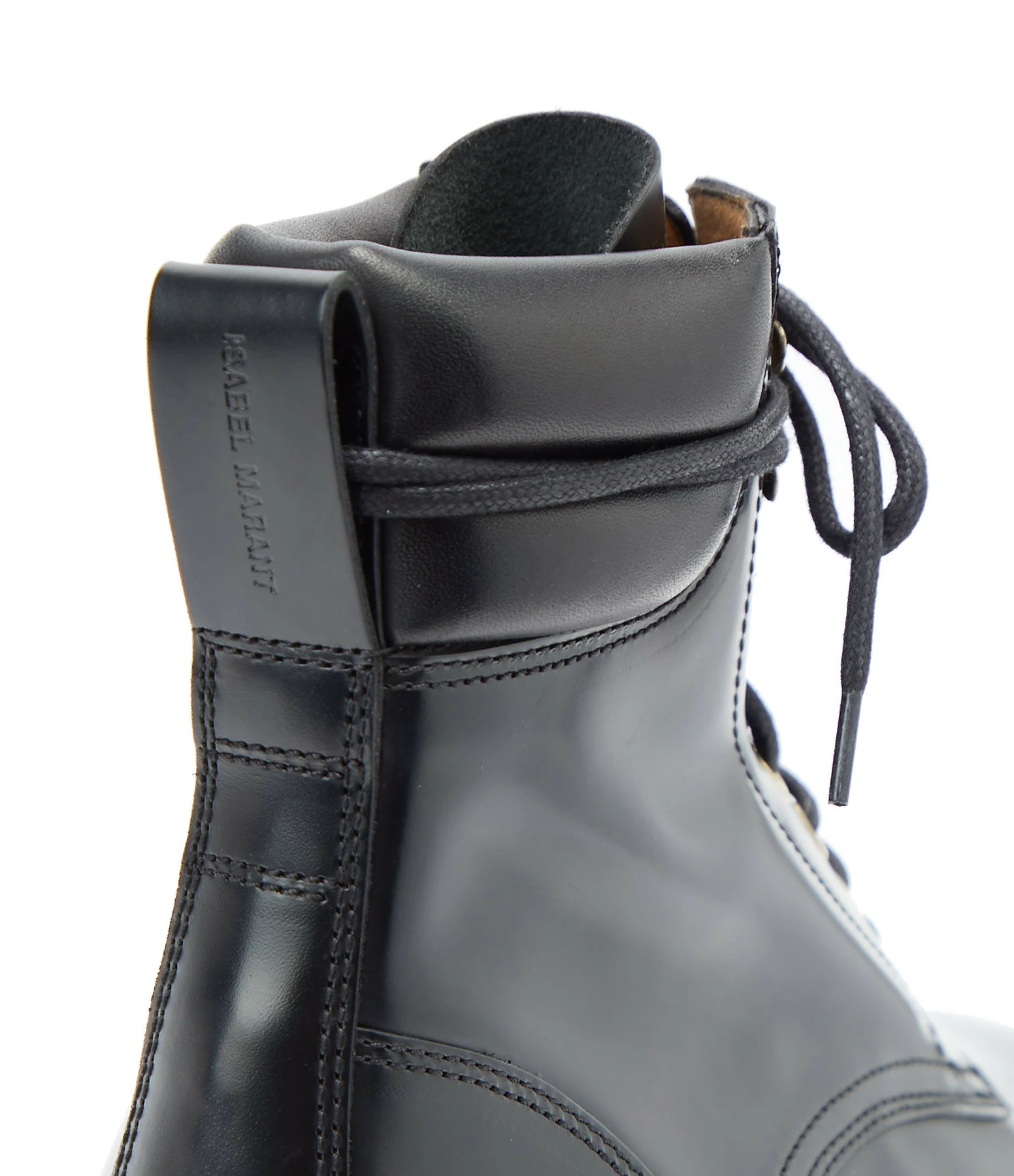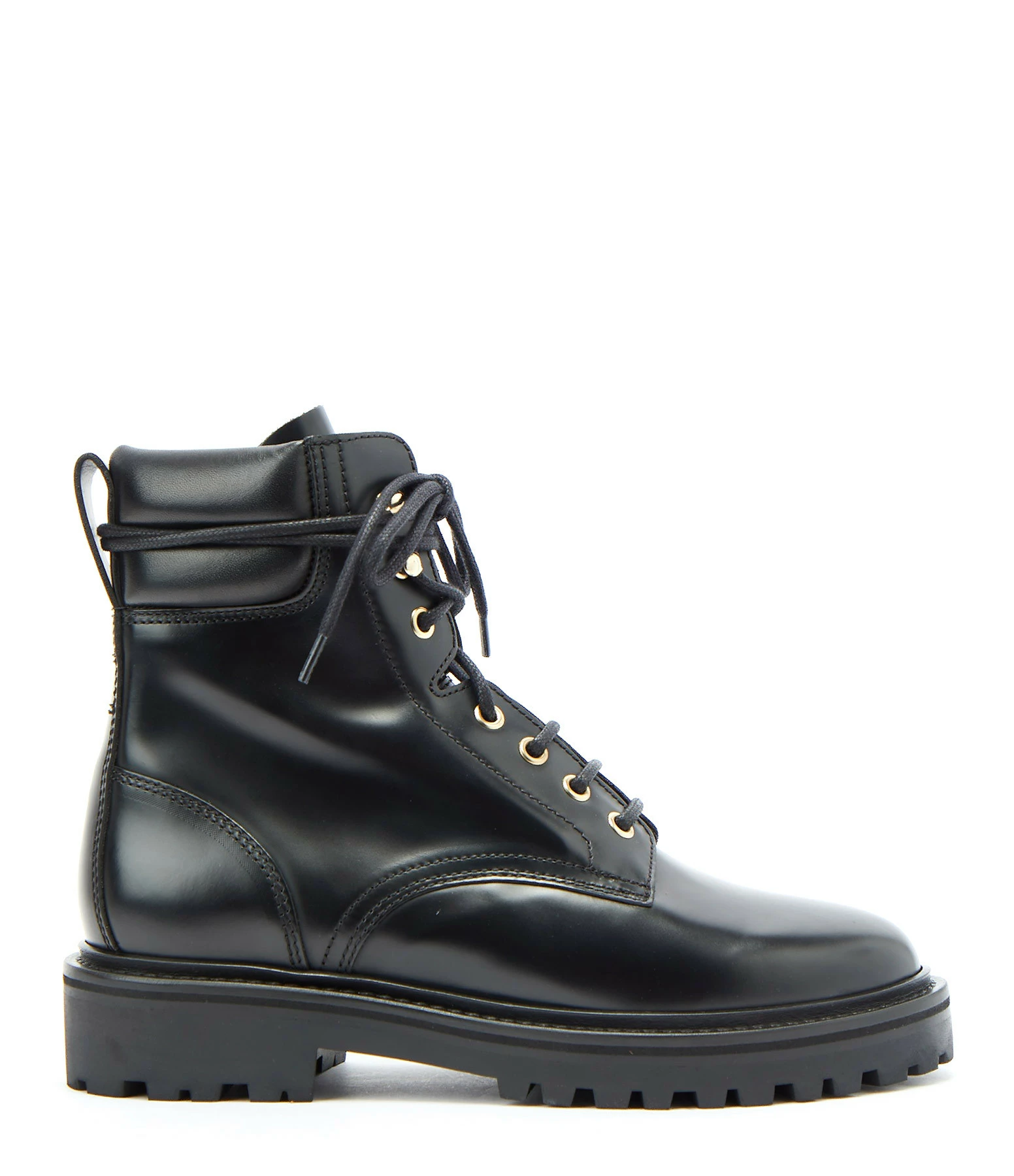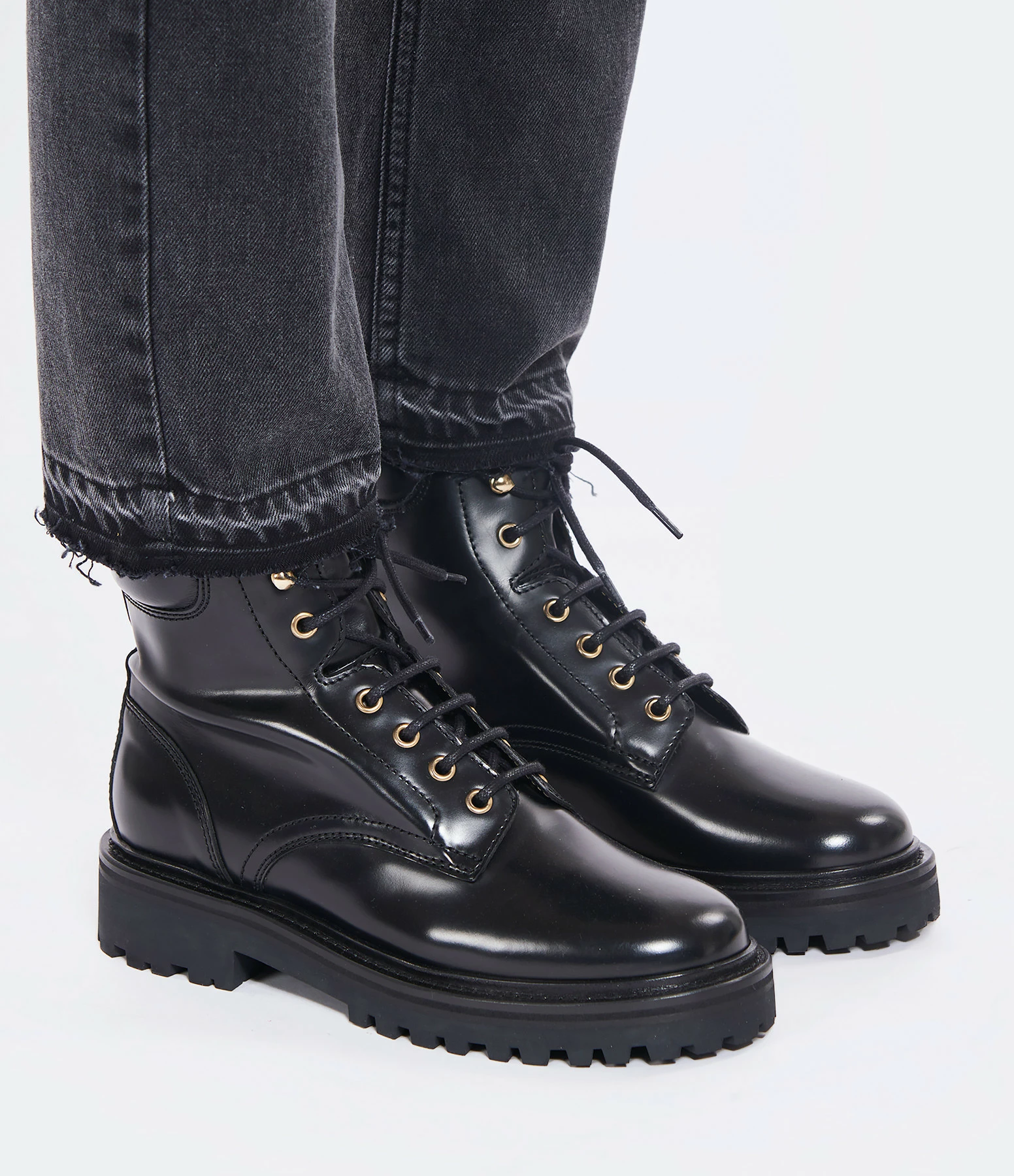 Bottines plates à lacets en cuir lisse noir, style rangers. Bouts ronds. Semelle épaisse et crantée.
