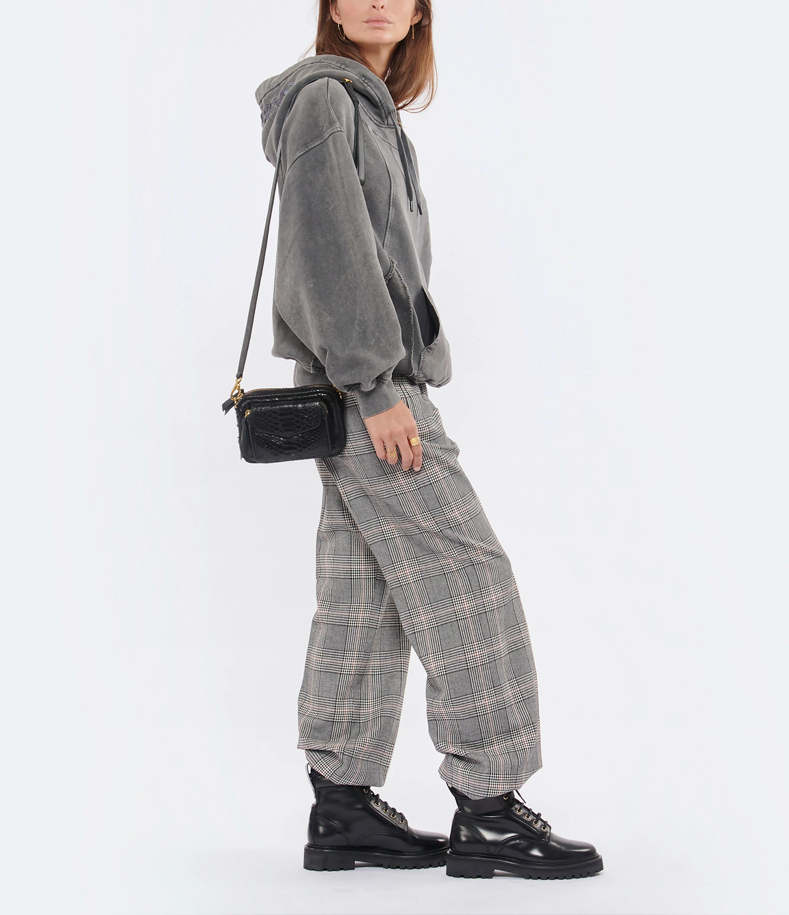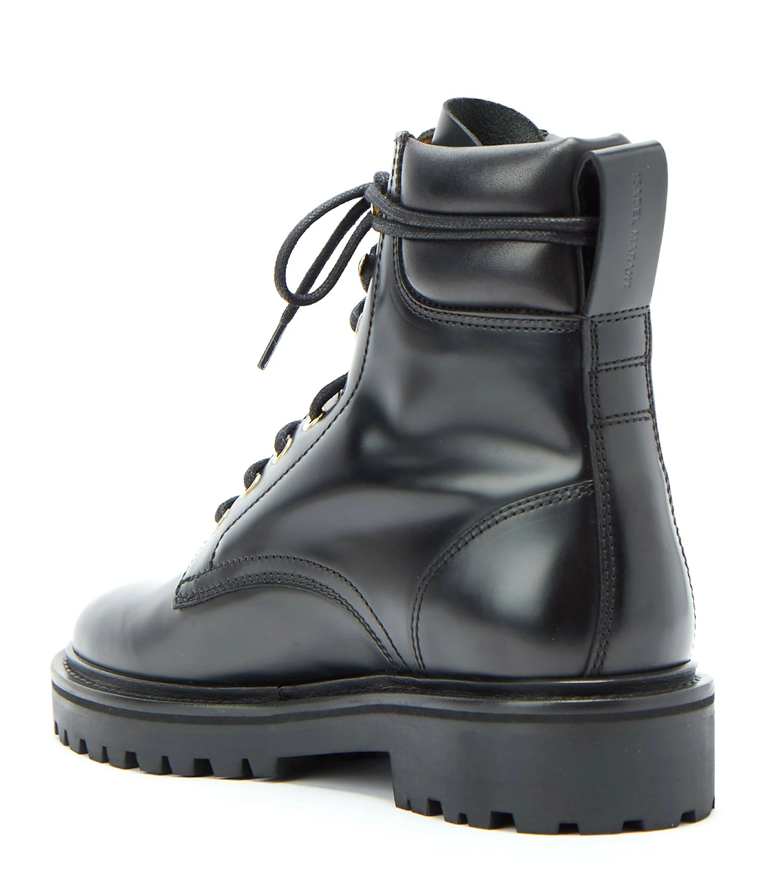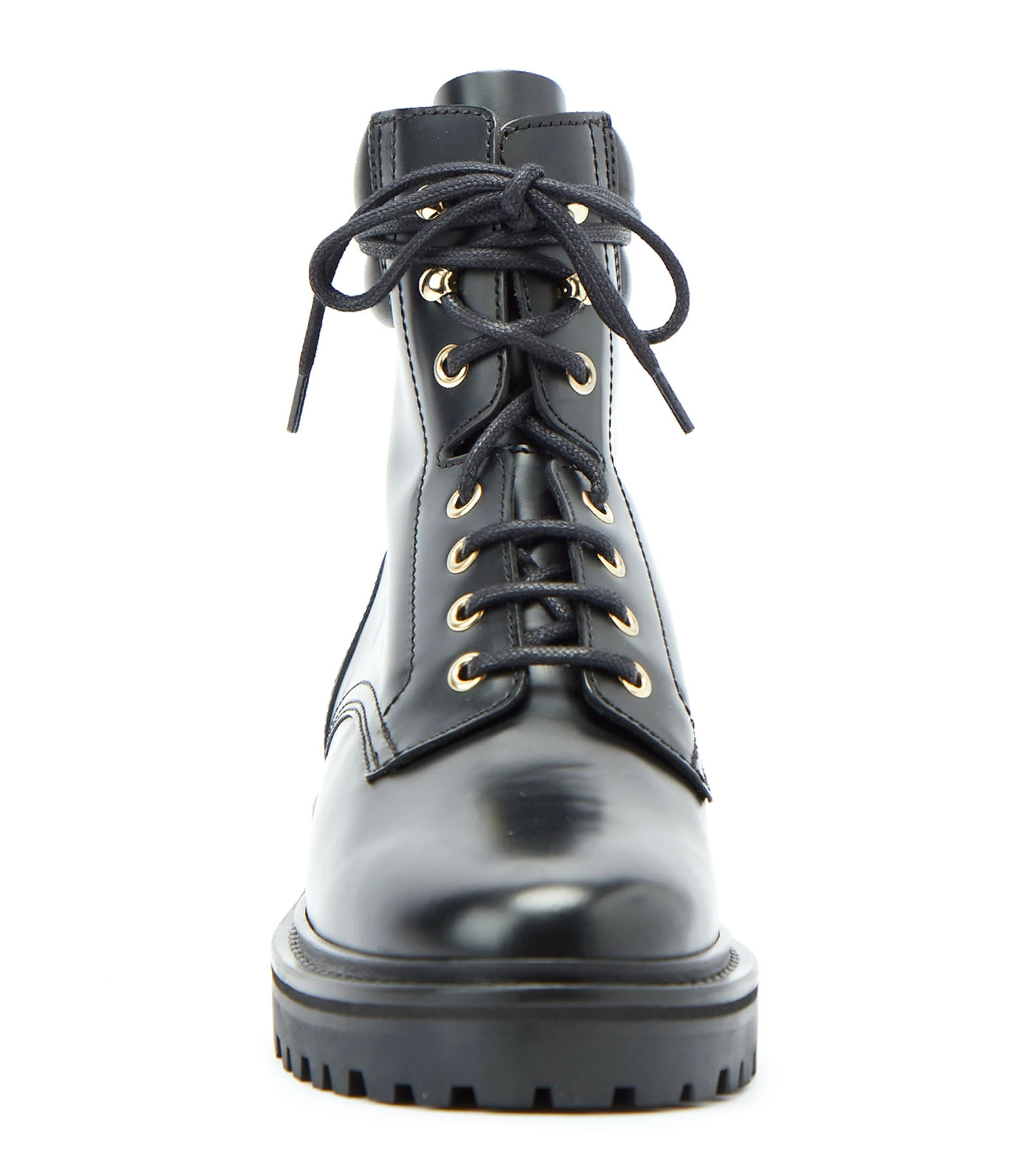 Bottines plates à lacets en cuir lisse noir, style rangers. Bouts ronds. Semelle épaisse et crantée.