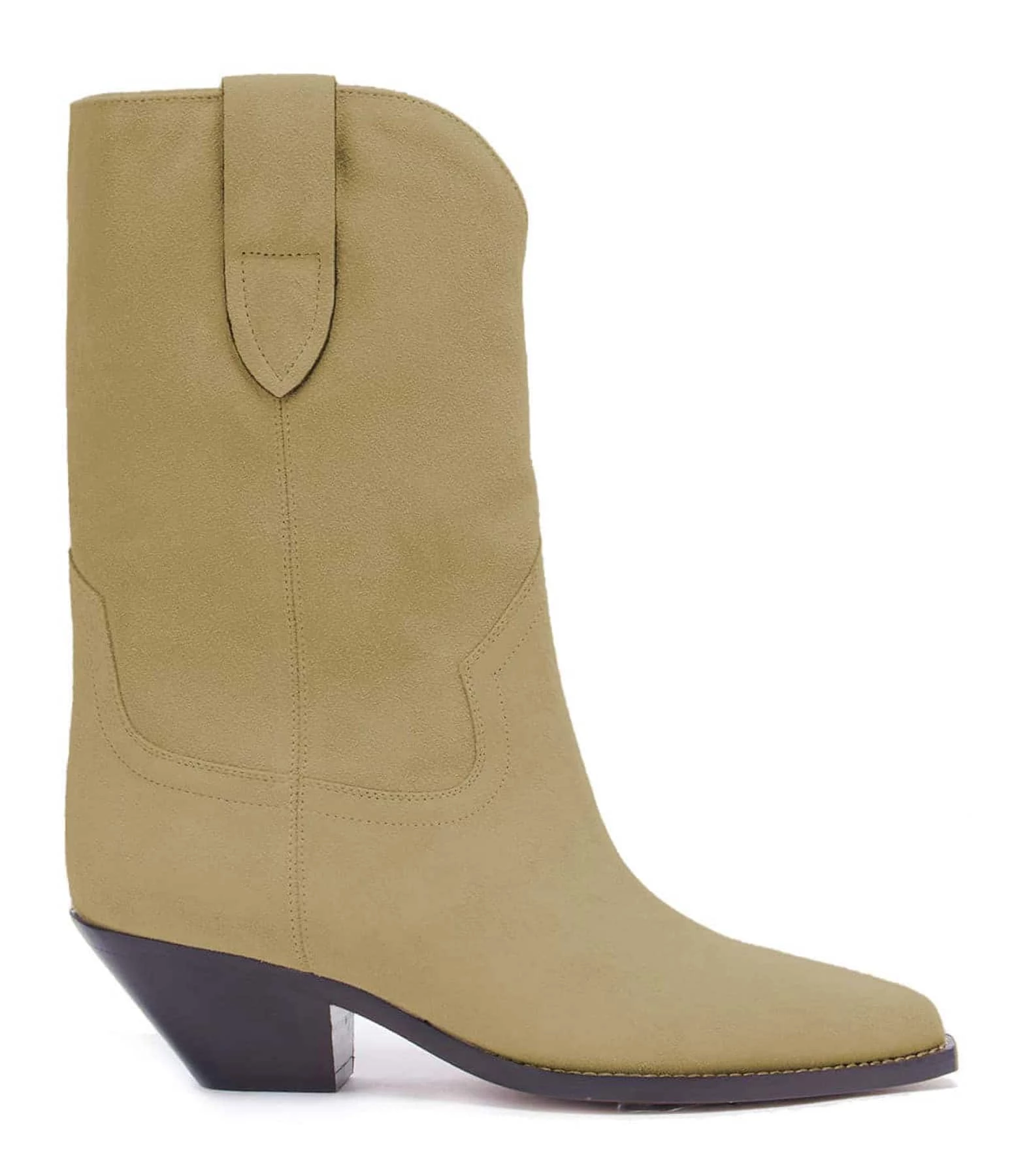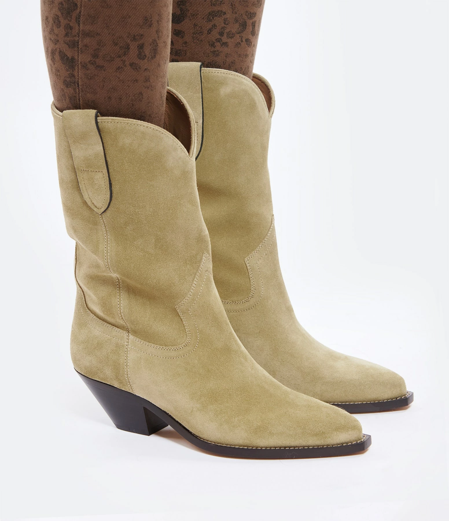 Bottes en cuir suédé beige, style western. Bouts pointus. Intérieur doublé en cuir lisse.