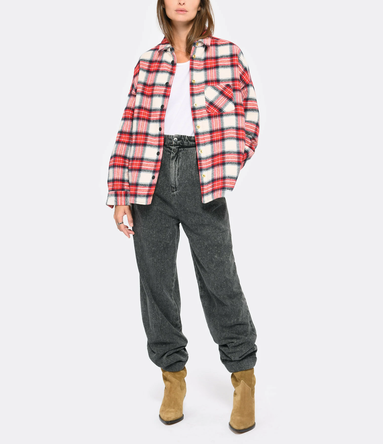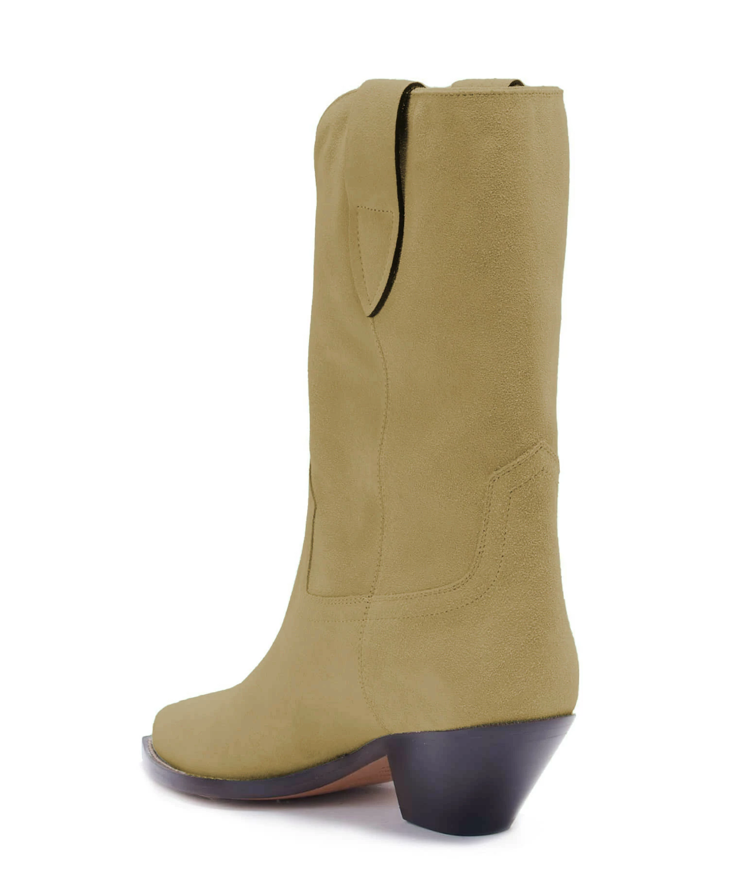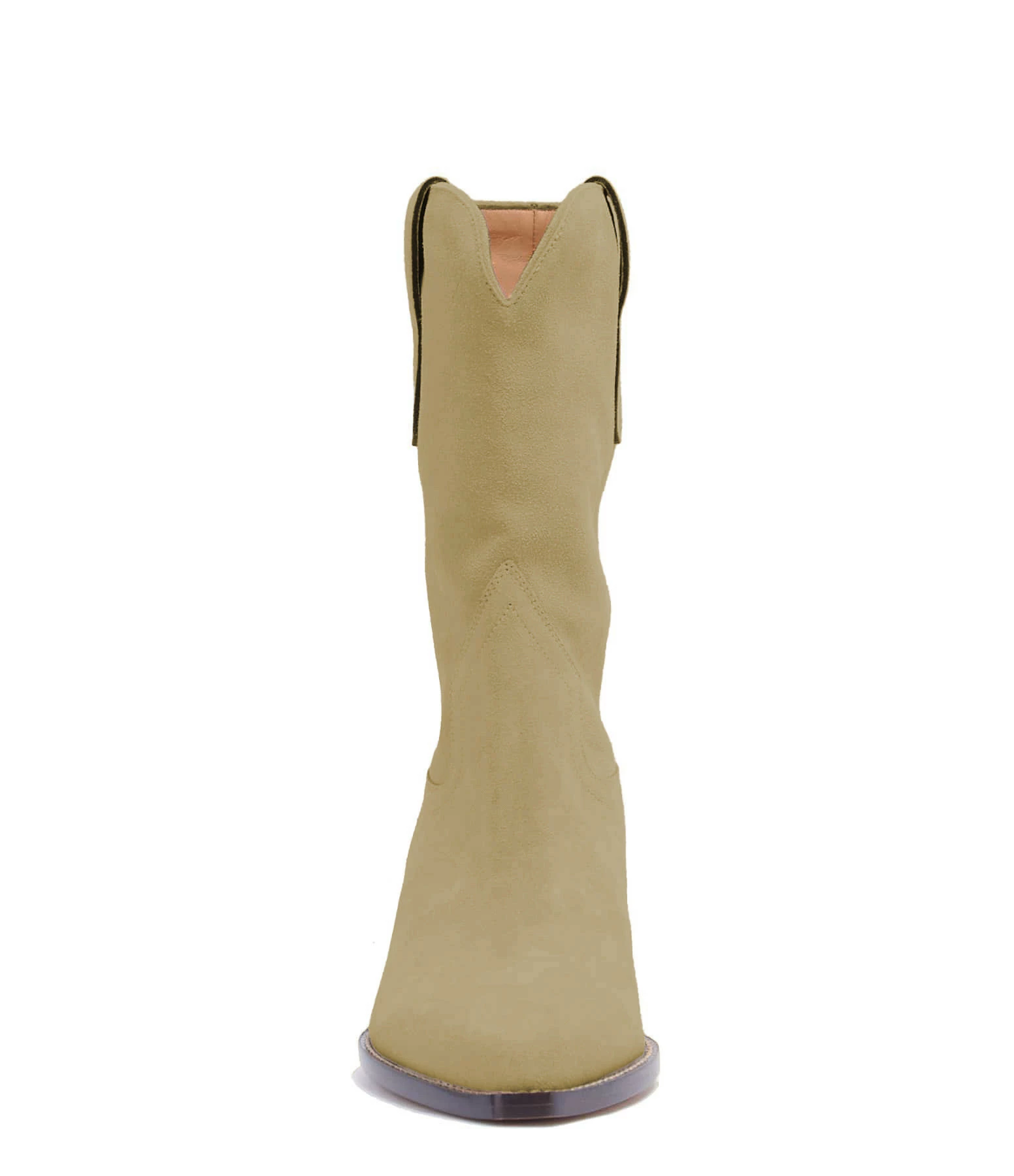 Bottes en cuir suédé beige, style western. Bouts pointus. Intérieur doublé en cuir lisse.