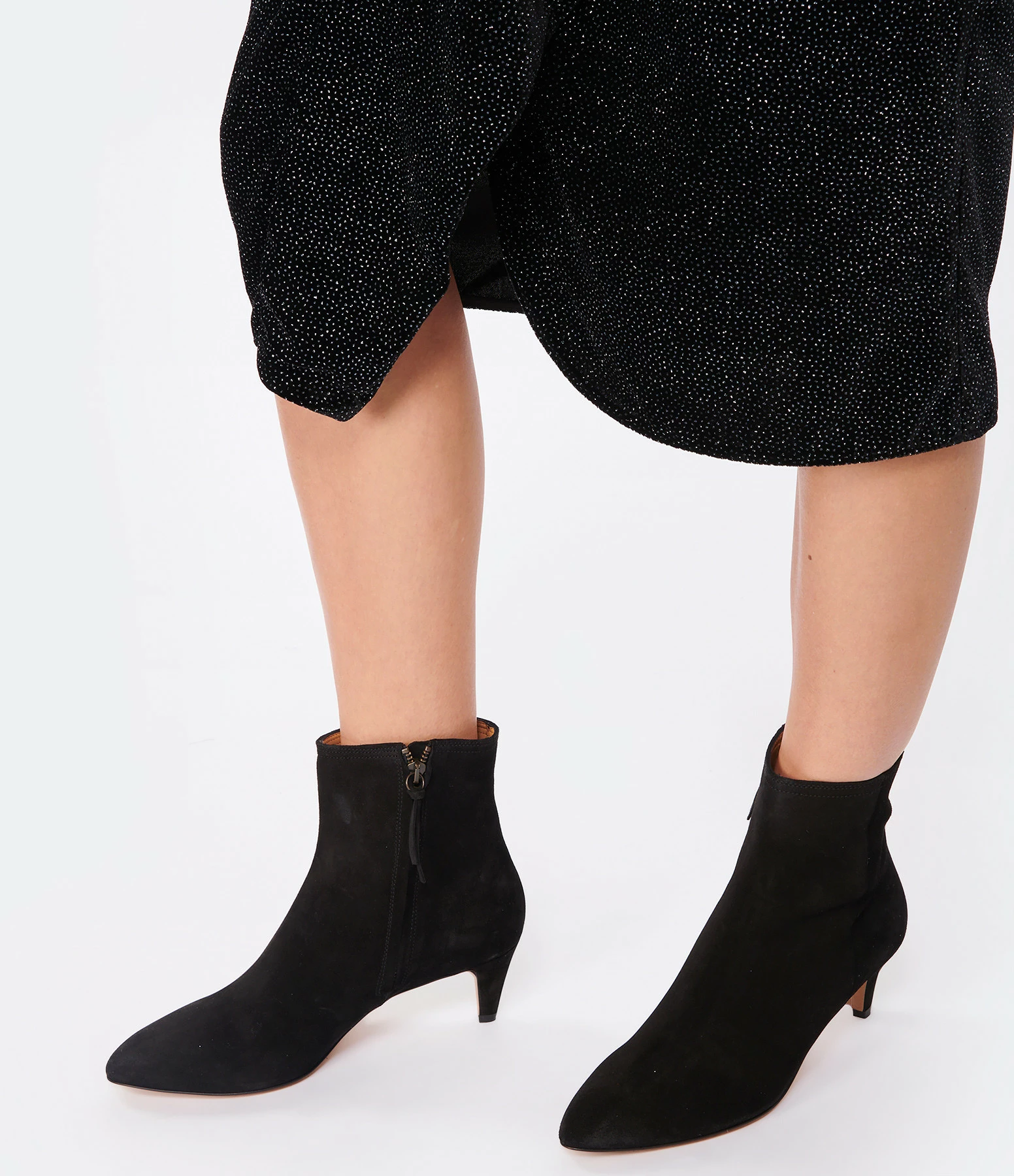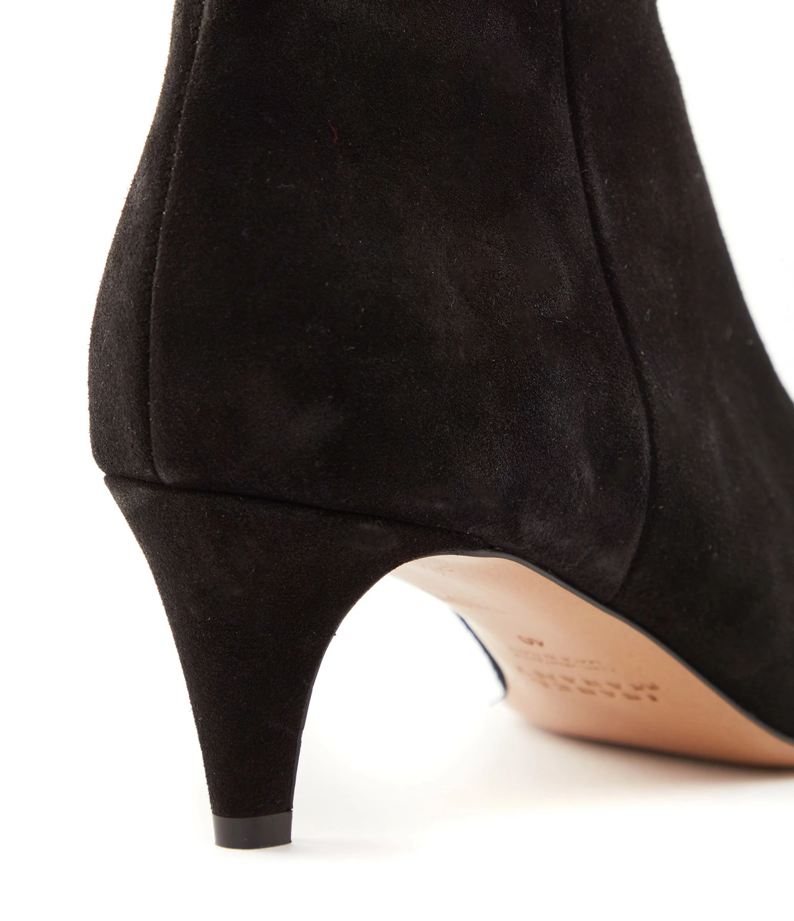 Bottines à talons en cuir suédé noir. Bouts pointus. Fermeture par zip sur le côté.