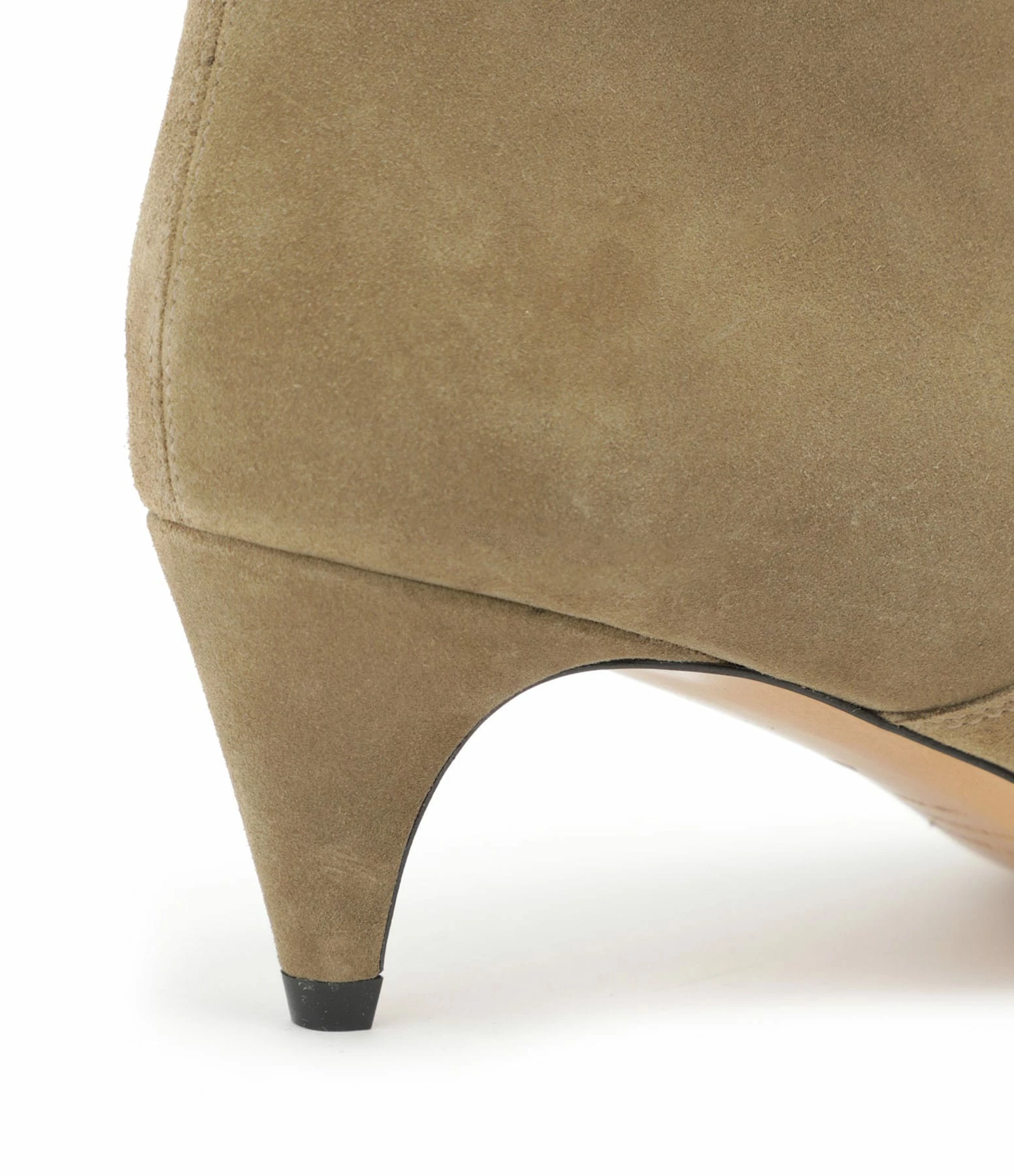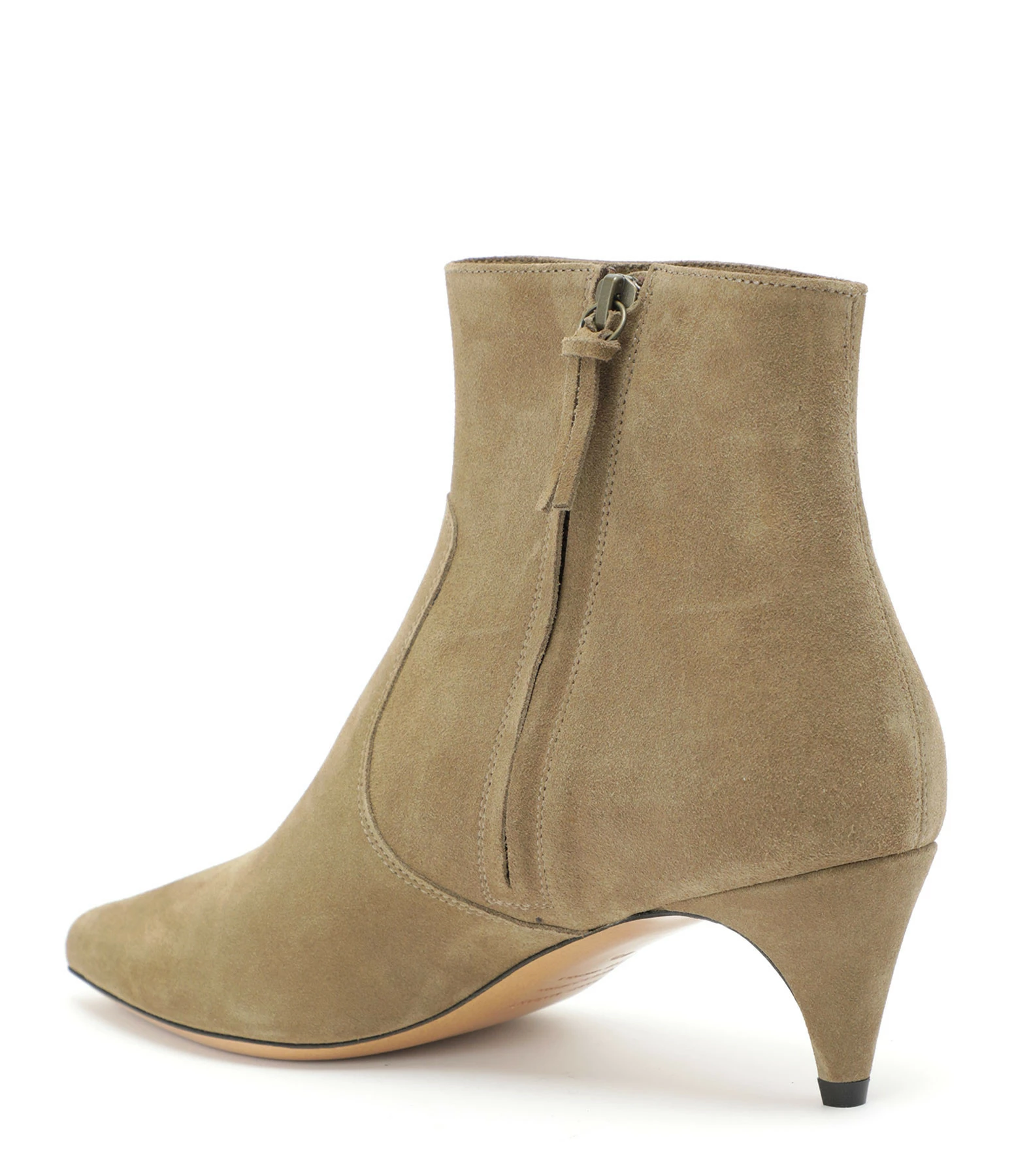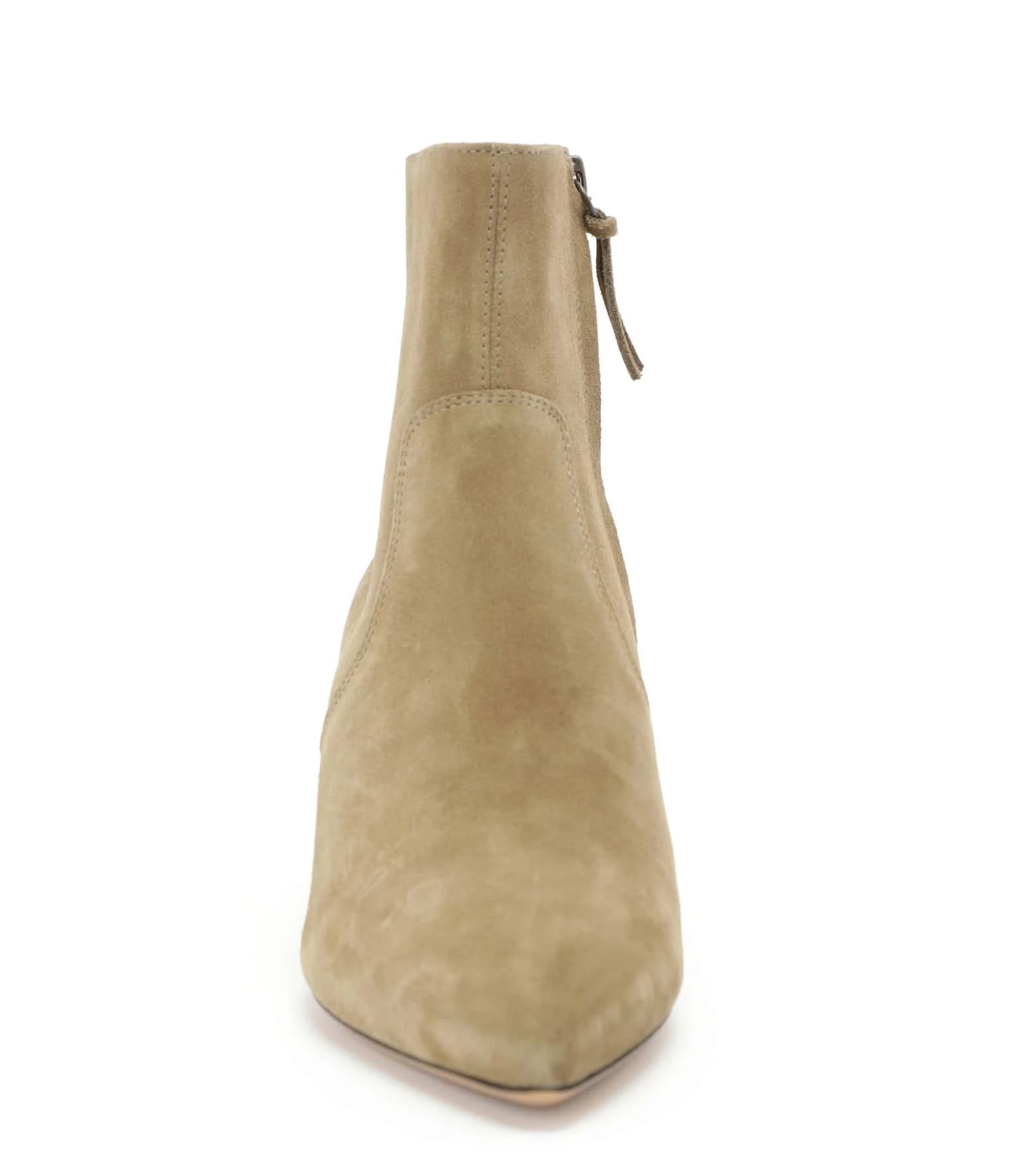 Bottines à talons en cuir velours taupe. Fermeture par un zip sur le coté. Intérieur doublé en cuir lisse. Bouts pointus.