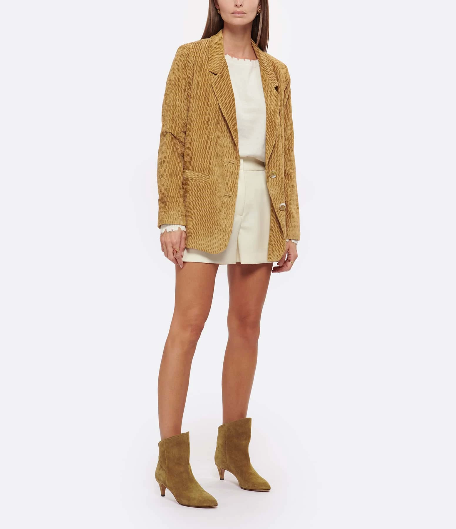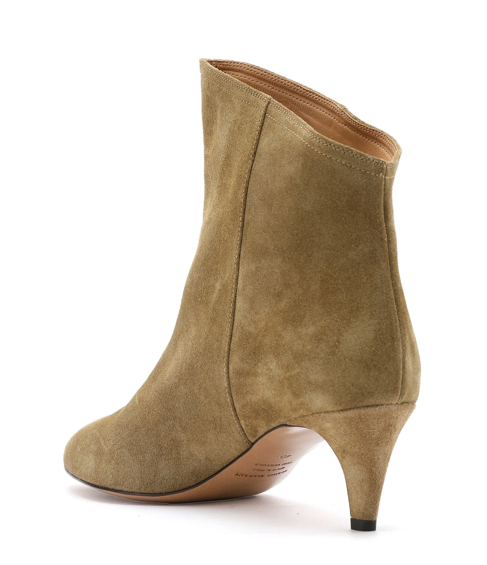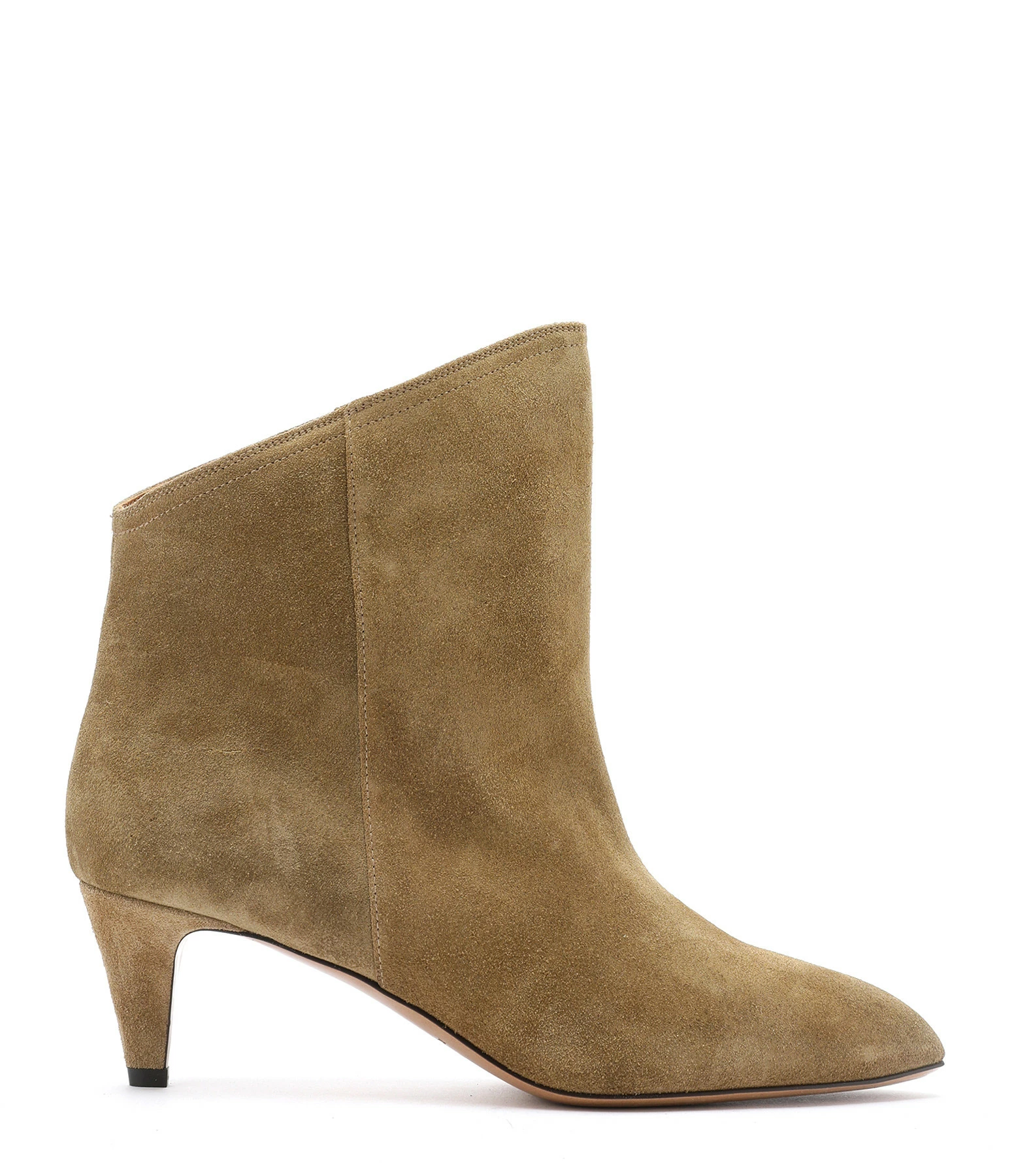 Bottines à talons en cuir velours Taupe. Découpe en diagonale. Intérieur doublé en cuir lisse. Bouts pointus.