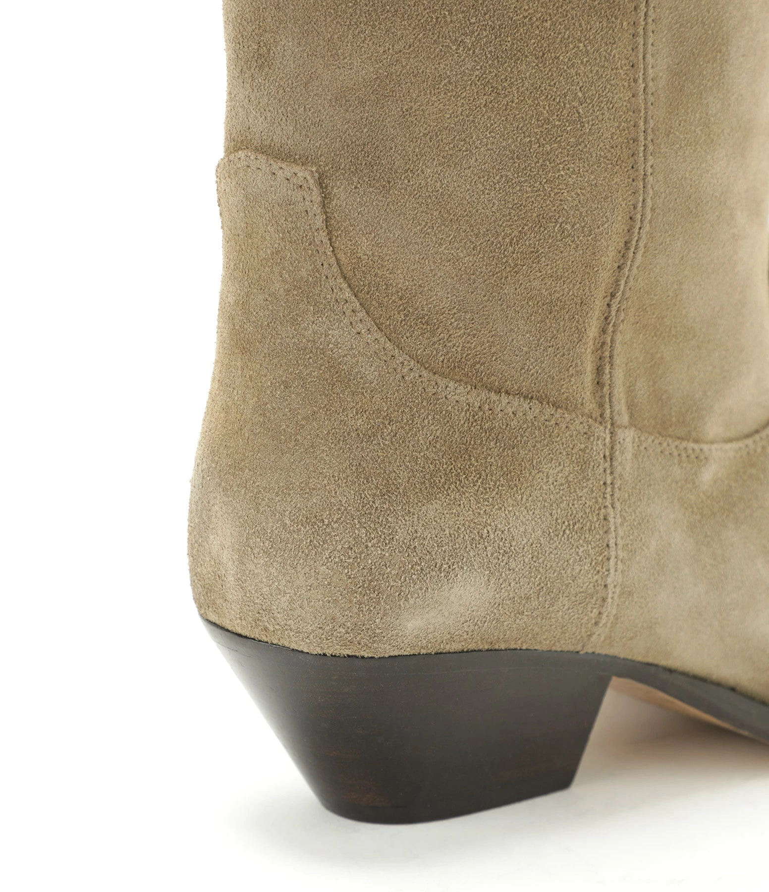 Bottines en cuir suédé taupe, style western. Bouts pointus. Effets usés par endroits volontaires. Intérieur doublé en cuir lisse.