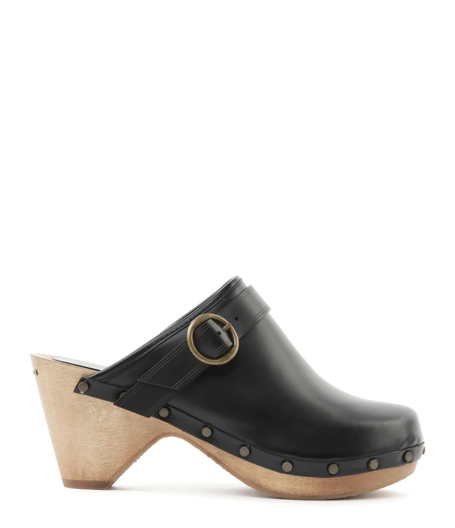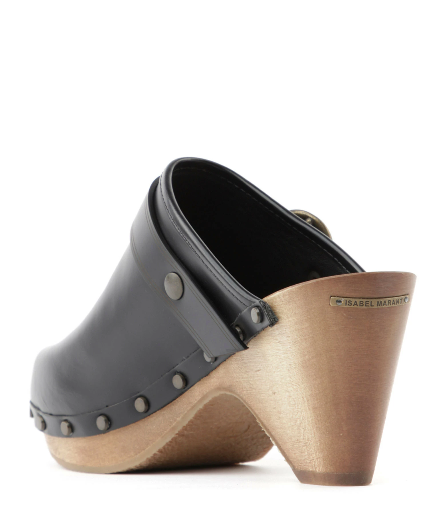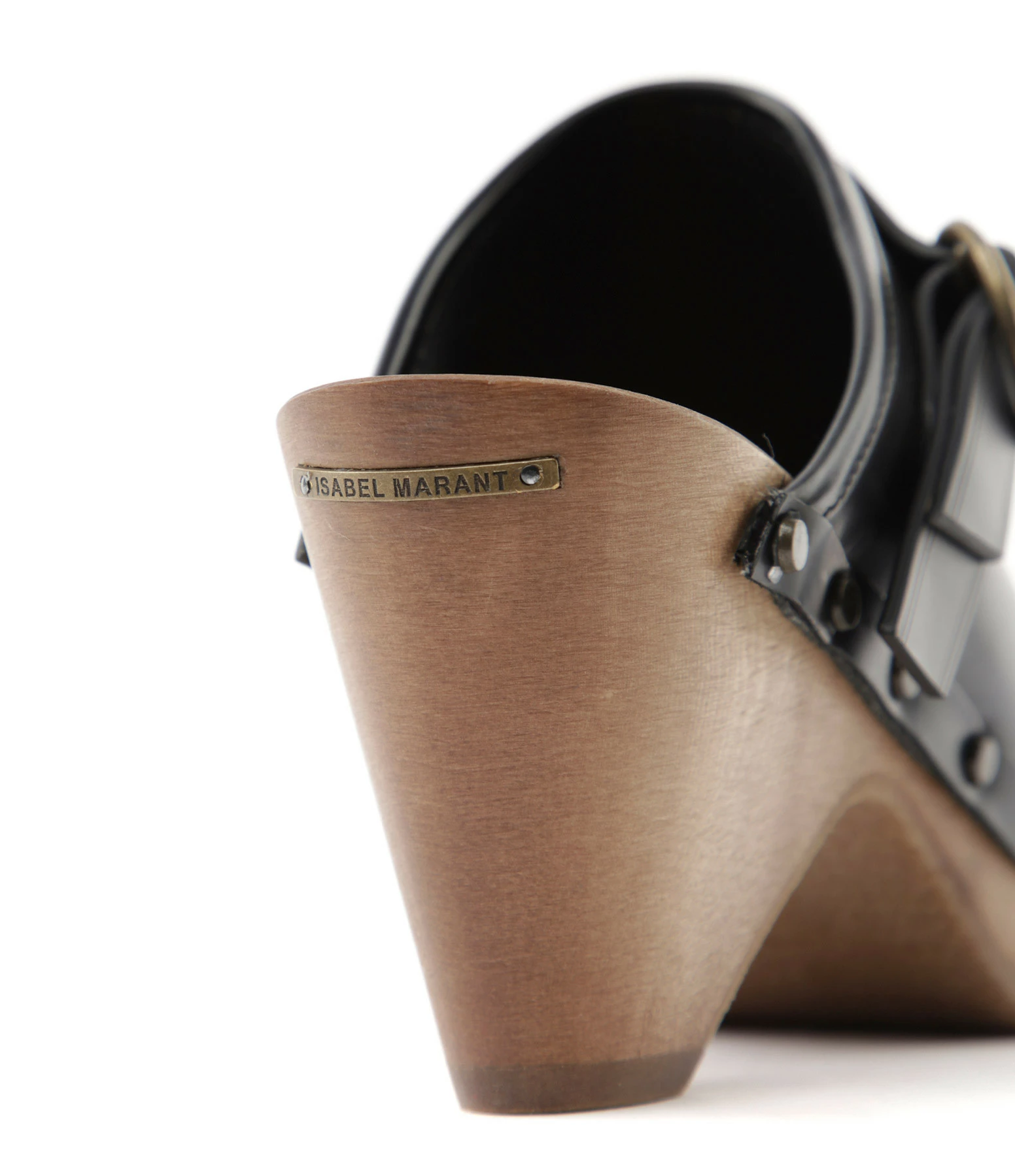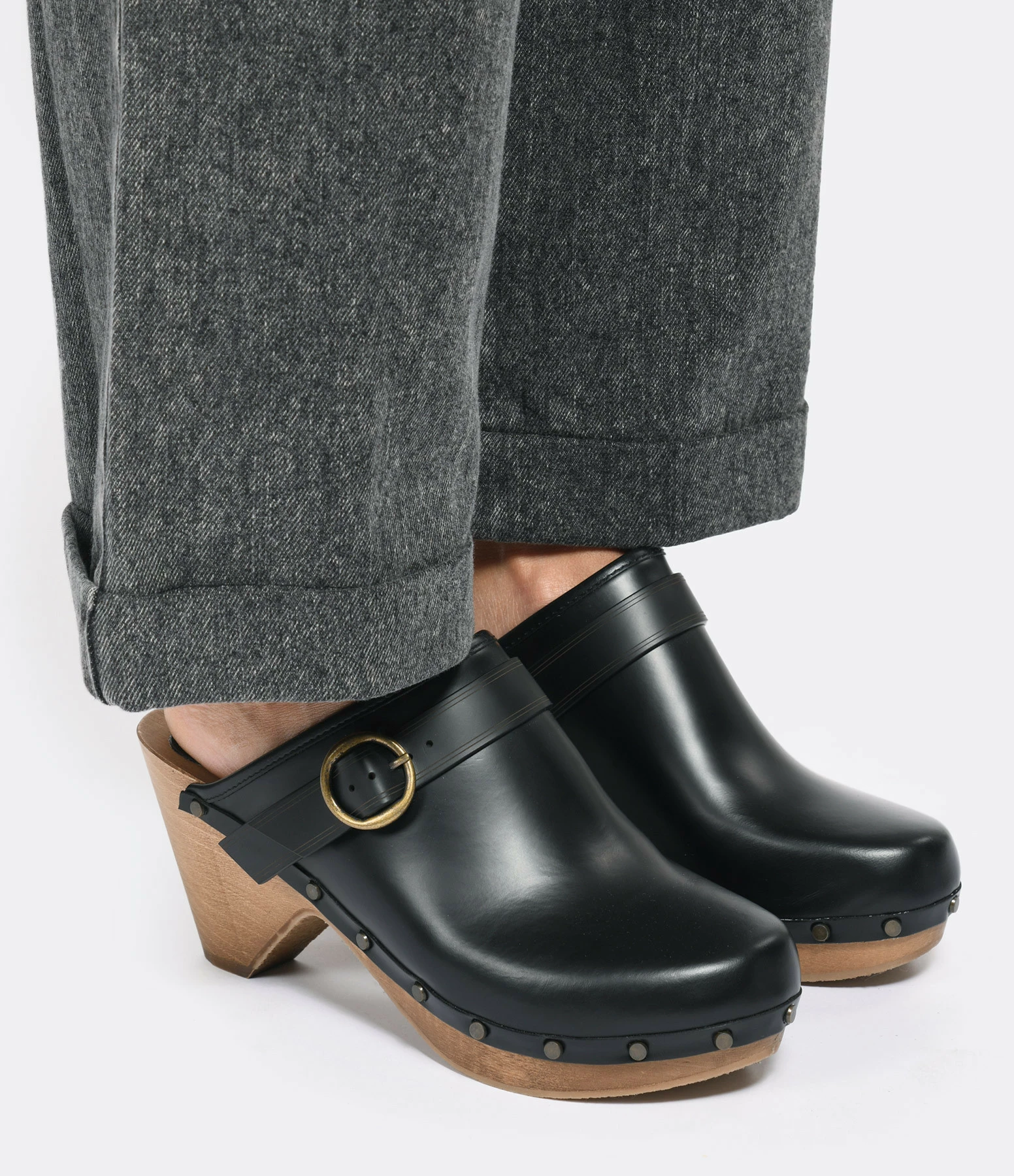 Sabots en cuir noir. Bride sur le devant. Talons en bois.