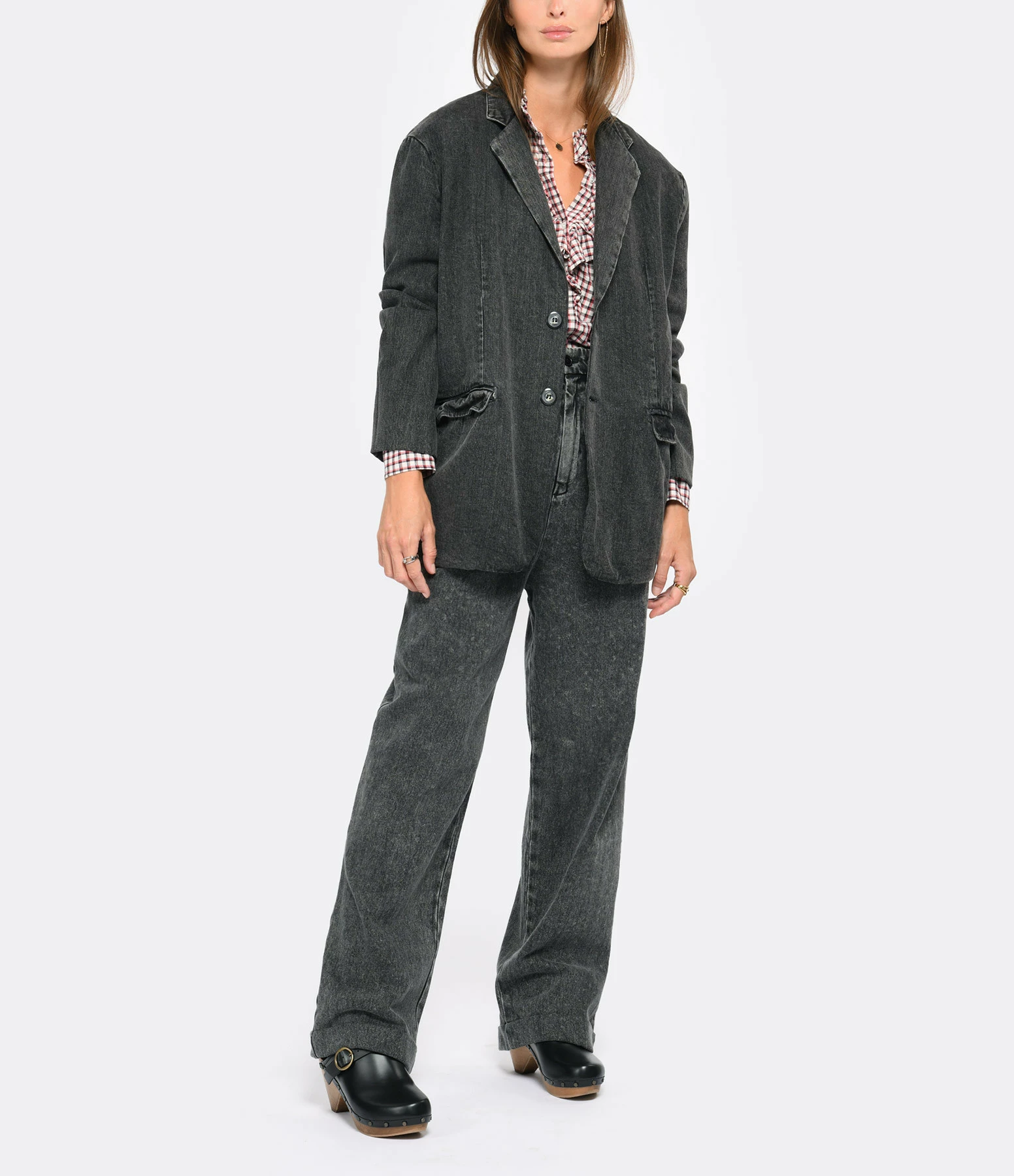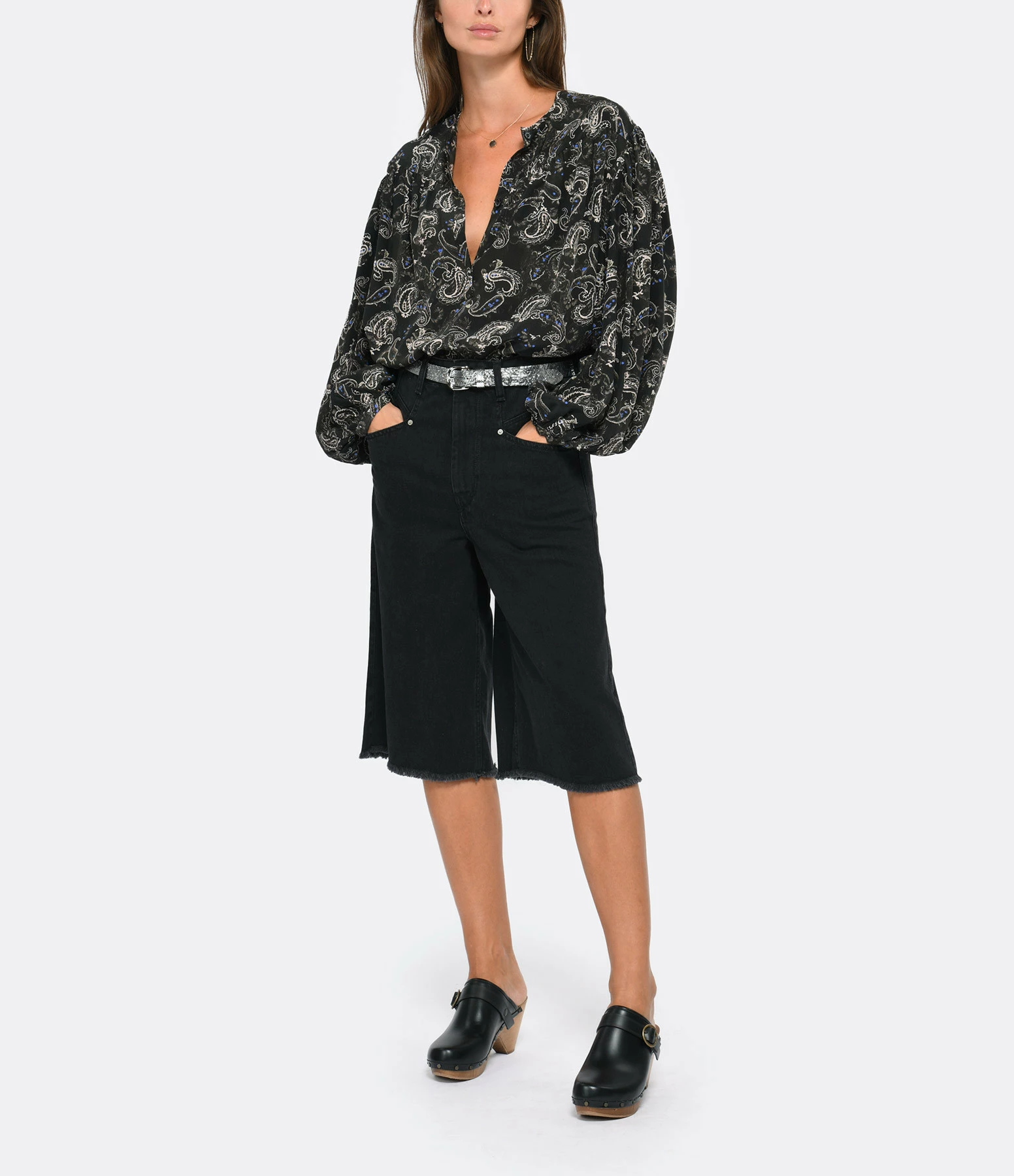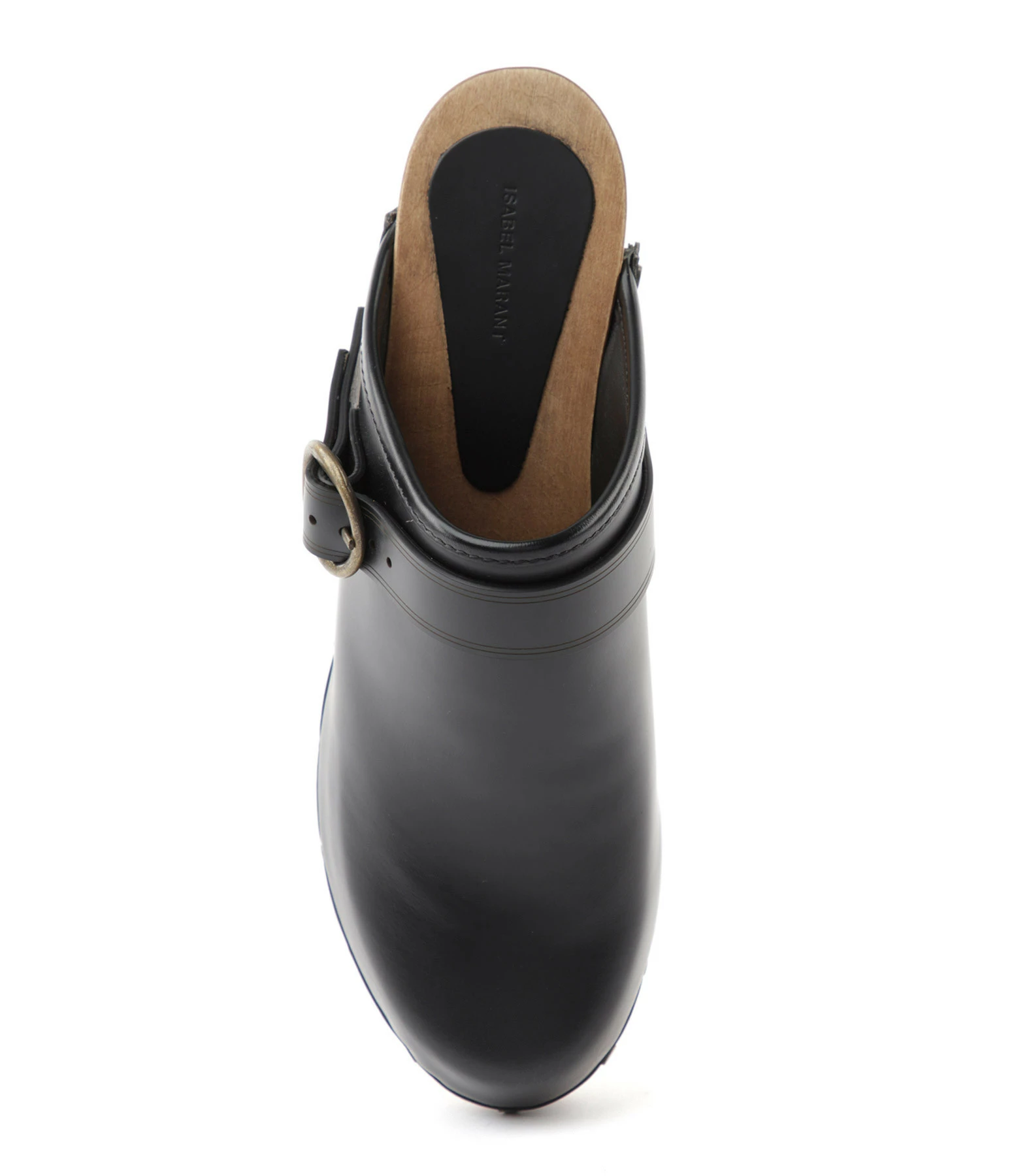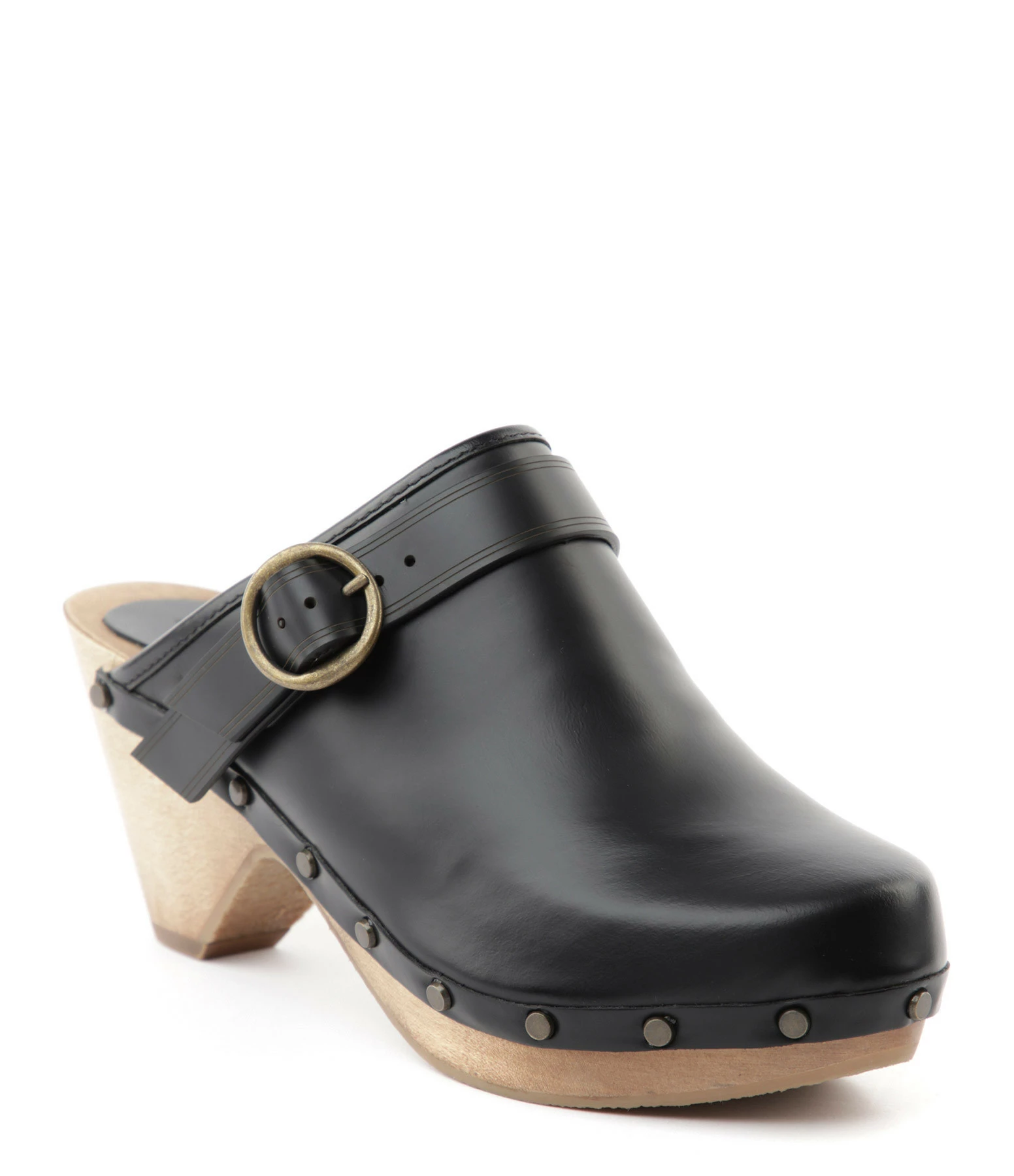 Sabots en cuir noir. Bride sur le devant. Talons en bois.