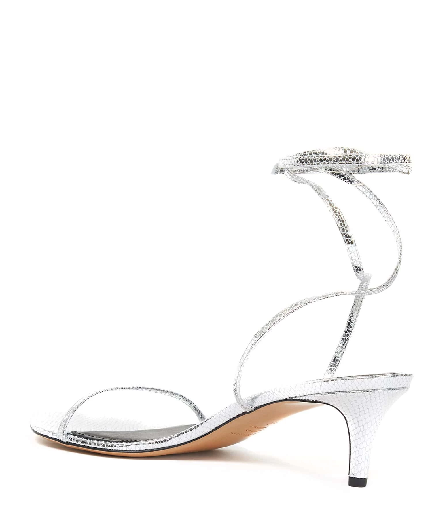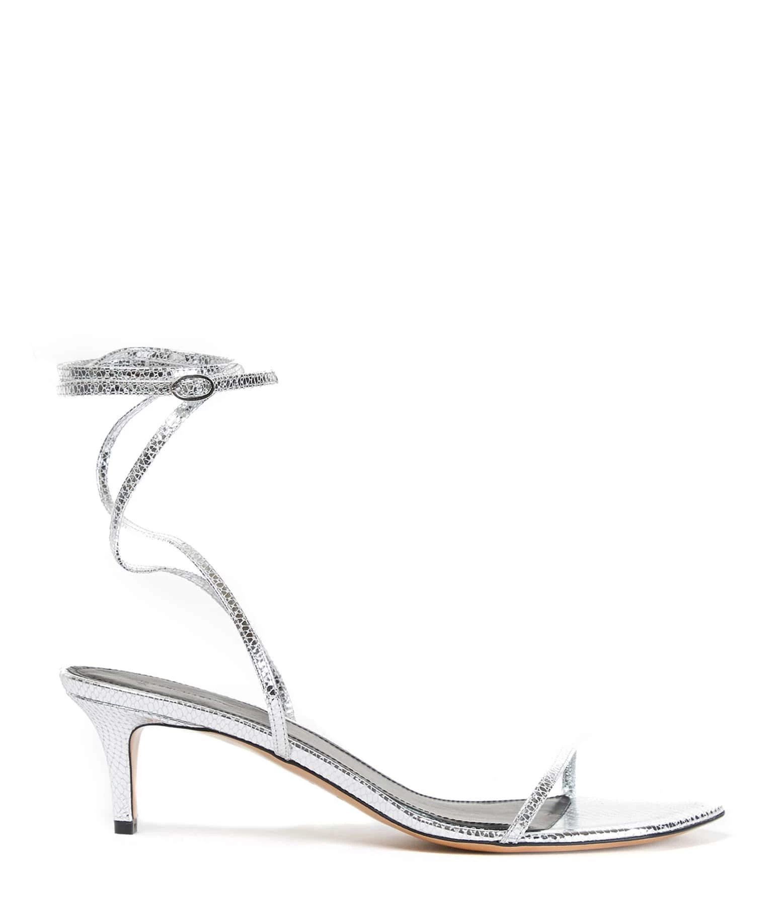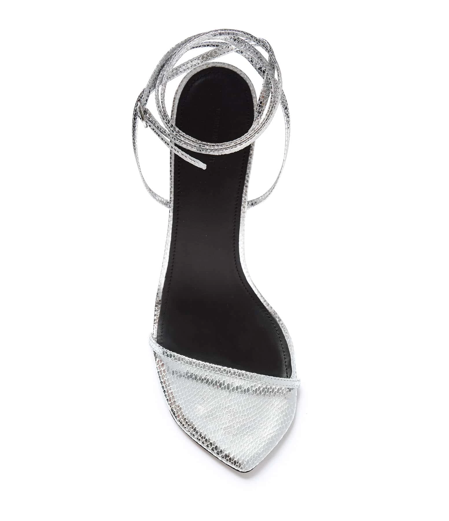 Sandales en cuir métallisé argenté. Une bride à l’avant et une bride réglable à enrouler autour de la cheville. Talon Stiletto. Doublées.