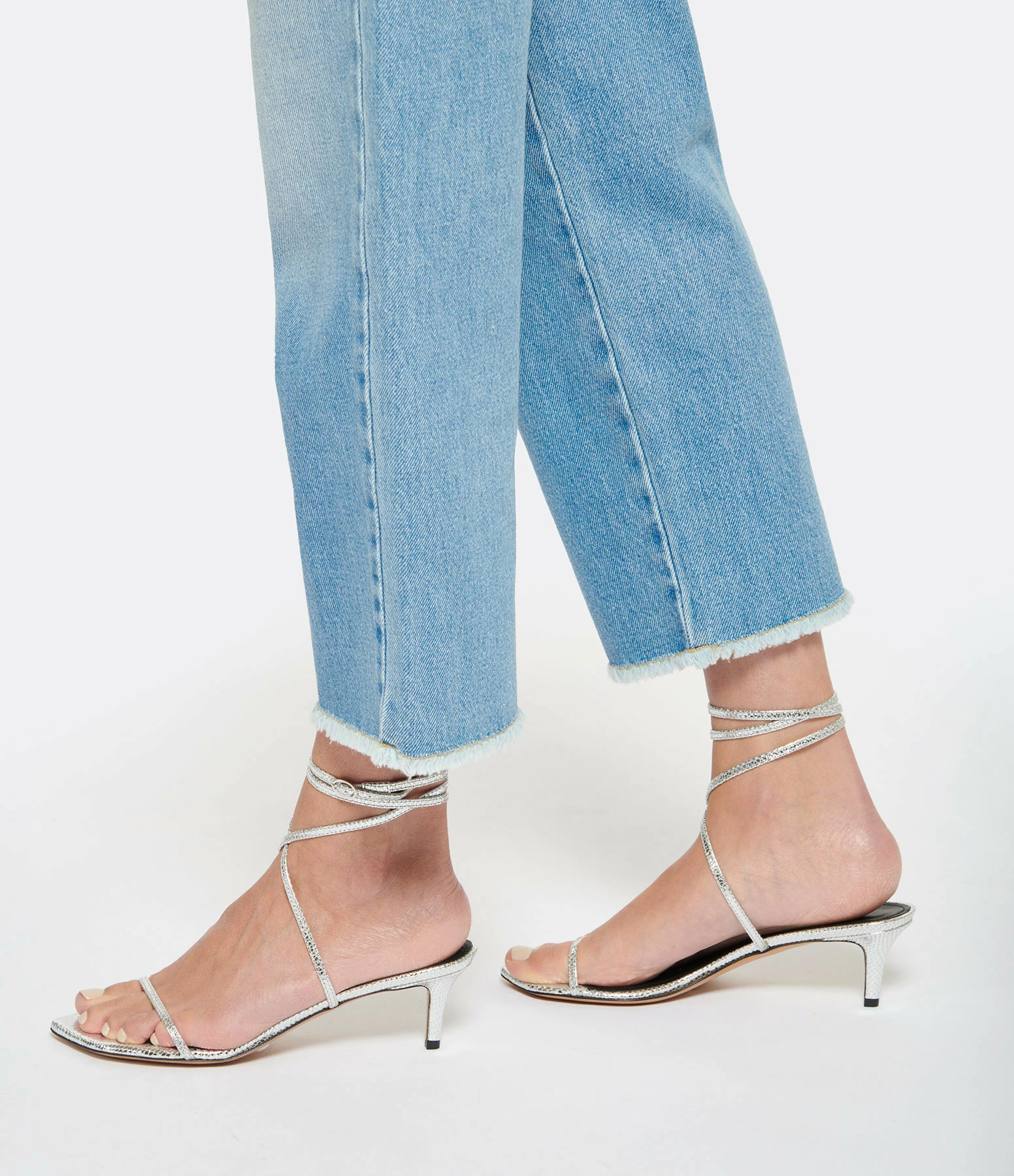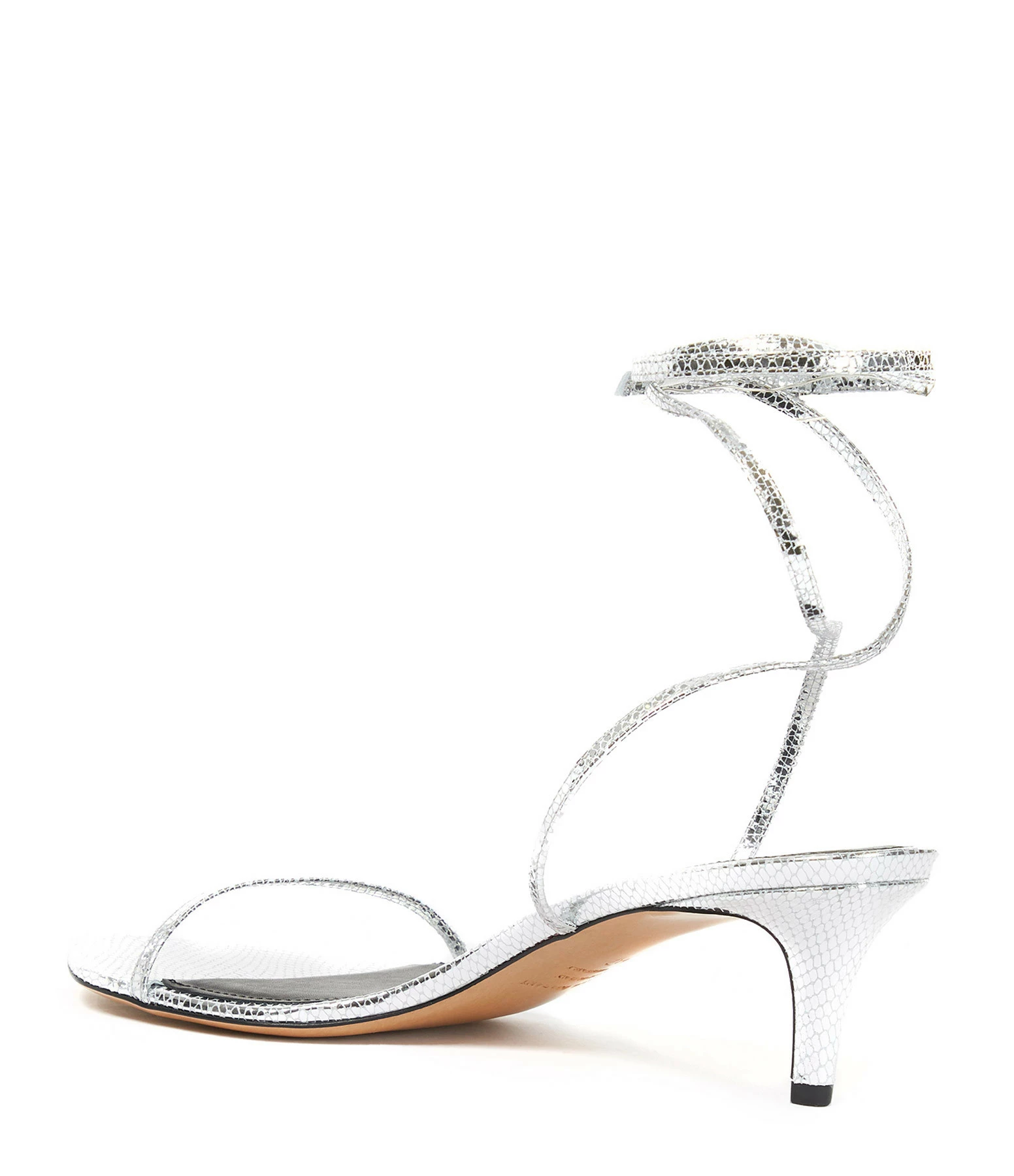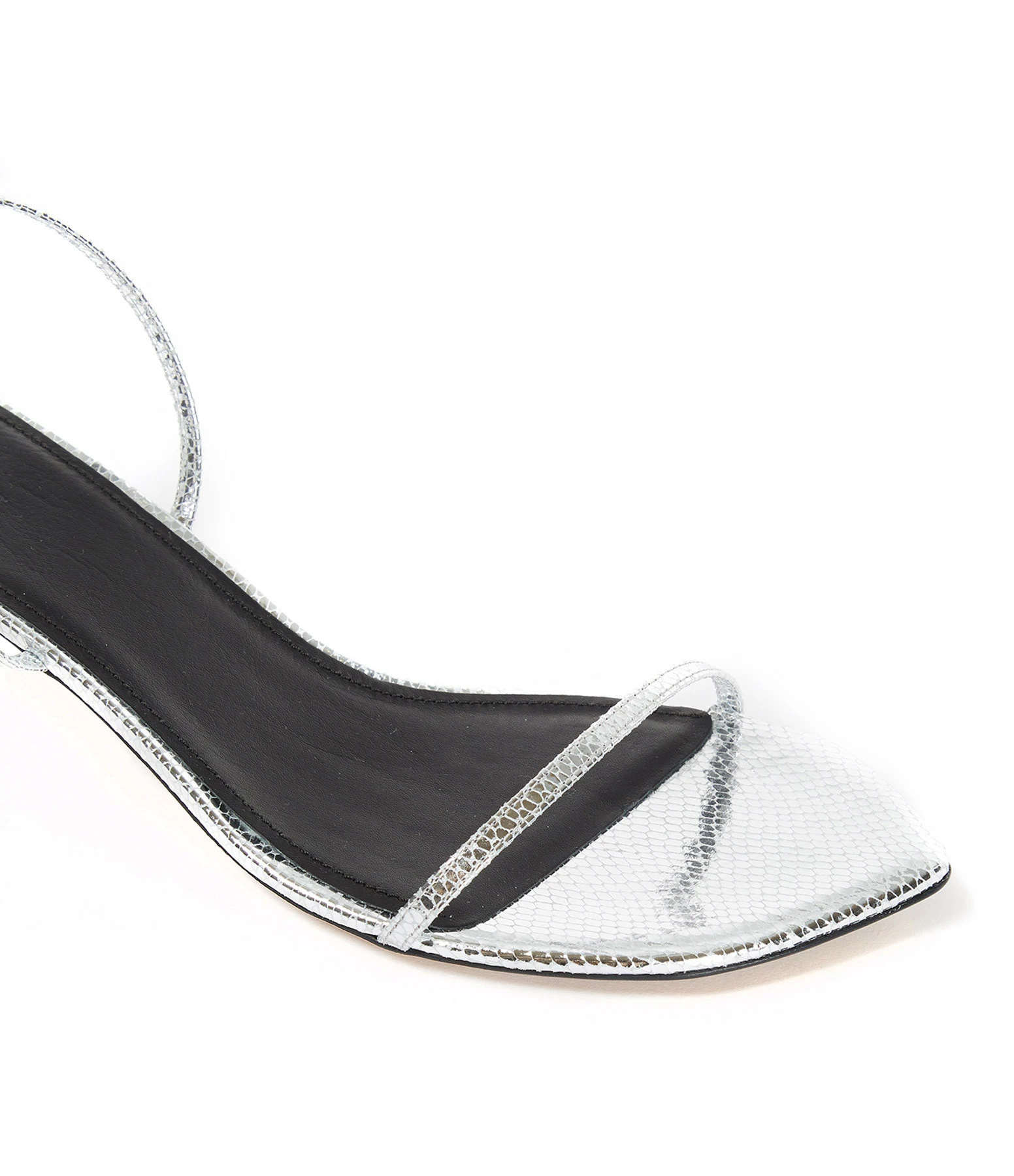 Sandales en cuir métallisé argenté. Une bride à l’avant et une bride réglable à enrouler autour de la cheville. Talon Stiletto. Doublées.