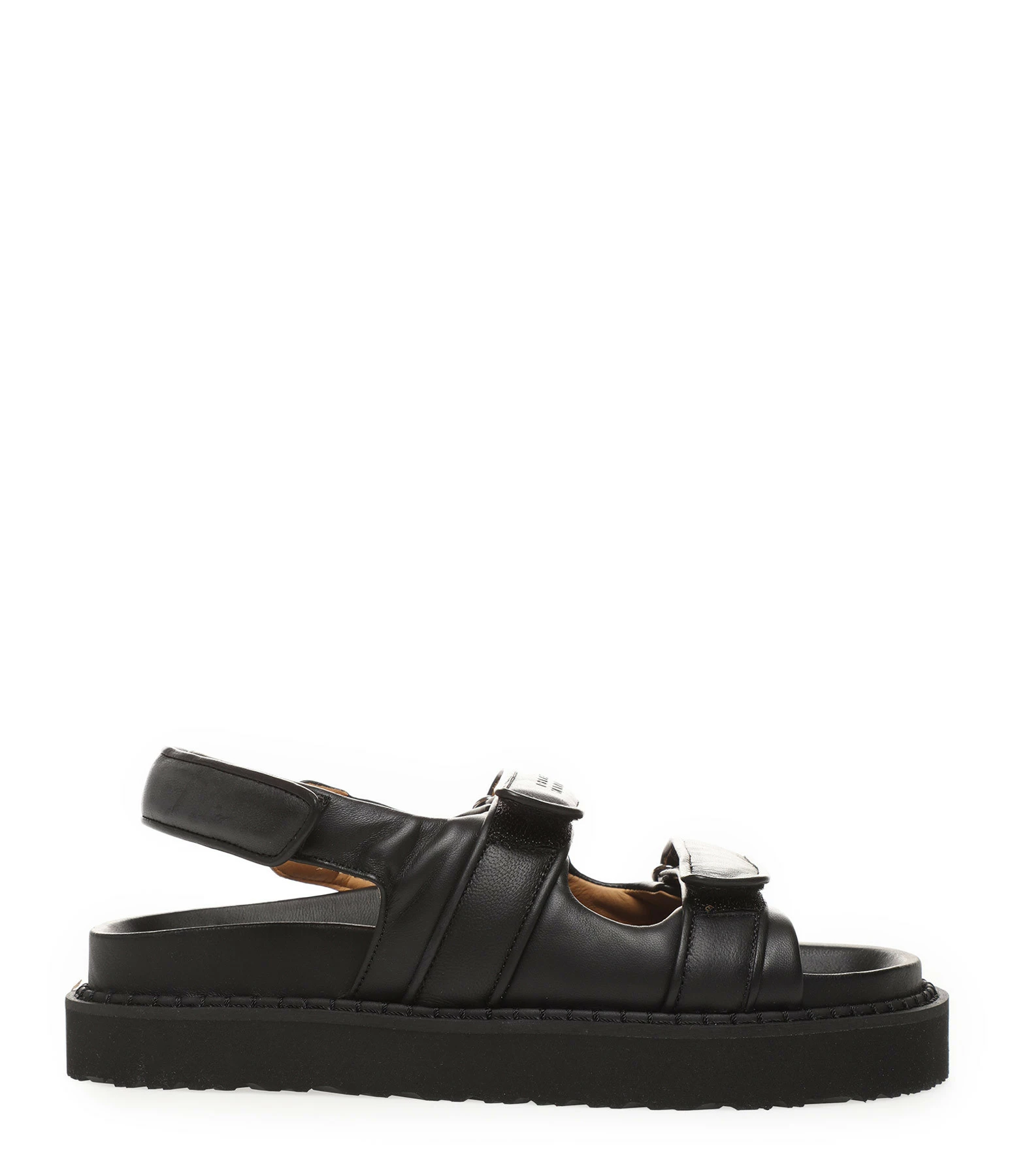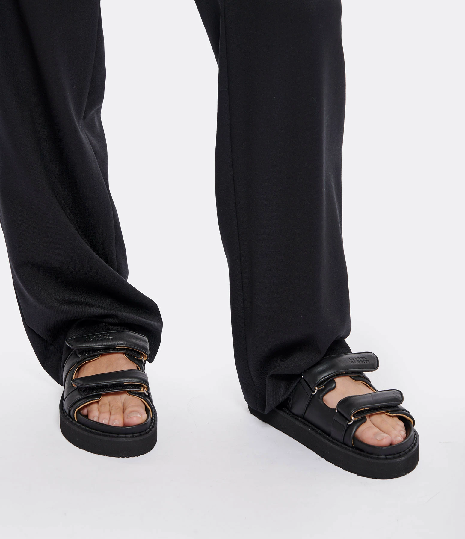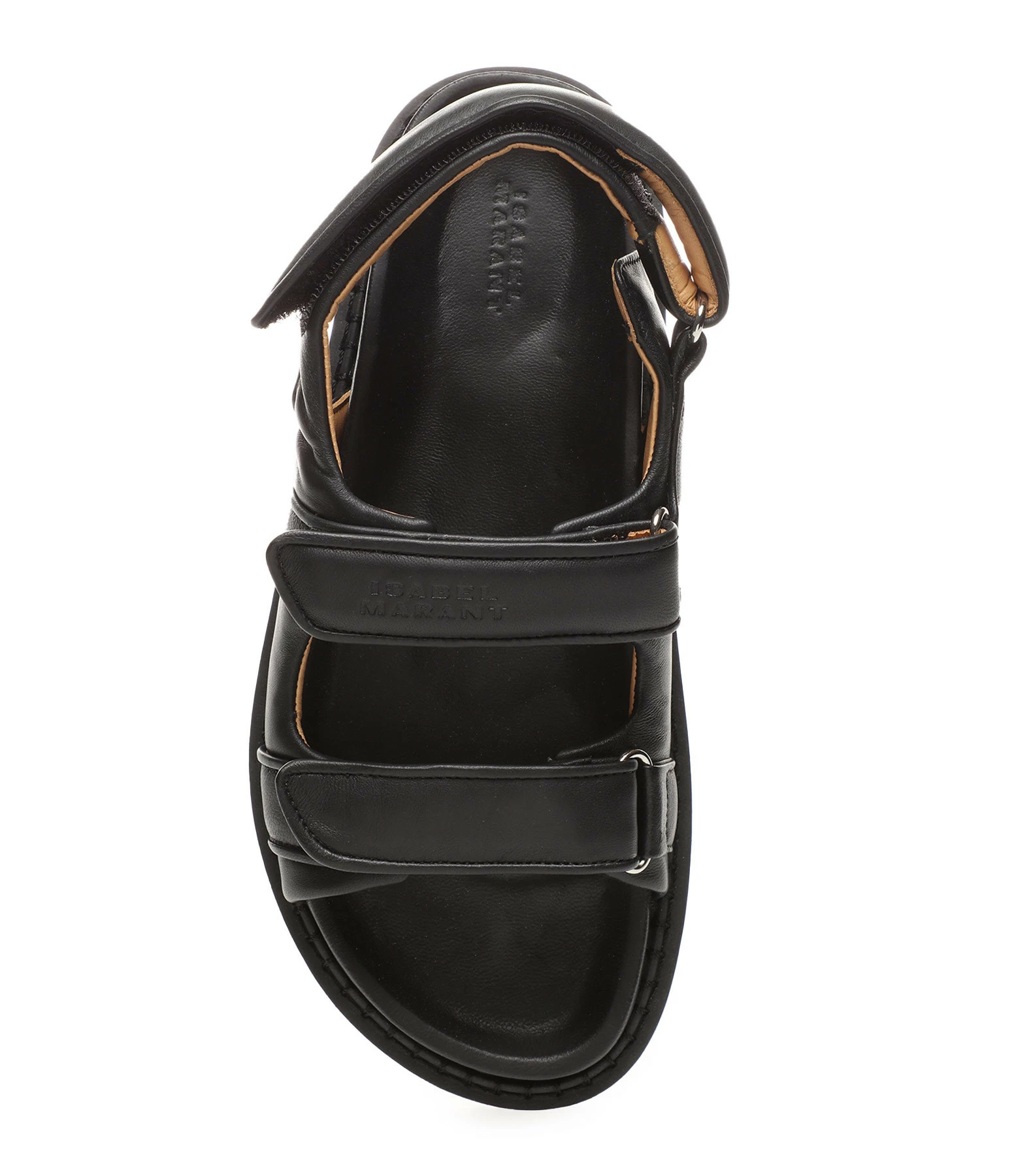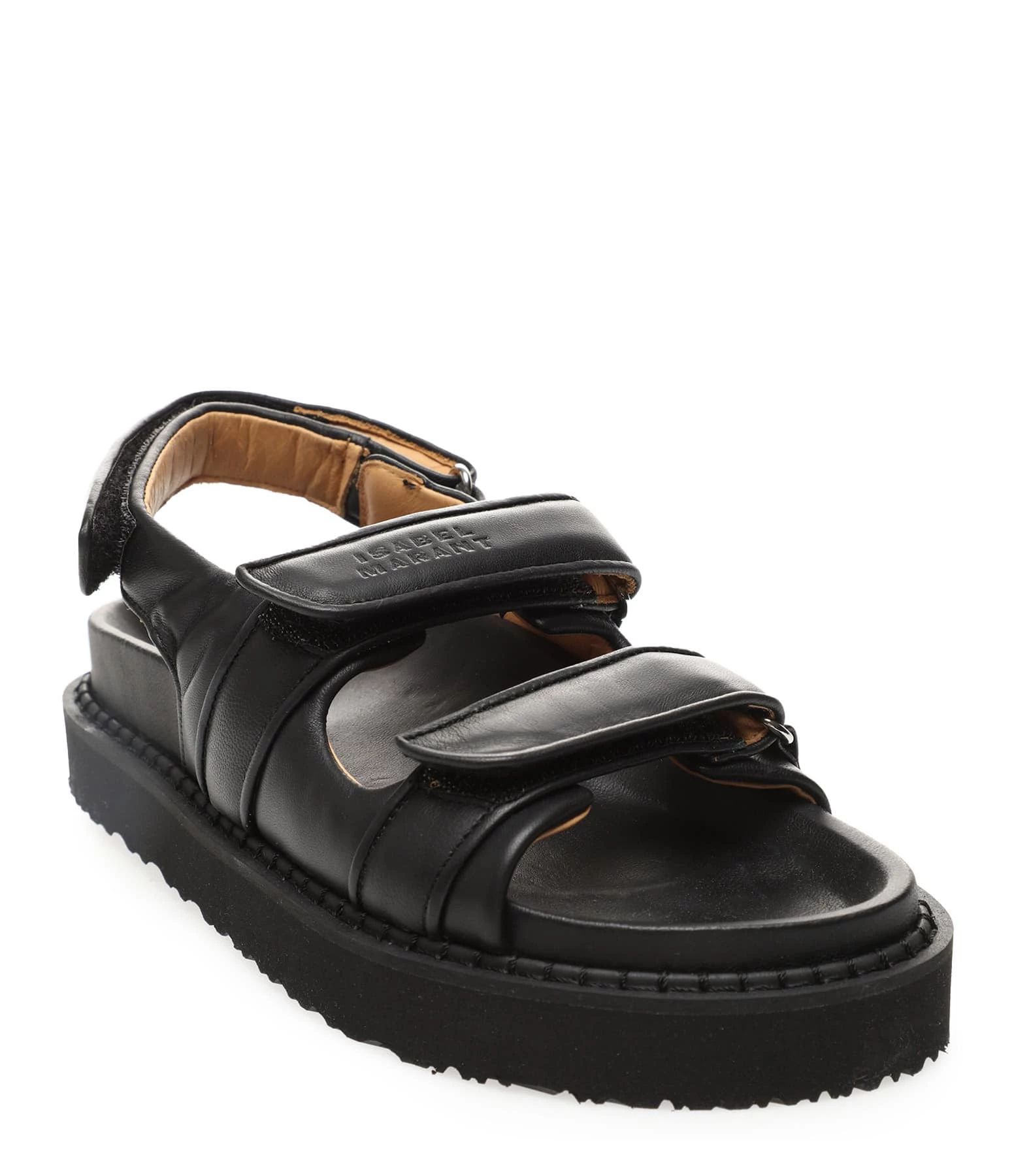 Sandales à brides à scratch en cuir noir. Logo Isabel Marant sur la bride. Attache à scratch autour de la cheville.