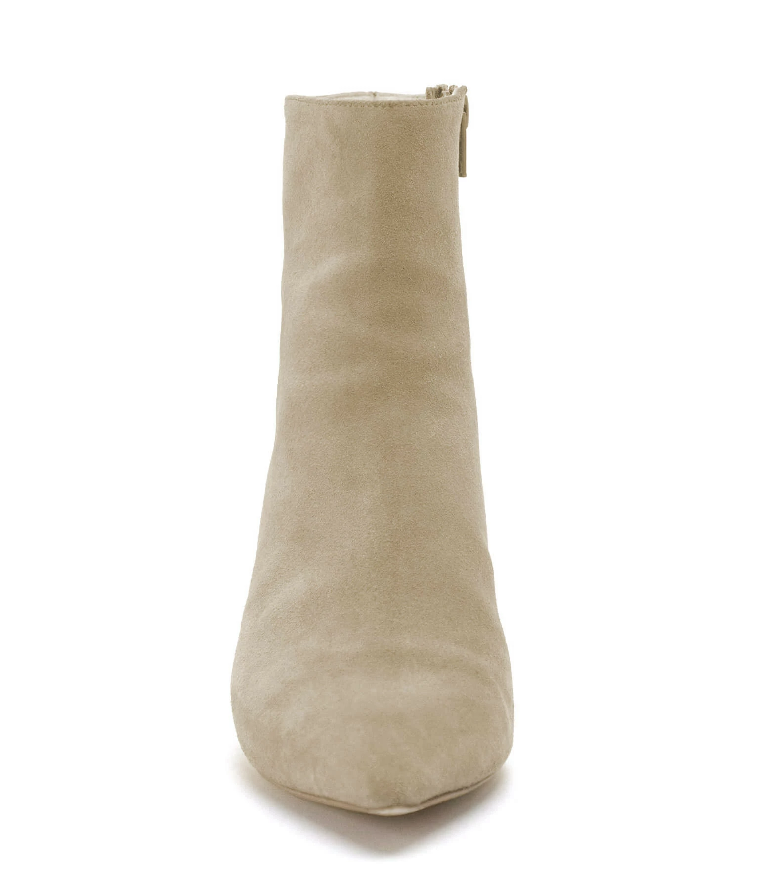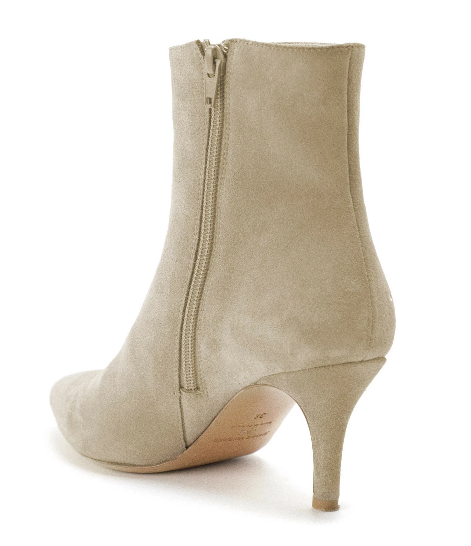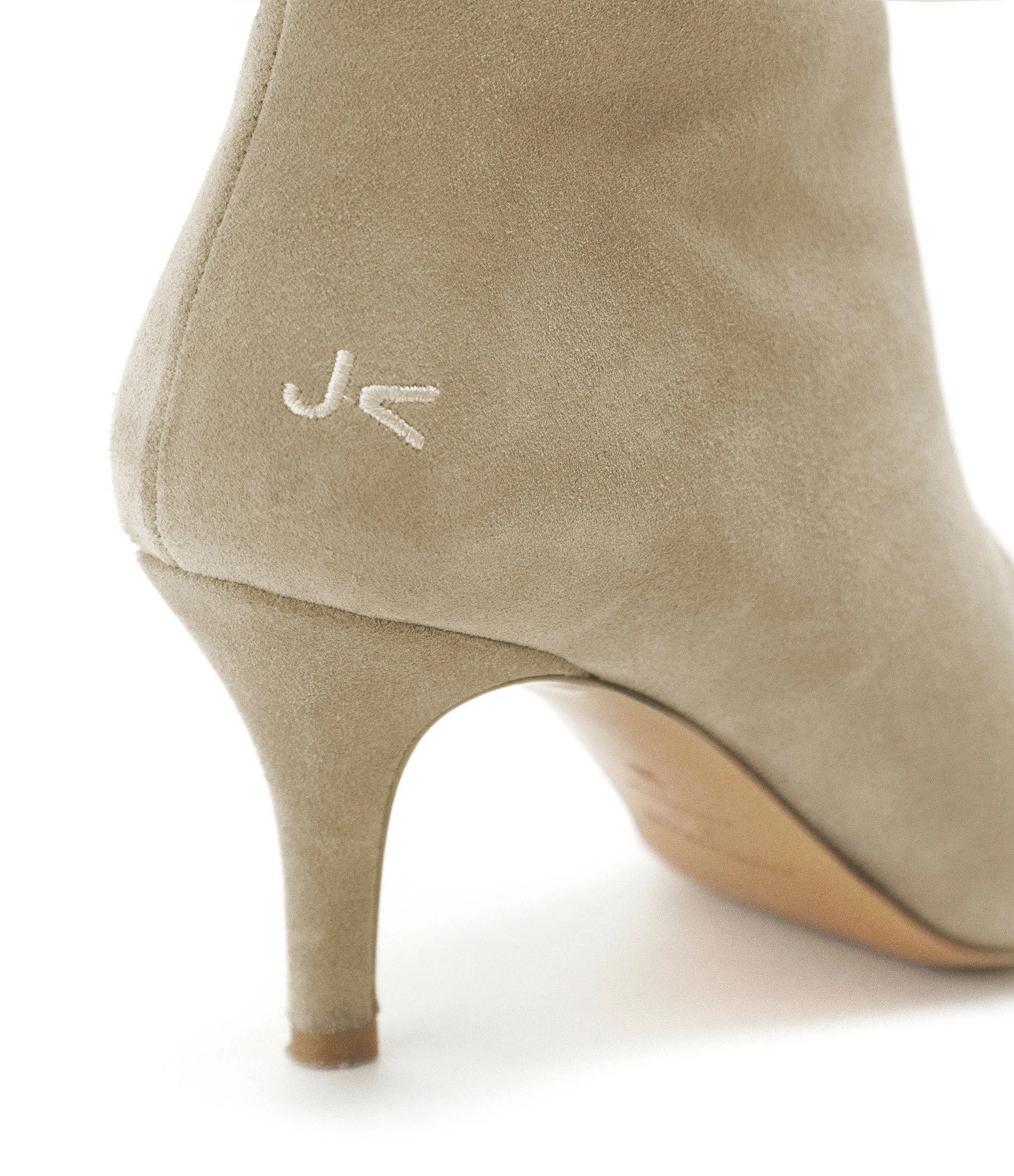 Bottines à talons en cuir suédé beige. Bouts pointus. Logo “JV” brodé à l’arrière.