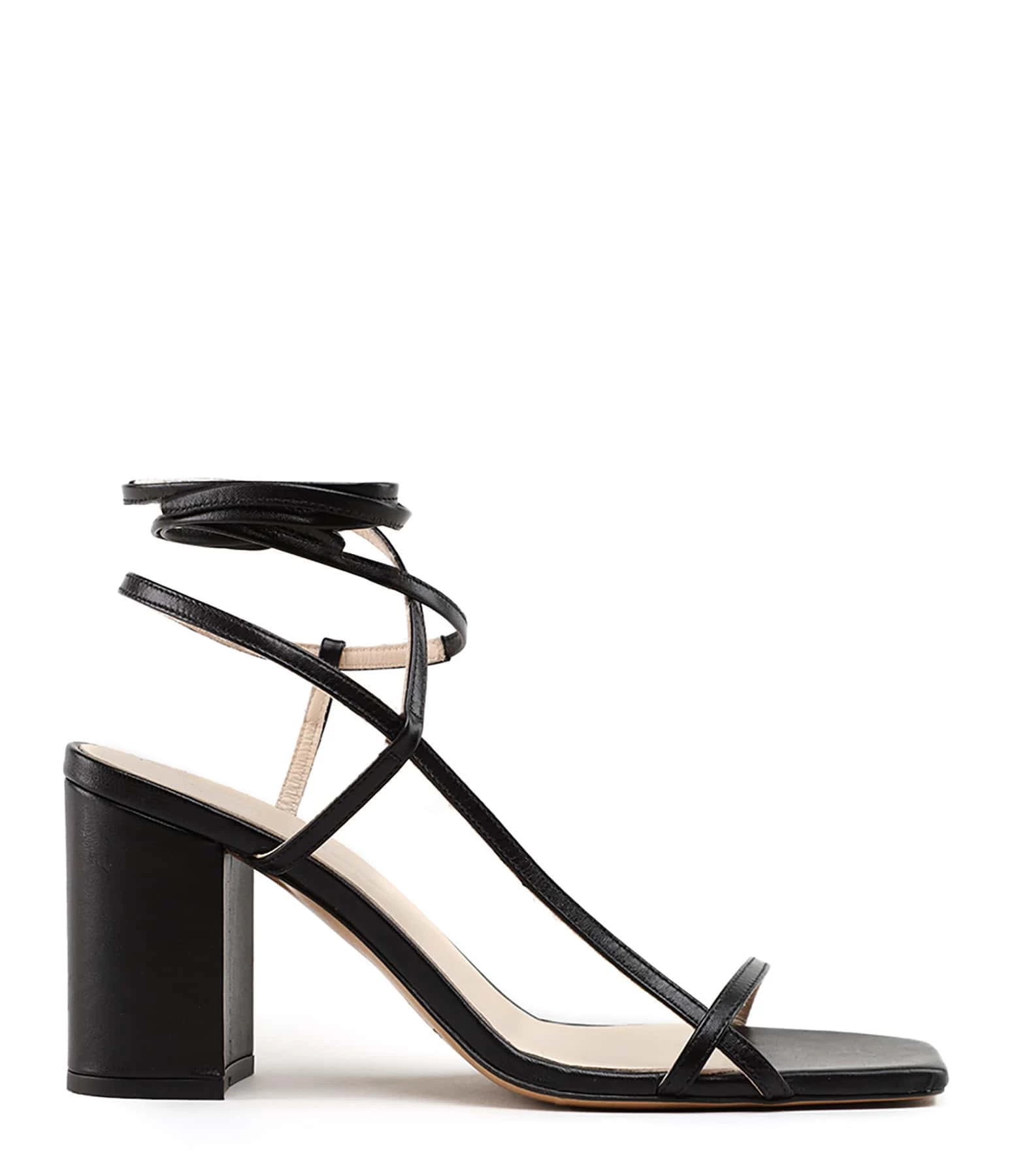 Sandales en cuir lisse noir à brides. Lacets à nouer autour de la cheville. Talon bloc.