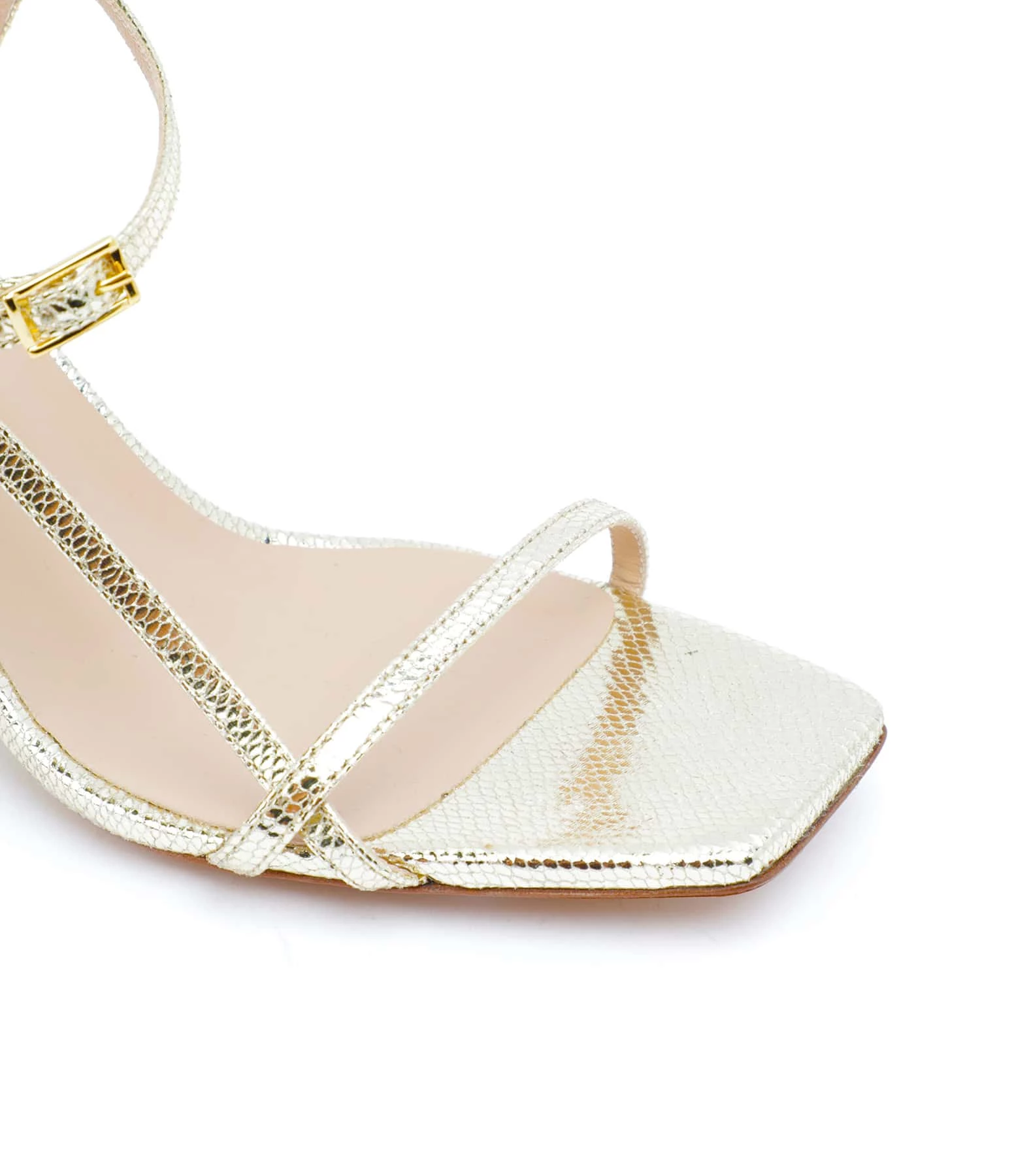 Sandales en cuir métallique doré. Une bride à l’avant longeant le côté du pied et une bride réglable sur la cheville. Talon biseauté. Doublées avec embossage “Jeanne Vouland” sur l’intérieur de la chaussure.