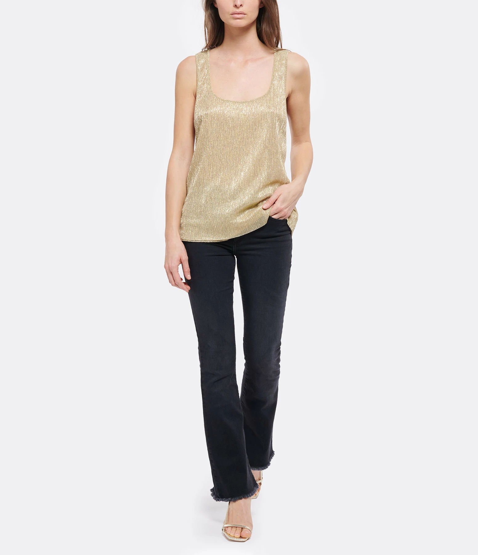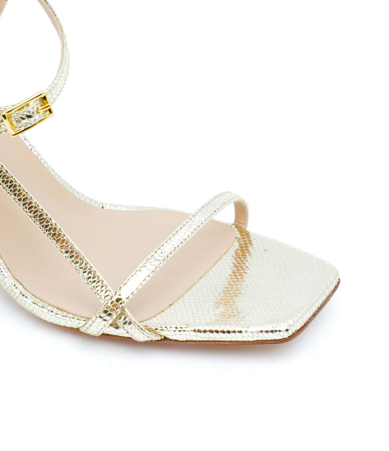 Sandales en cuir métallique doré. Une bride à l’avant longeant le côté du pied et une bride réglable sur la cheville. Talon biseauté. Doublées avec embossage “Jeanne Vouland” sur l’intérieur de la chaussure.