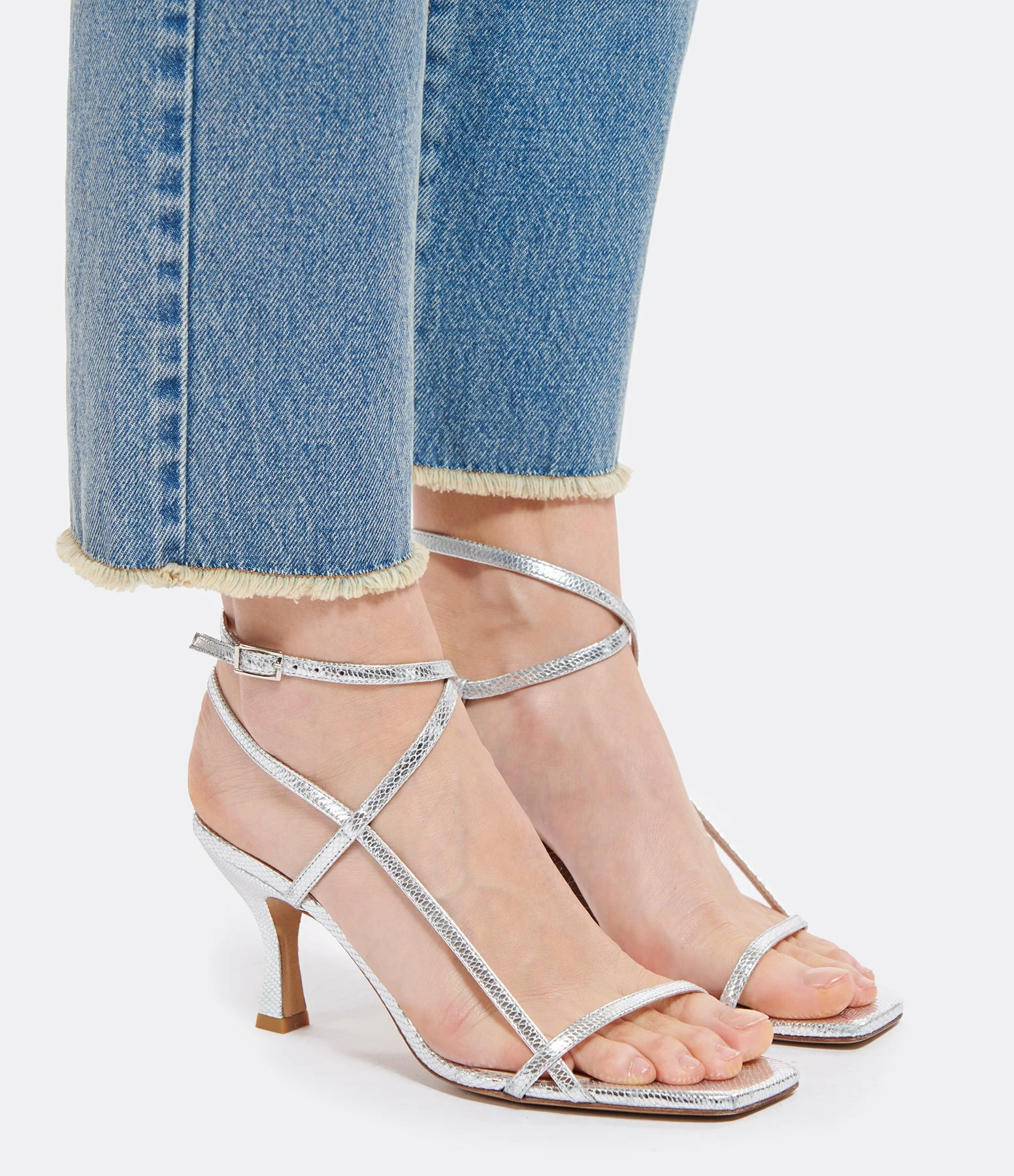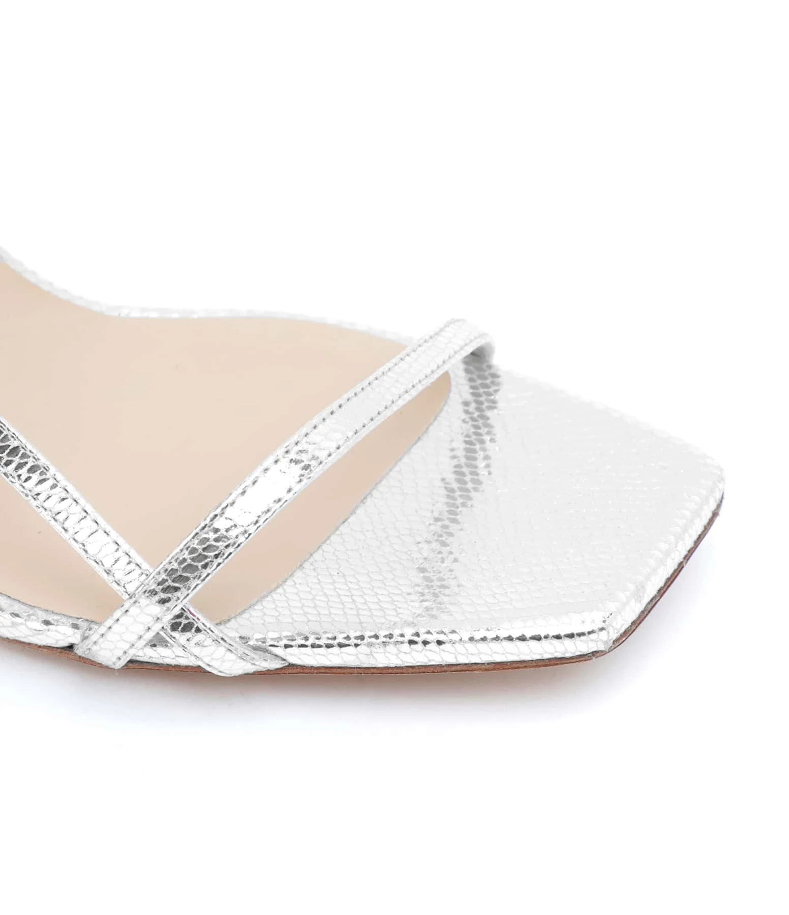 Sandales en cuir argenté à brides. Bride réglable autour de la cheville. Talon biseauté.