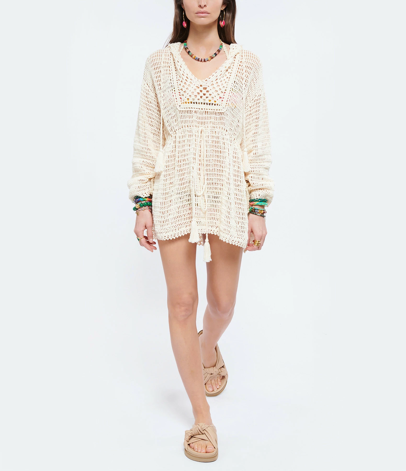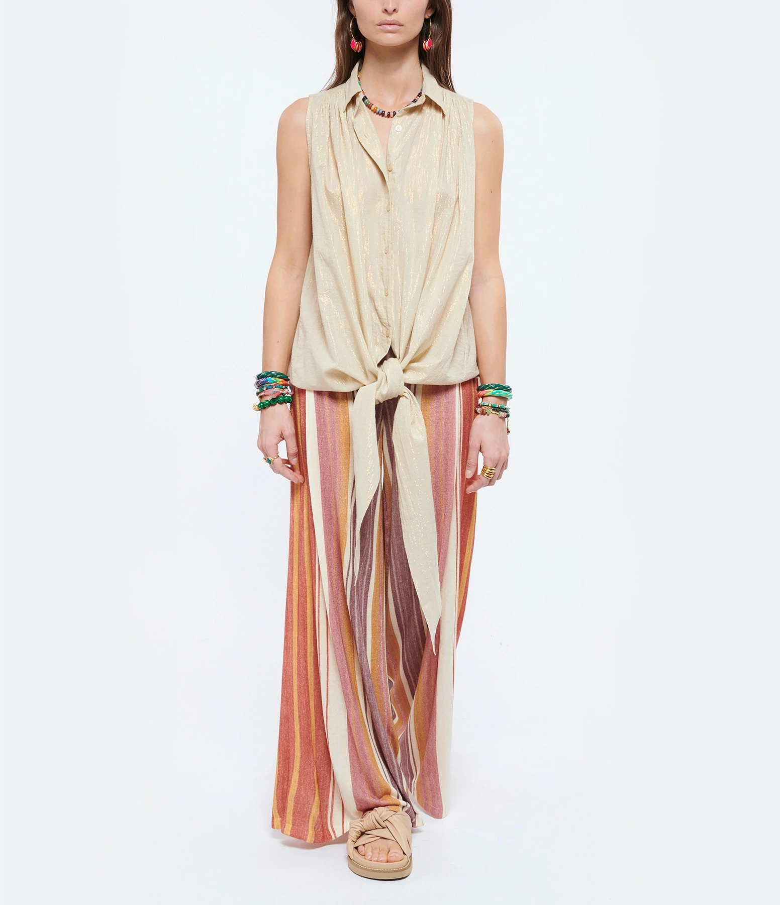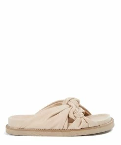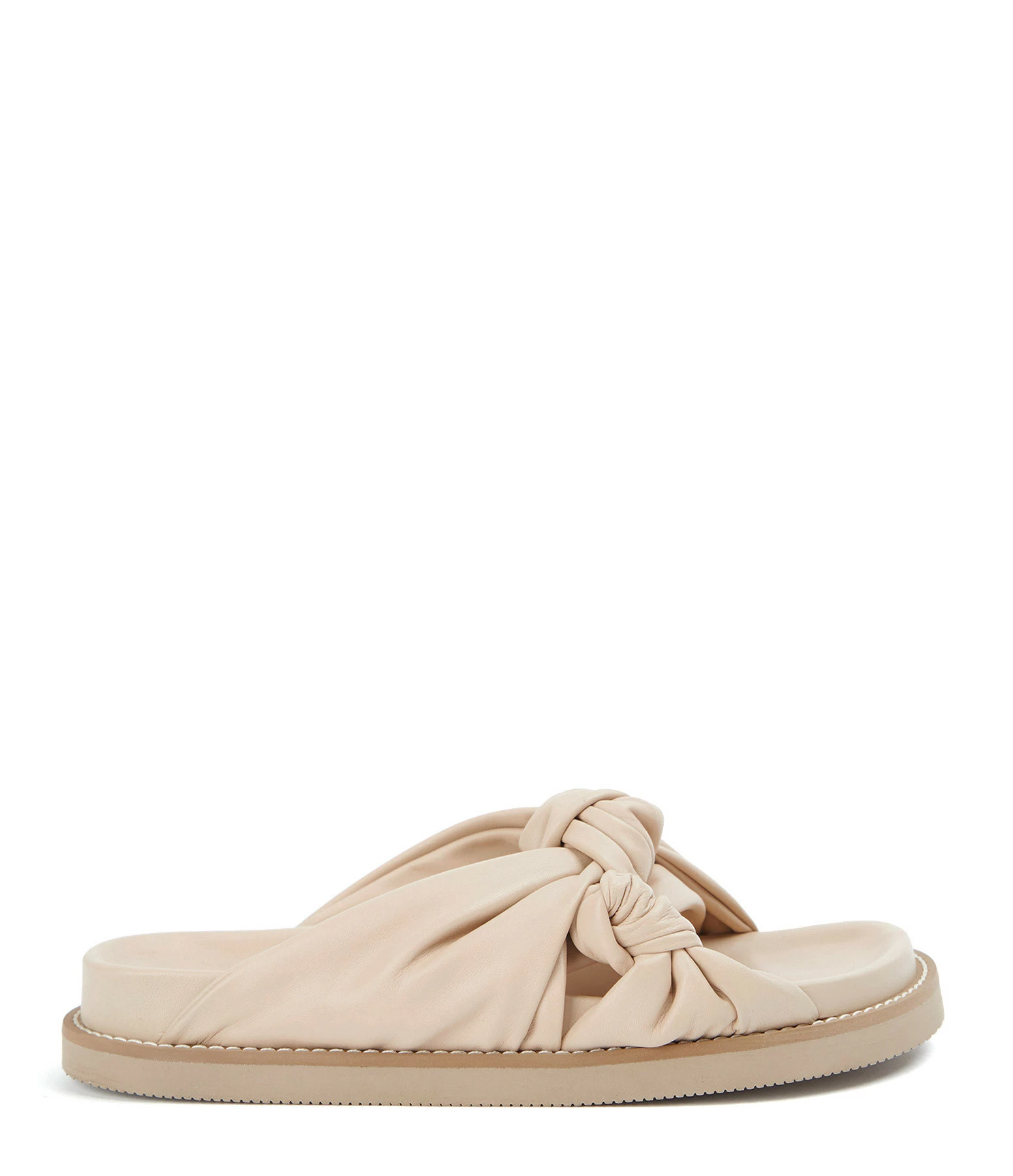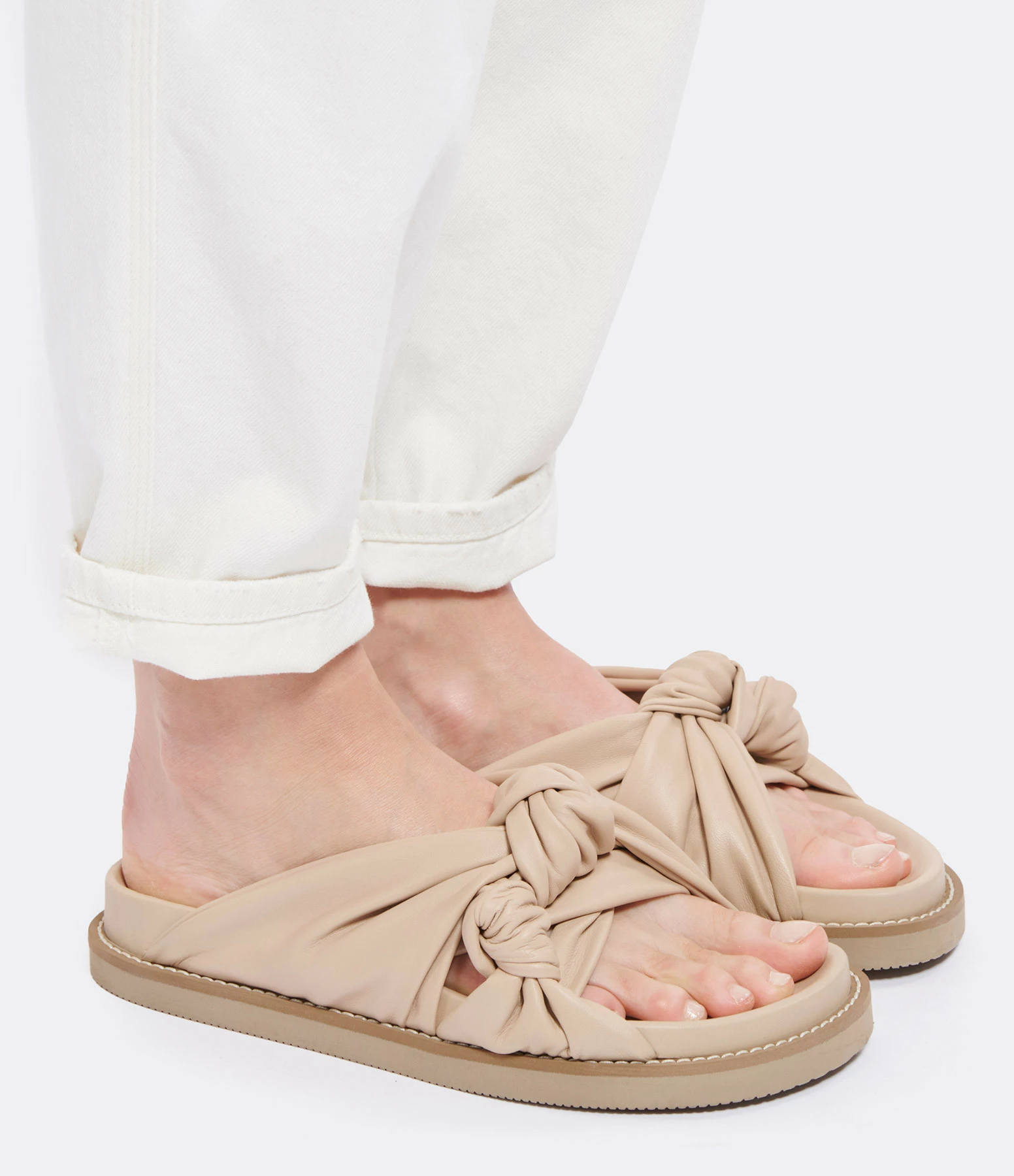 Mules en cuir beige. Brides avec nœuds sur le dessus. Semelles épaisses.