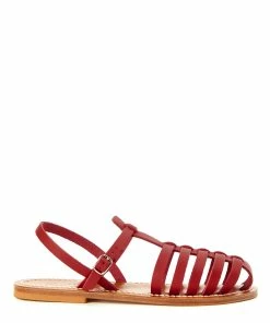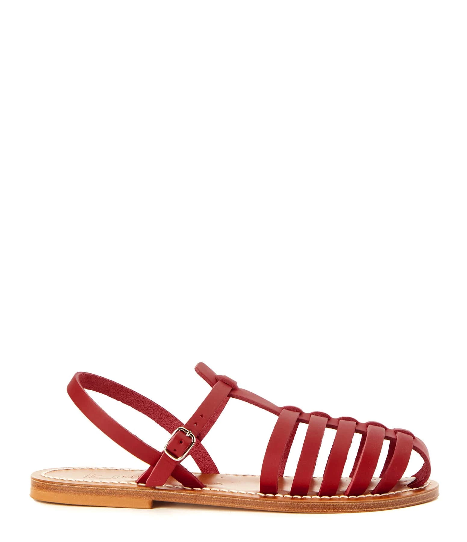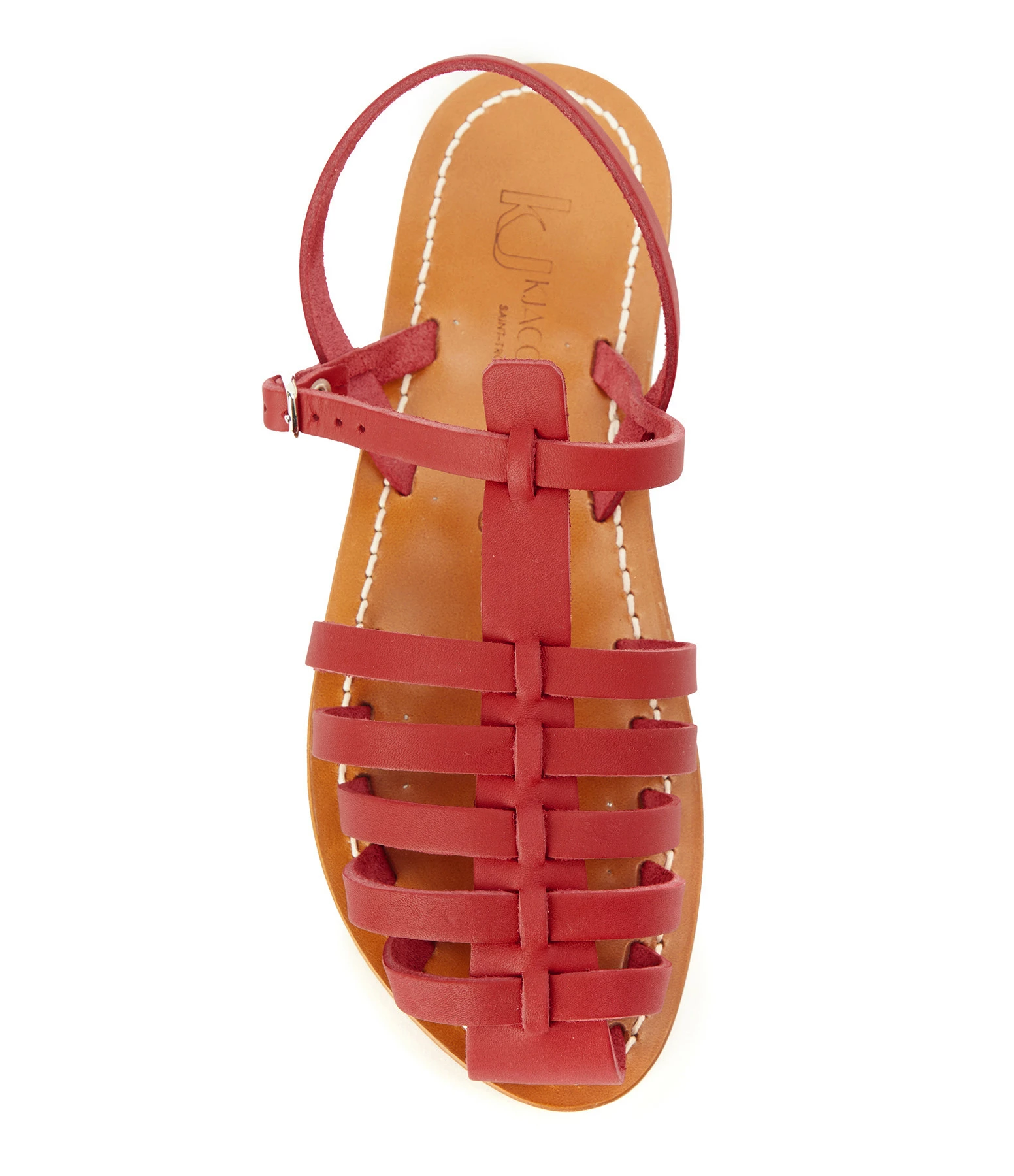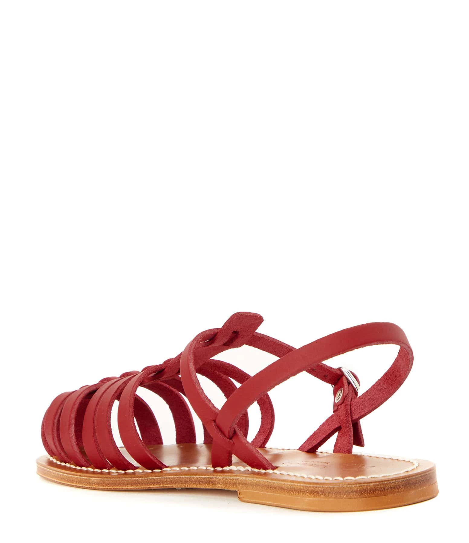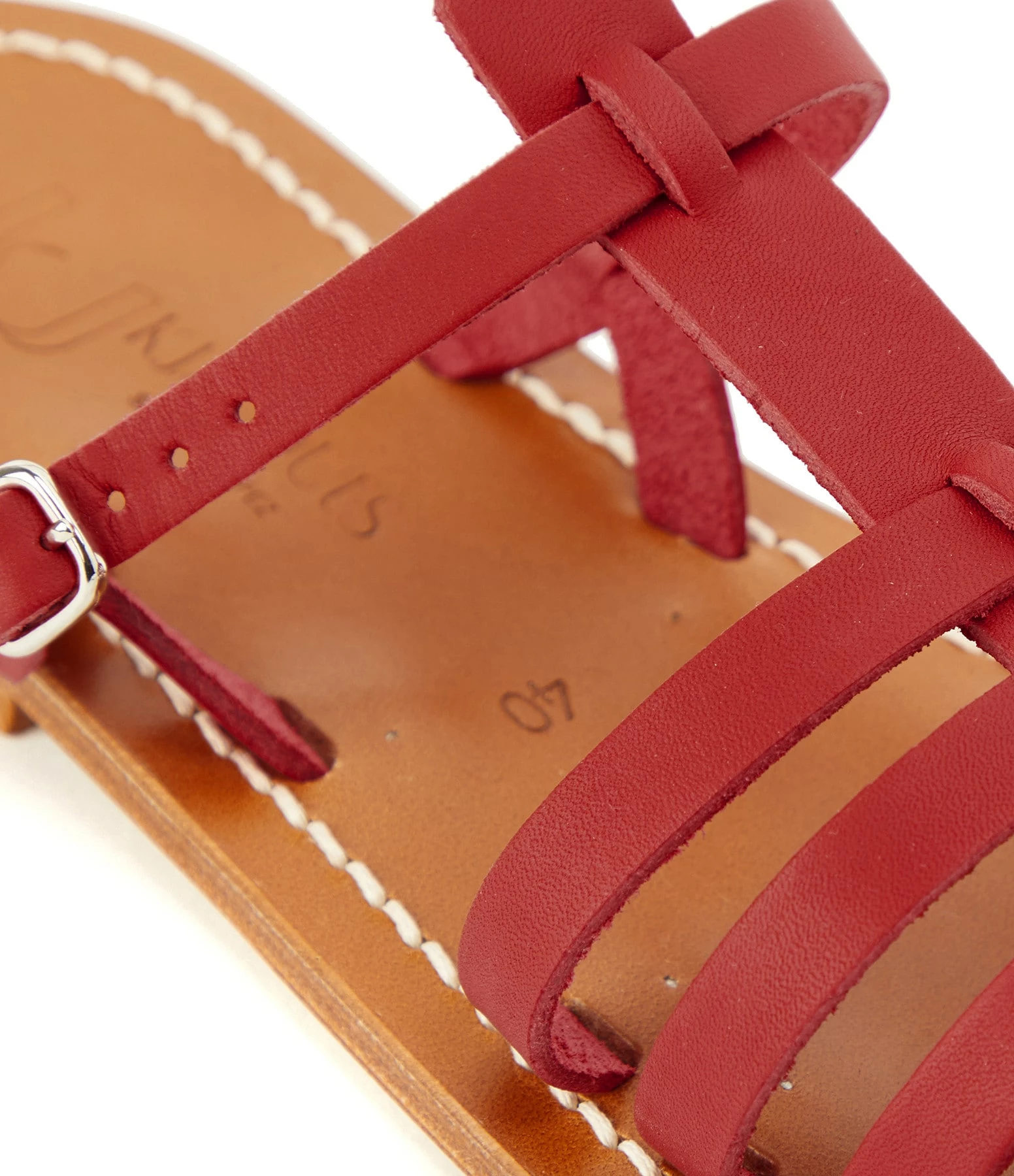 Sandales multi-brides à bout rond en cuir rouge type spartiate. Bride réglable à la cheville.