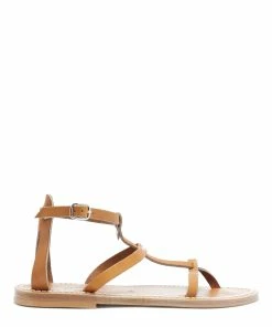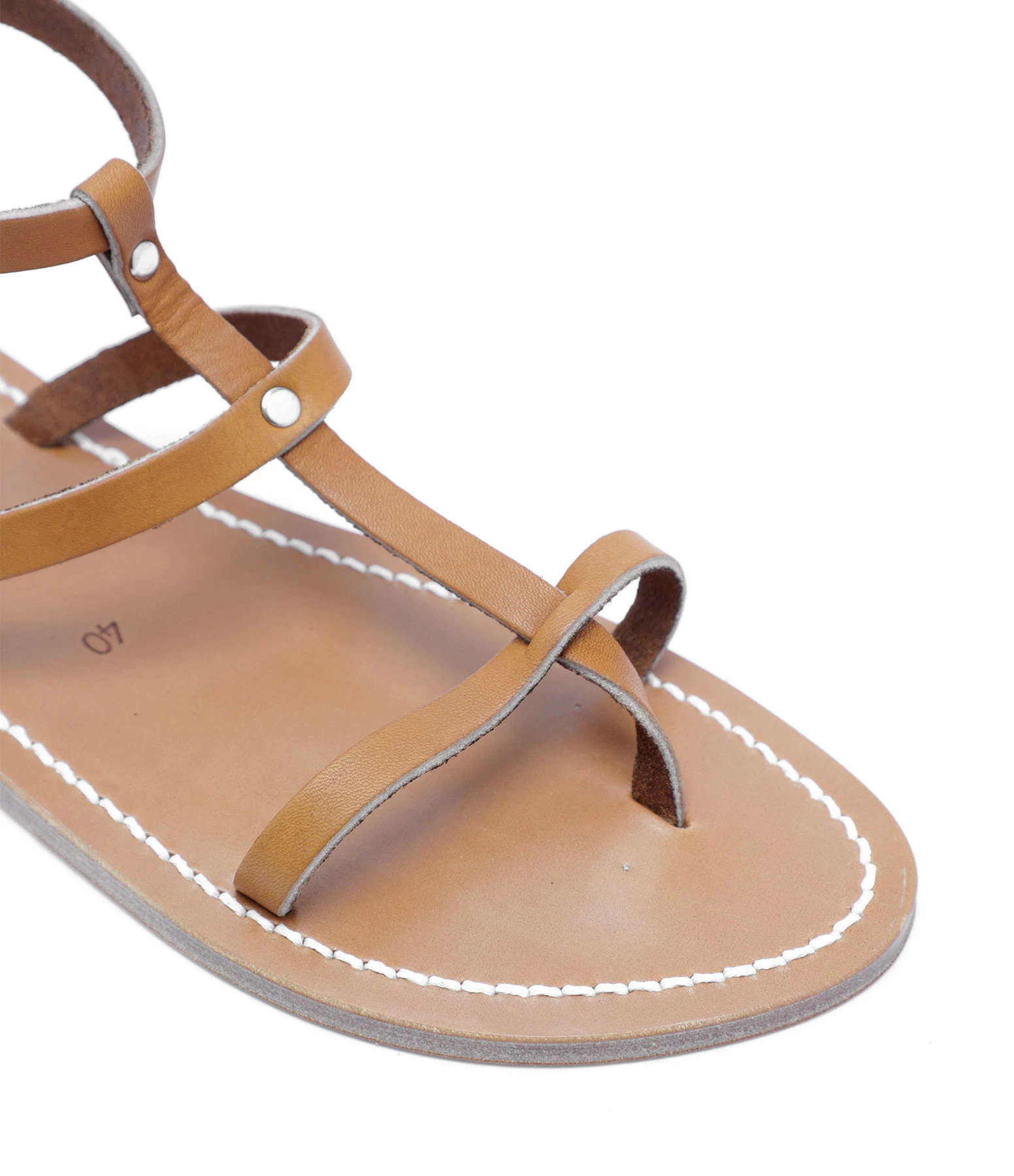 Sandales en cuir naturel marron. Quatre brides dont une bride réglable à attacher autour de la cheville.