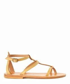Sandales en cuir. Quatre brides en cuir jaune dont une bride réglable à attacher autour de la cheville.