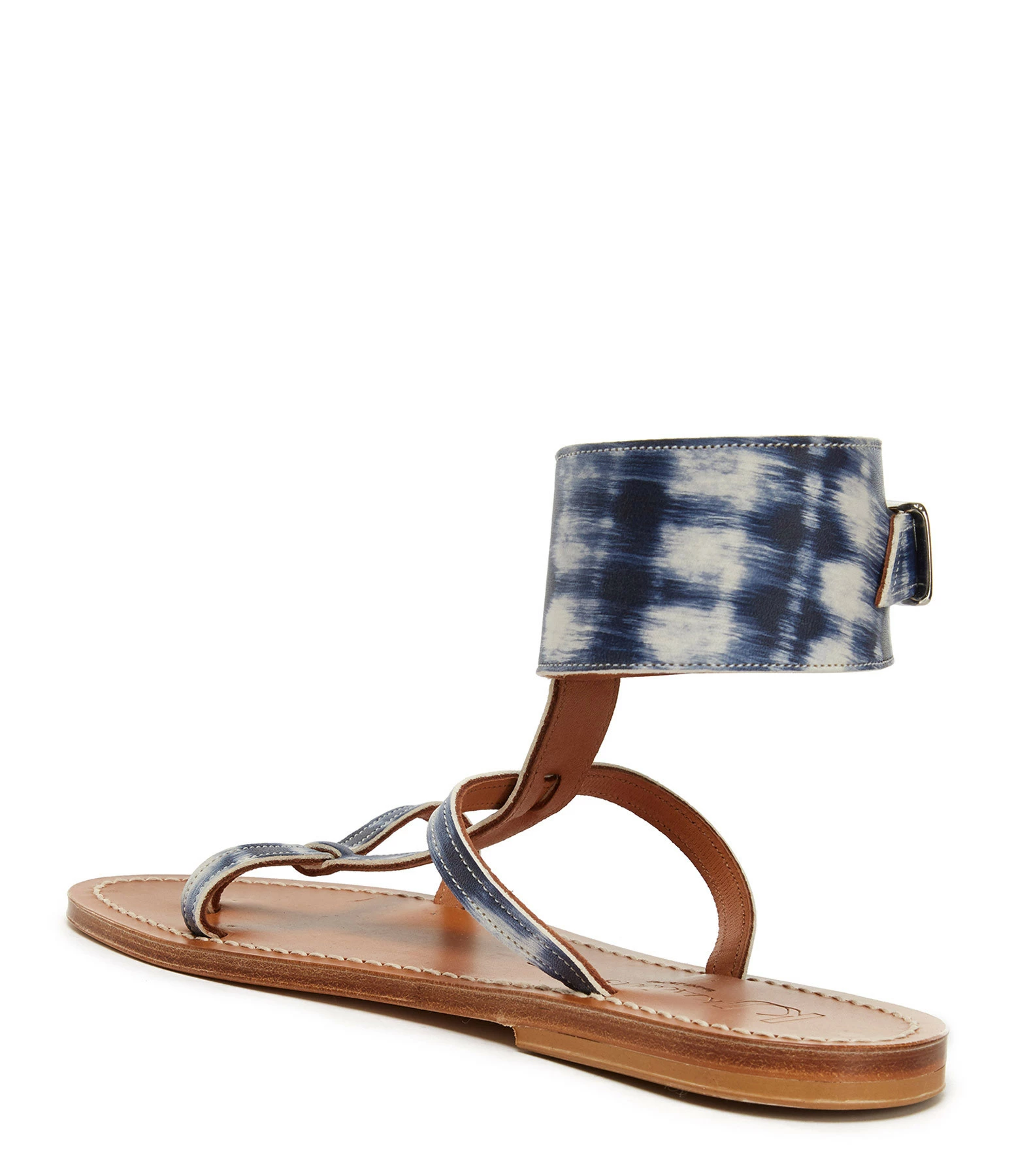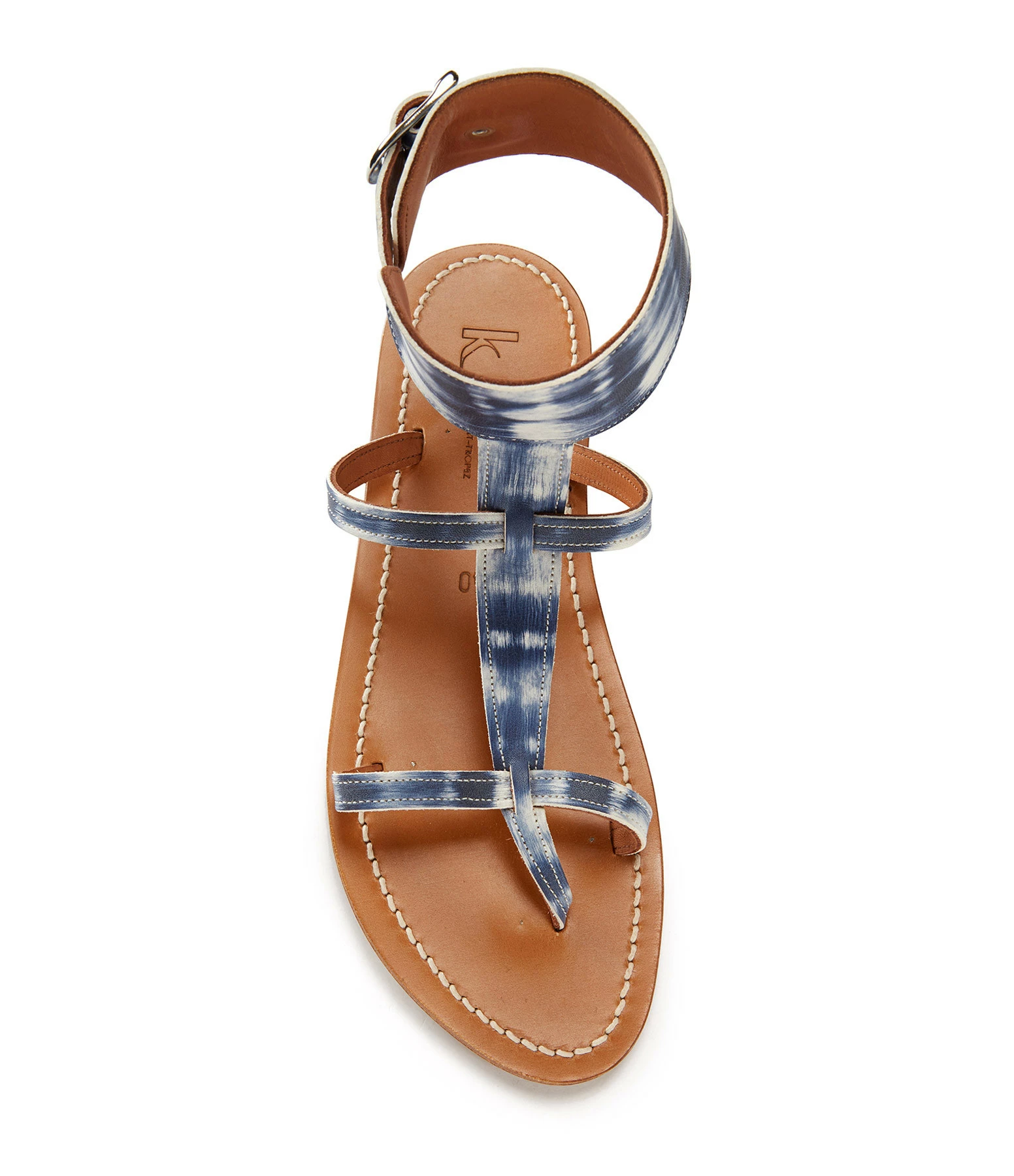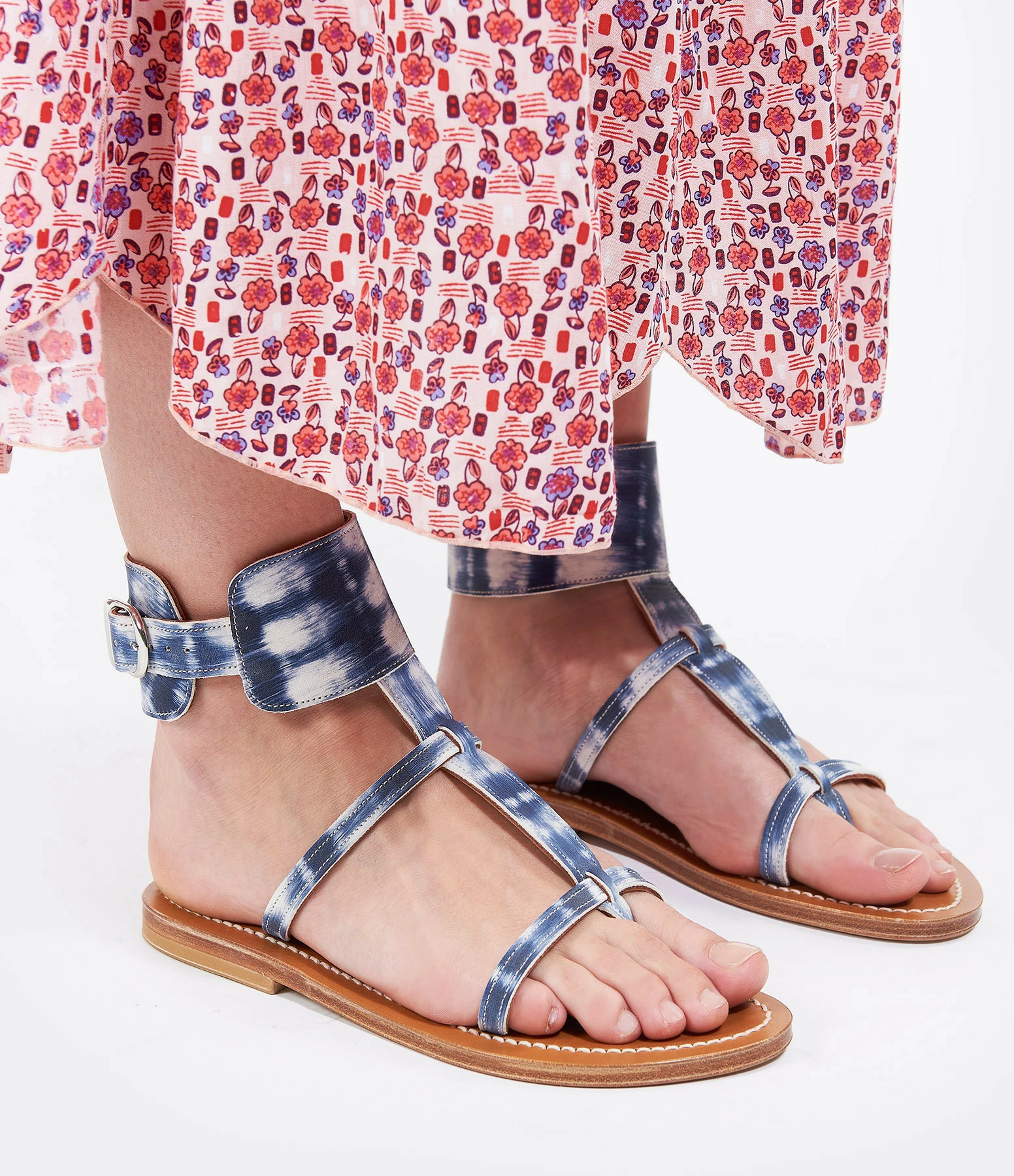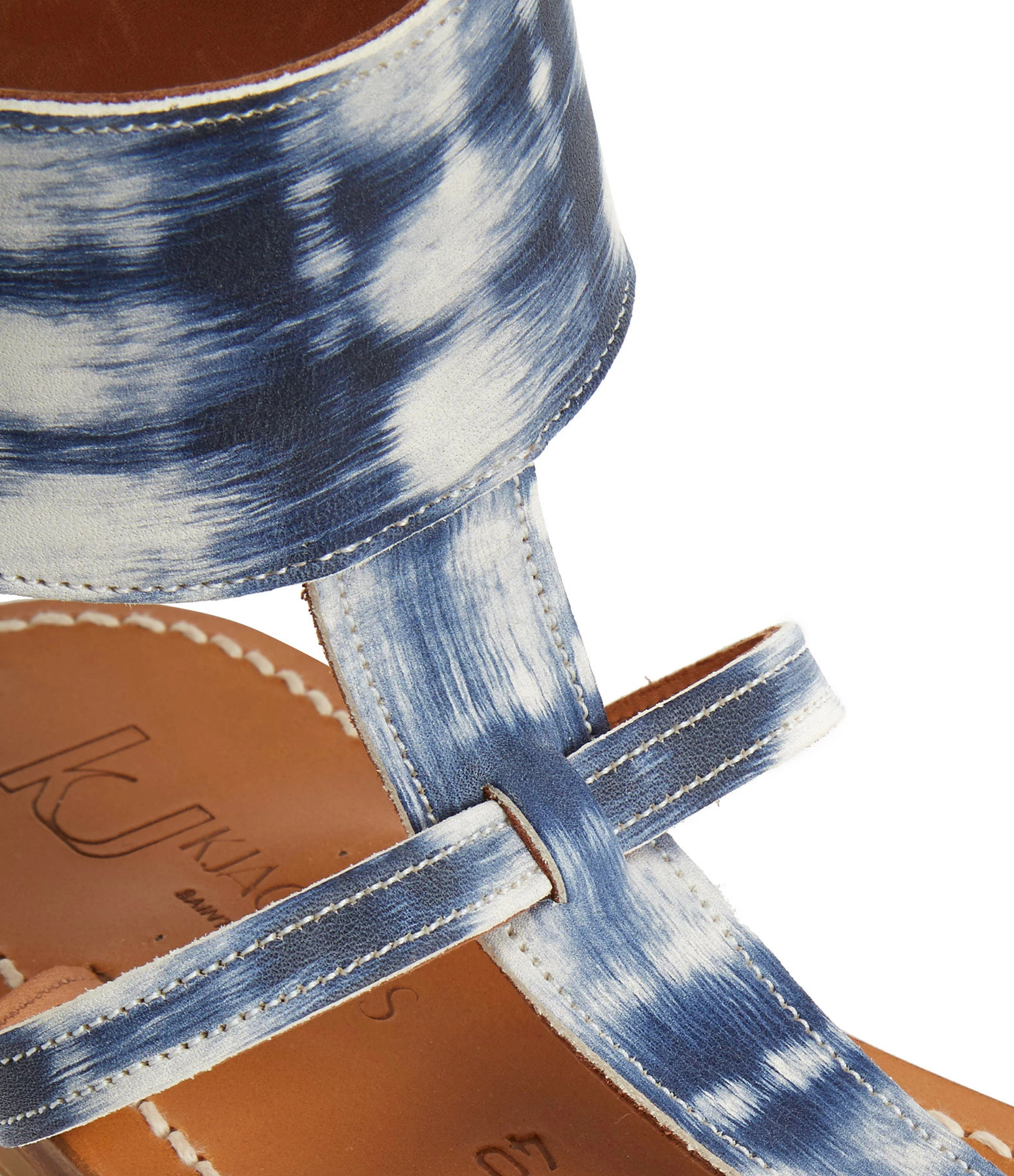 Sandales en cuir imprimé tie and dye bleu et blanc. Une large bride réglable autour de la cheville.