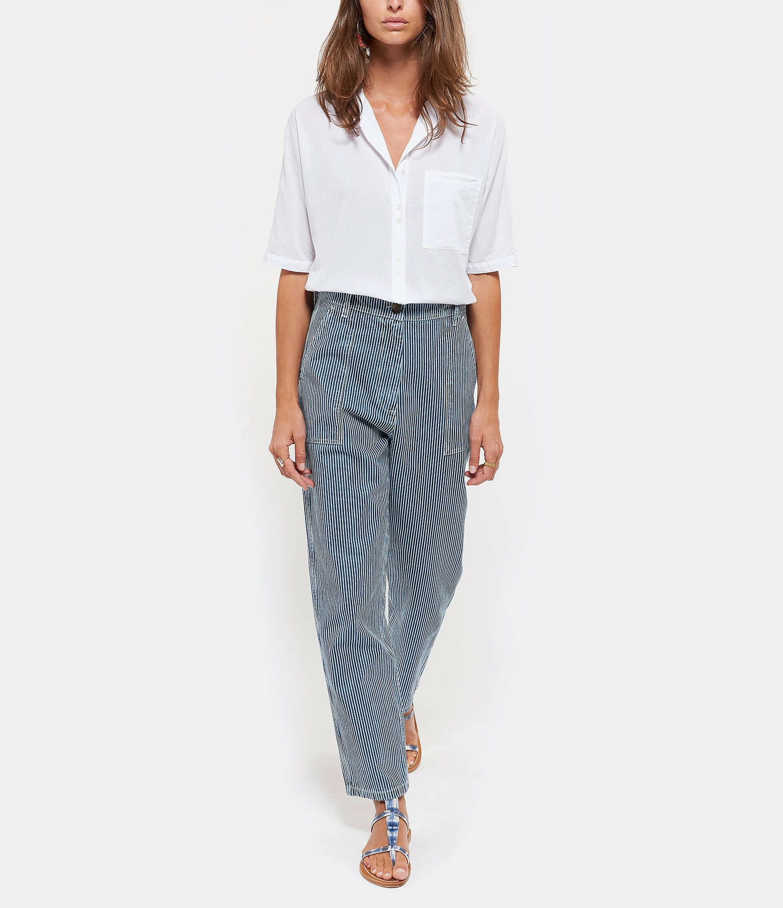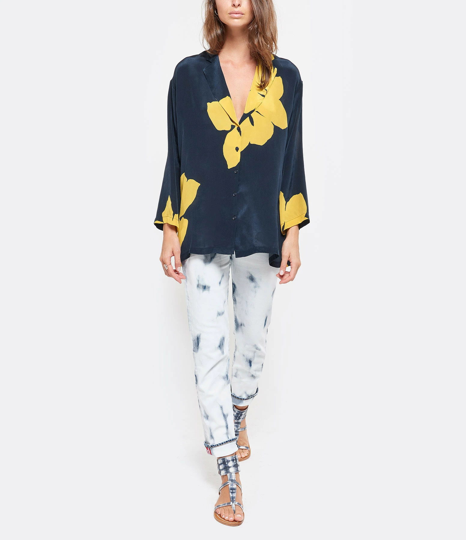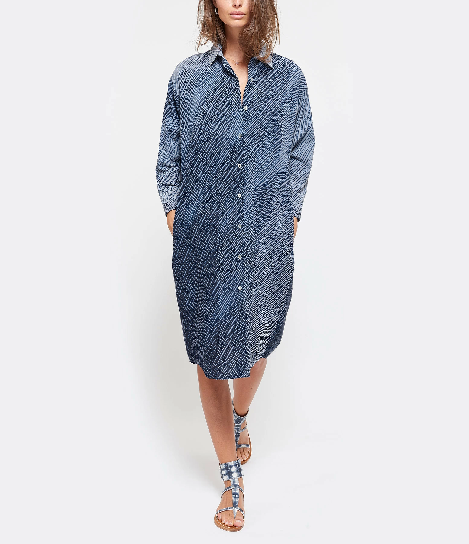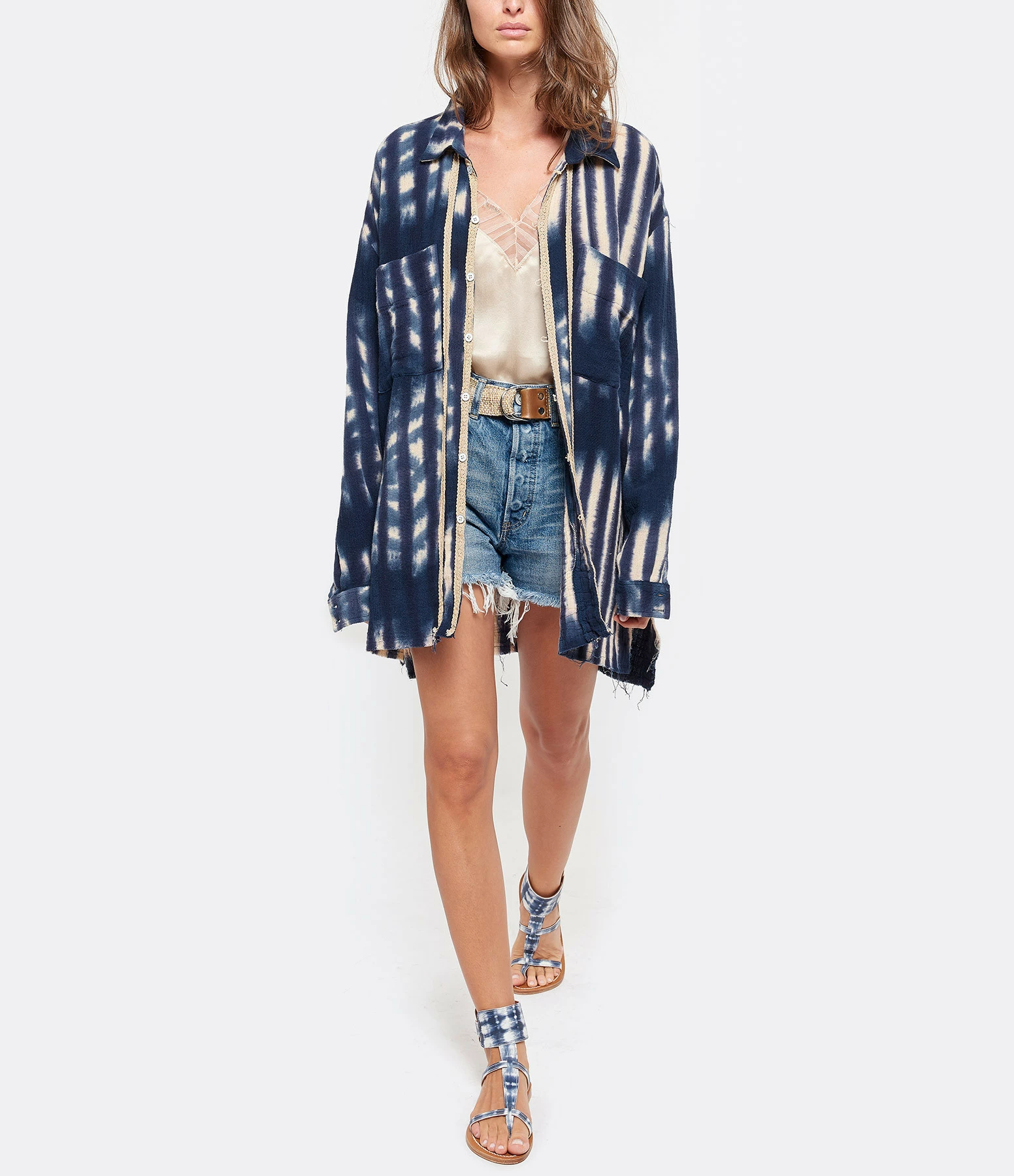 Sandales en cuir imprimé tie and dye bleu et blanc. Une large bride réglable autour de la cheville.