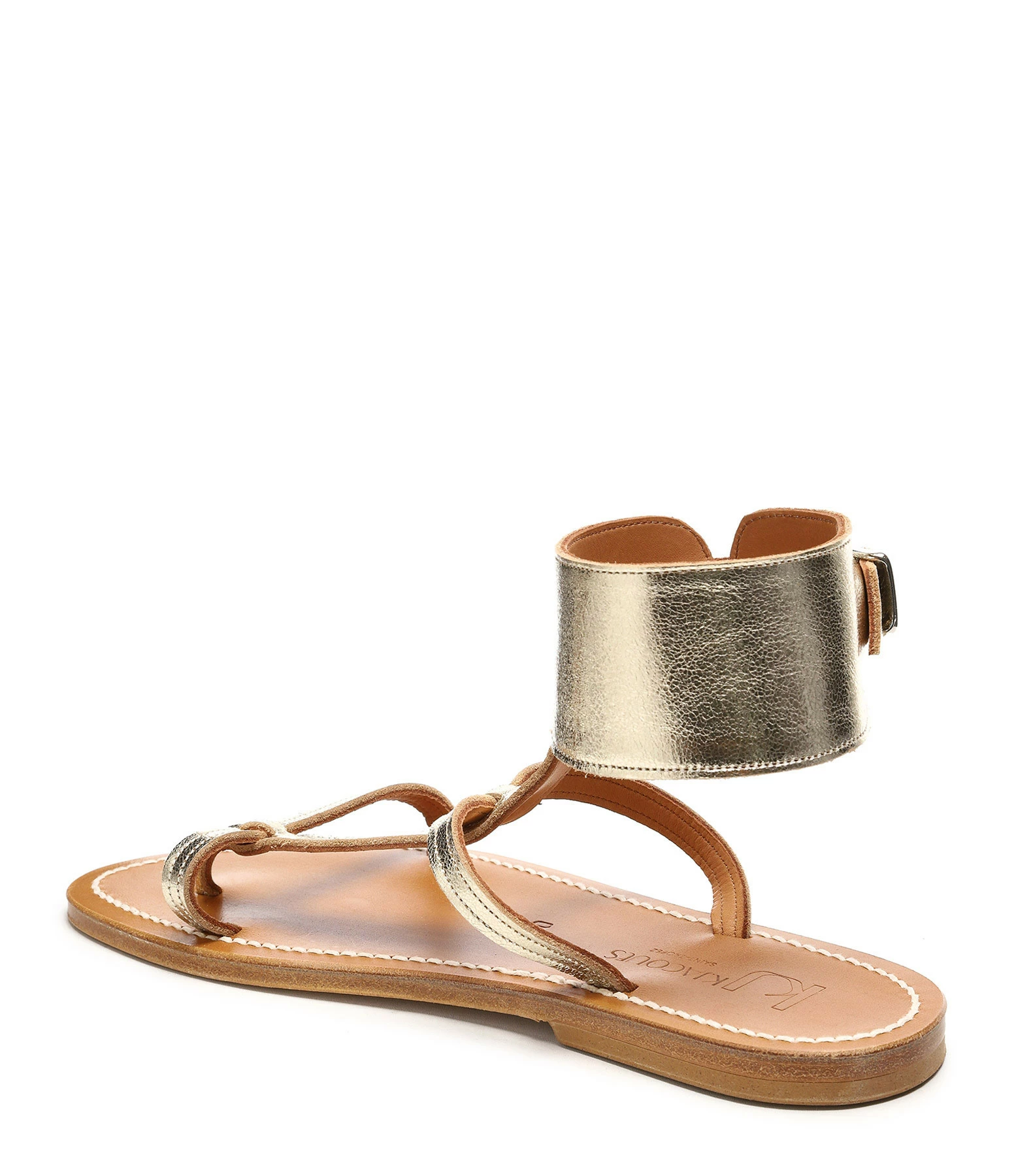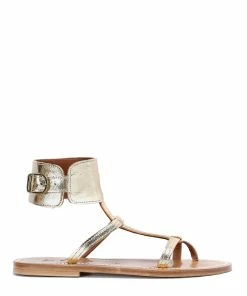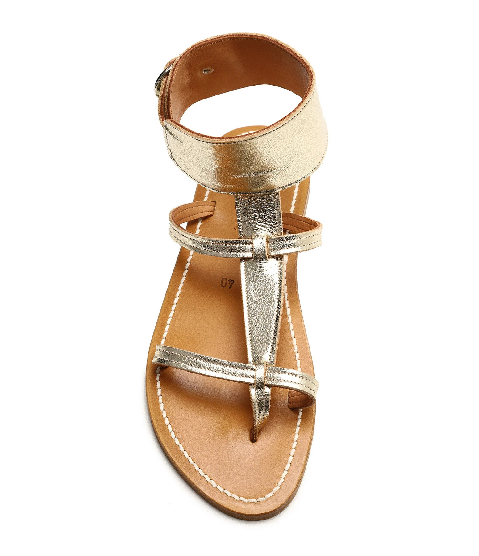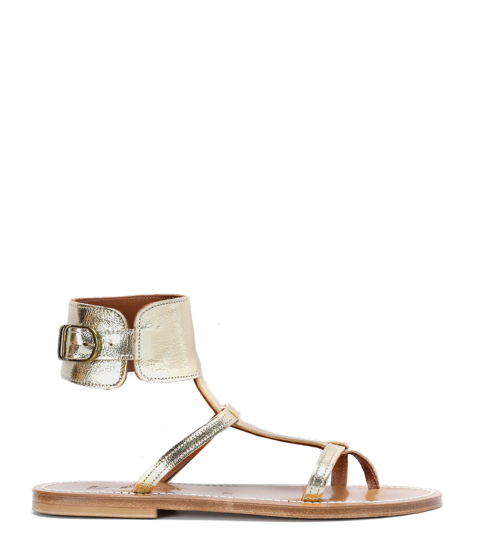 Sandales en cuir laminé doré. Deux brides sur le pied et une large bride réglable autour de la cheville.