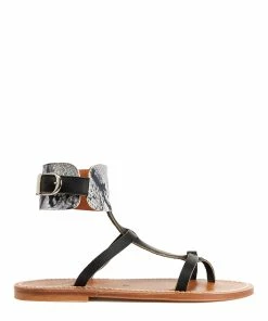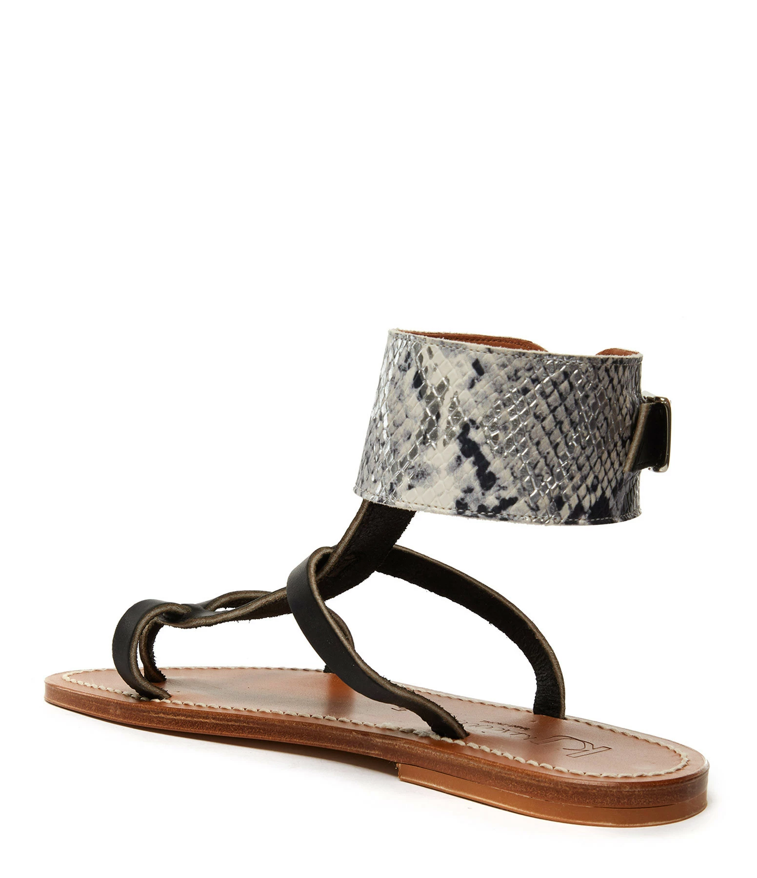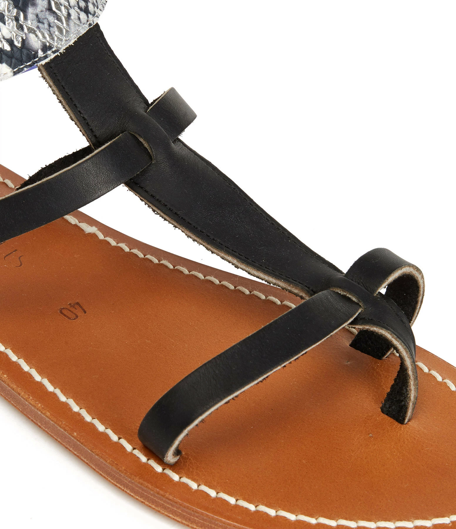 Sandales en cuir noir et argenté texturé façon serpent. Une large bride réglable autour de la cheville.