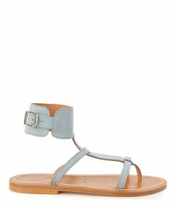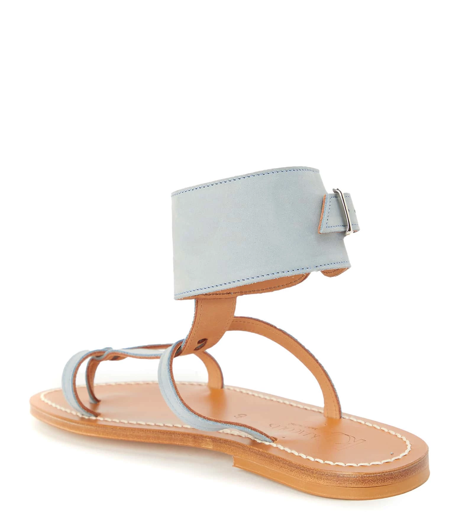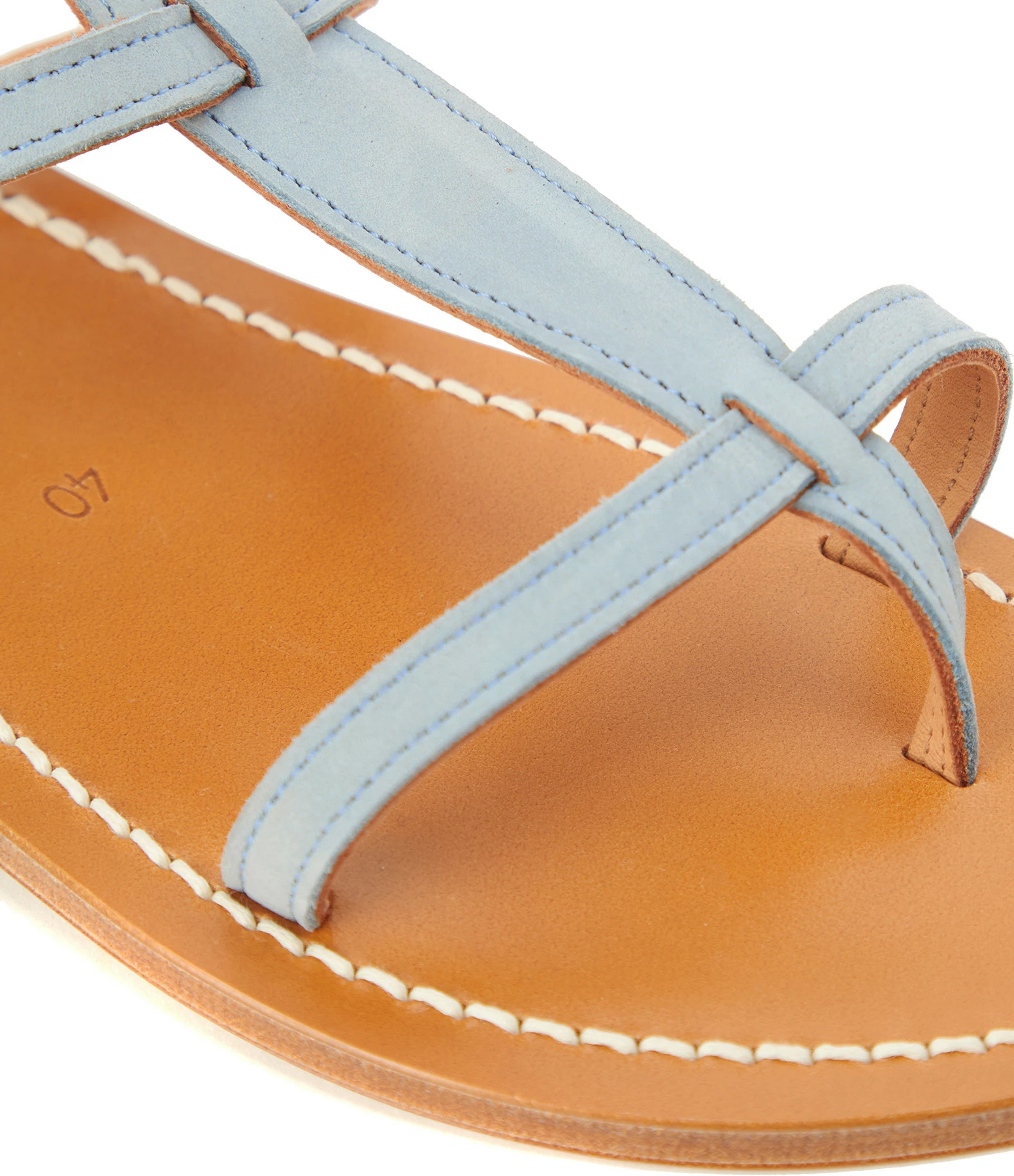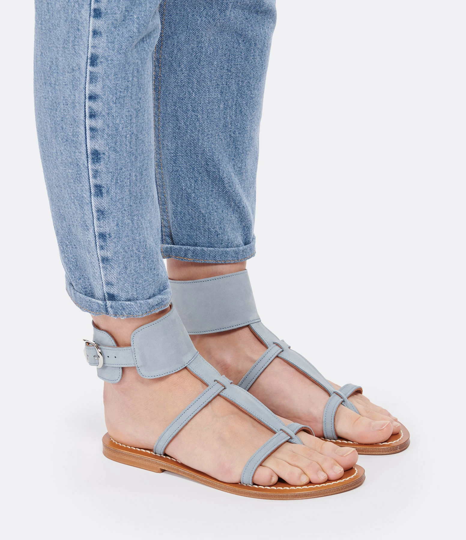 Sandales en cuir bleu. Deux brides sur le pied et une large bride réglable autour de la cheville.