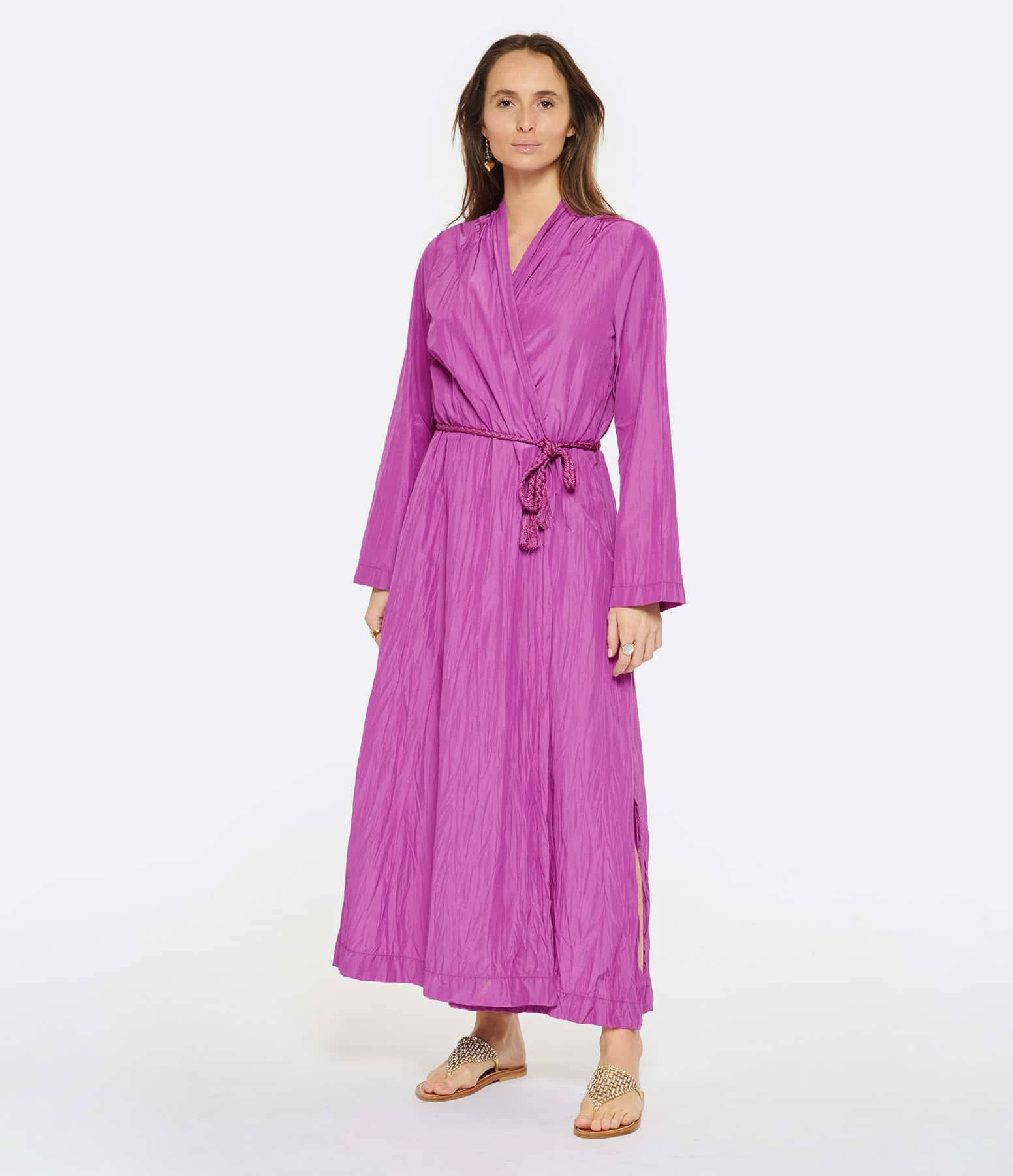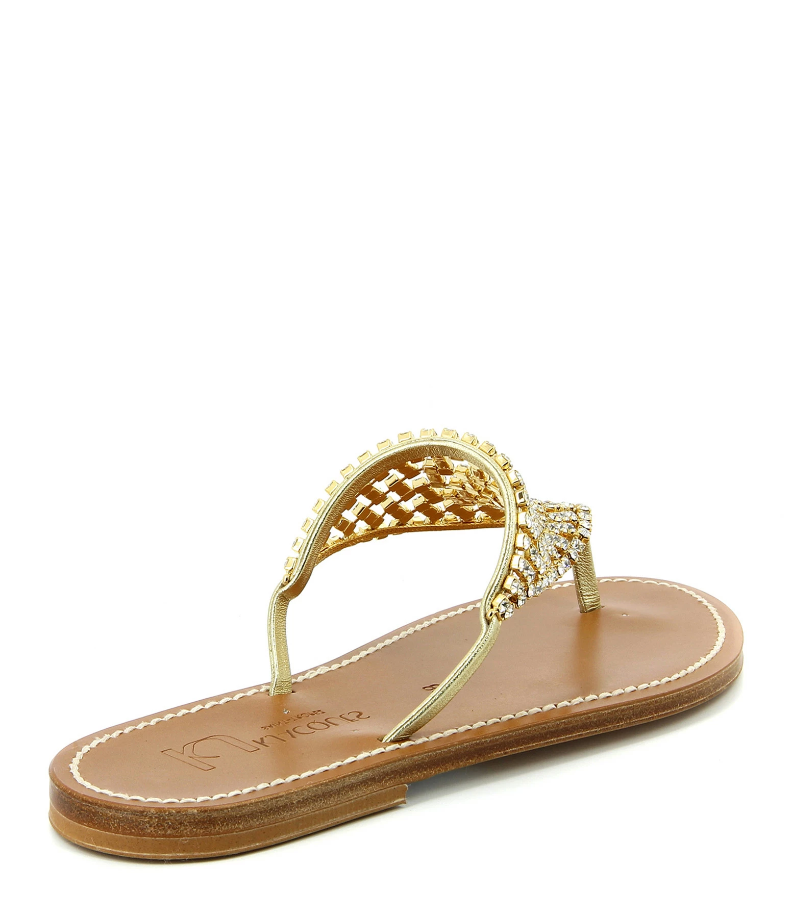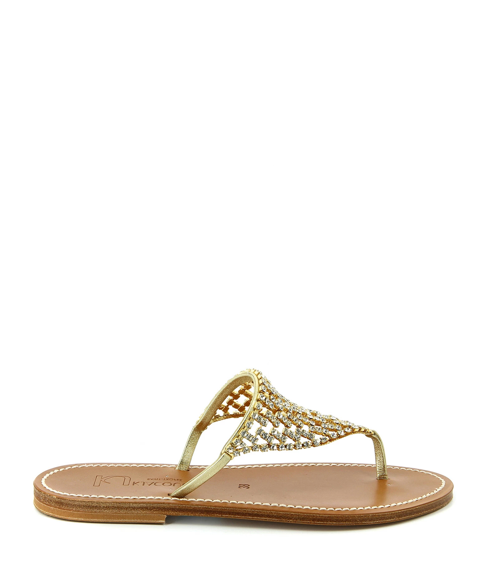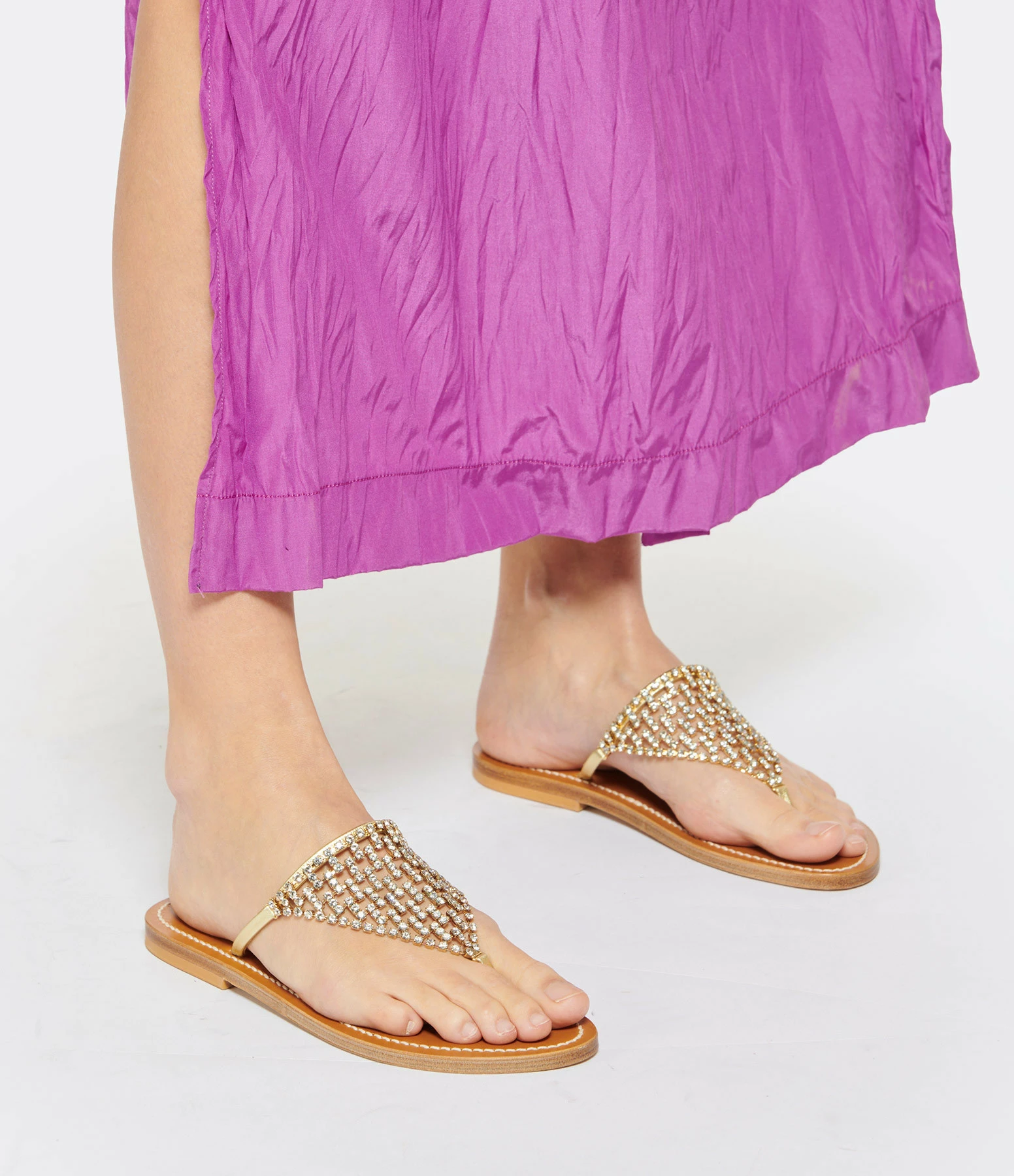 Sandale avec bride lamé doré autour du pied et cristaux sur l’avant du pied.