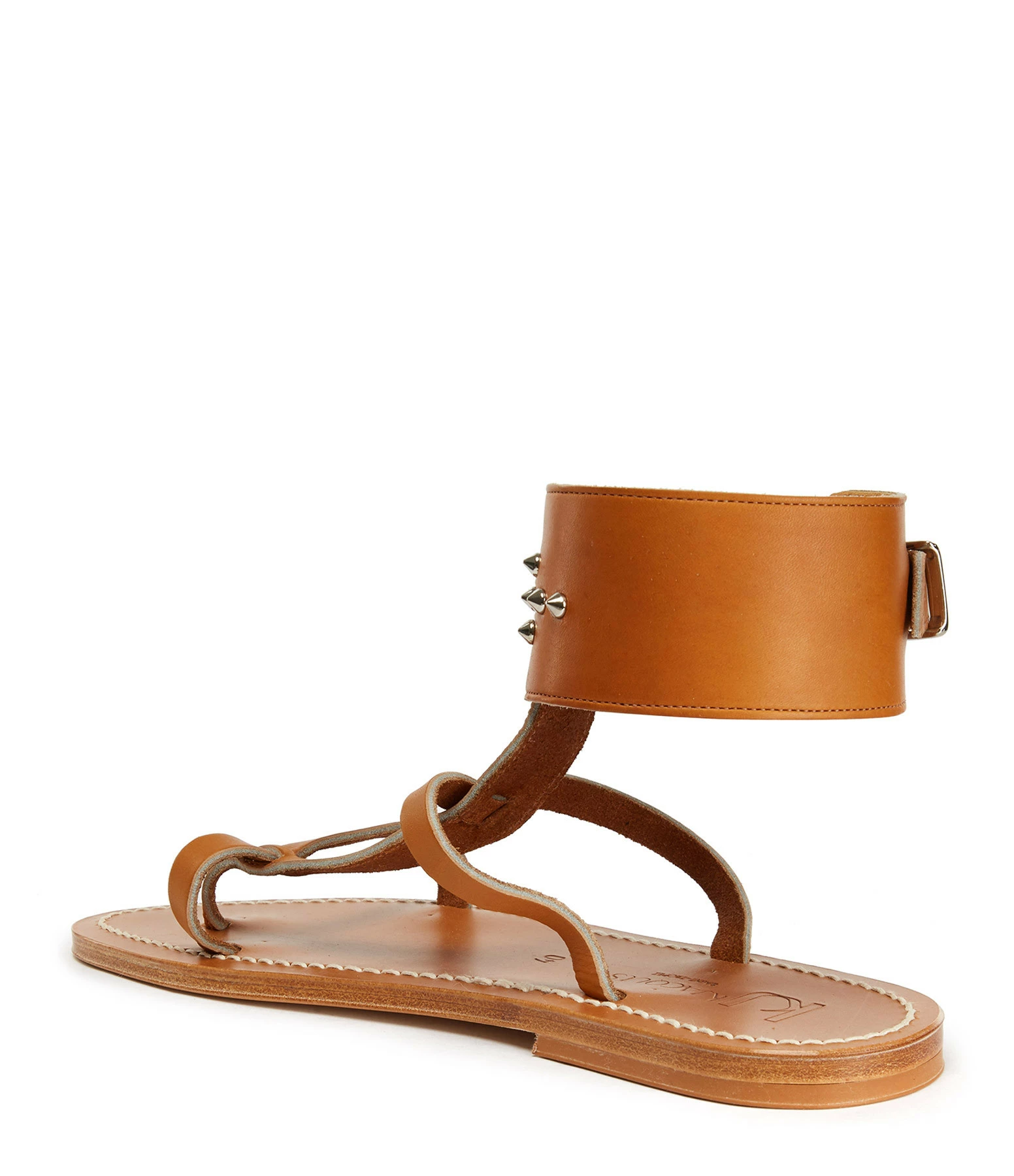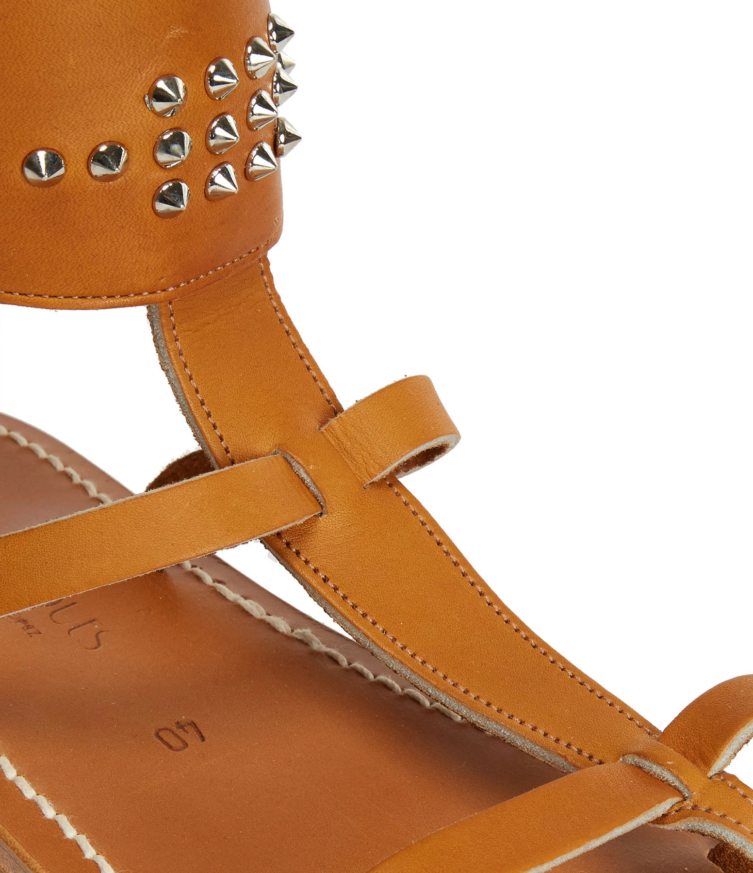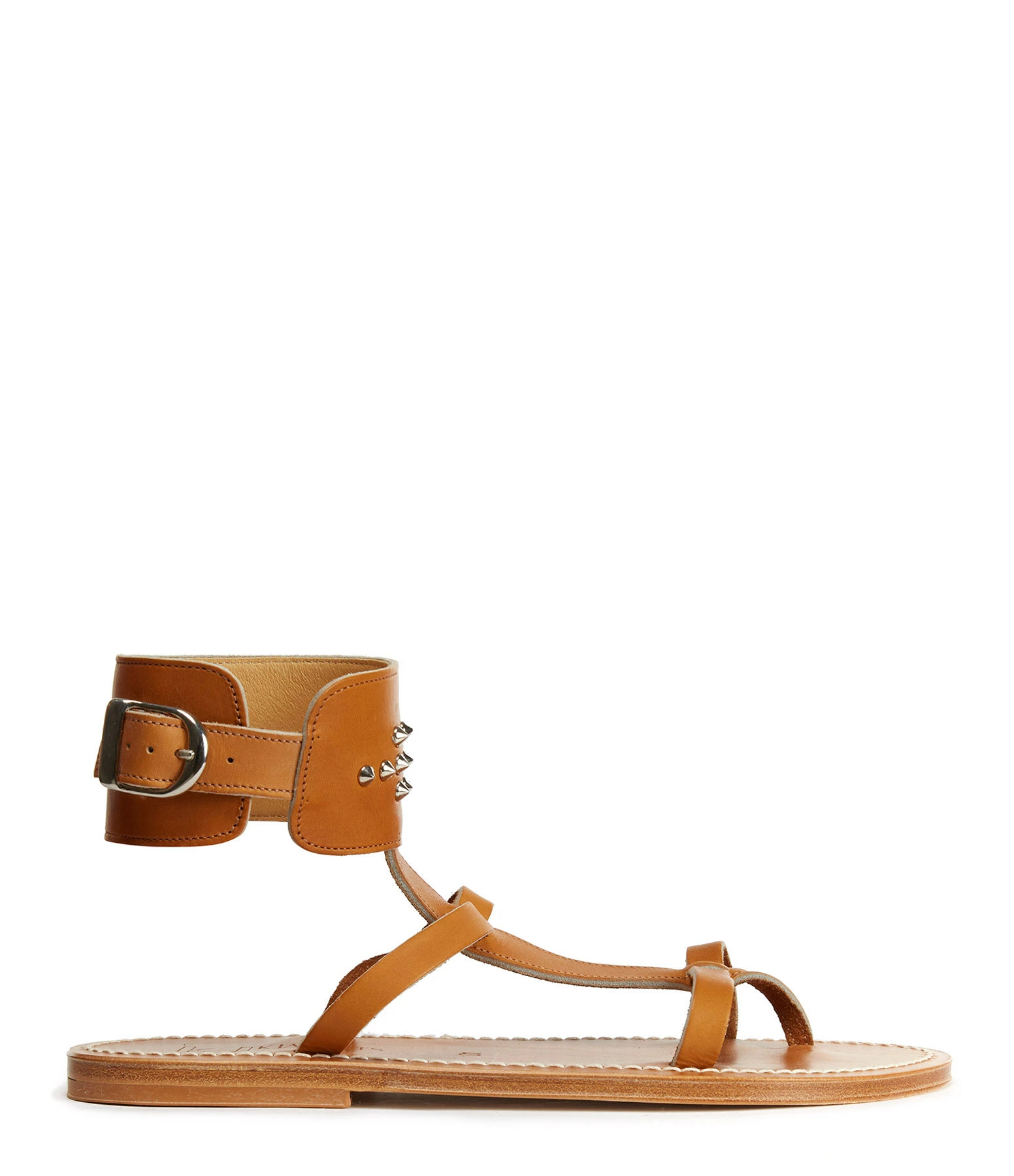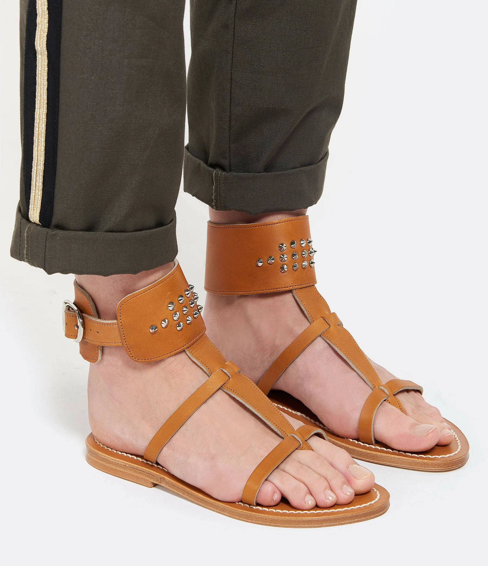 Sandales en cuir. Deux brides sur le pied et une large bride réglable autour de la cheville ornée de rivets métalliques.