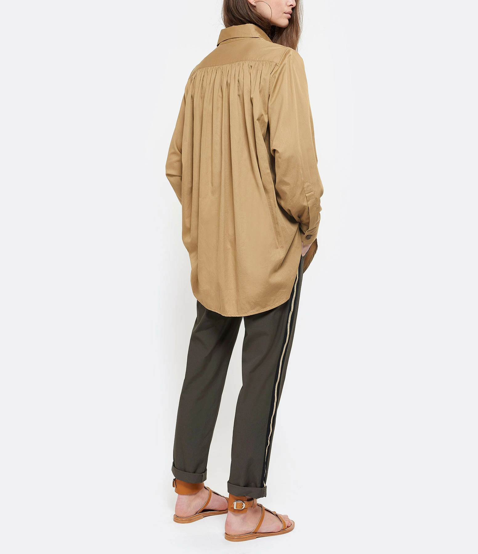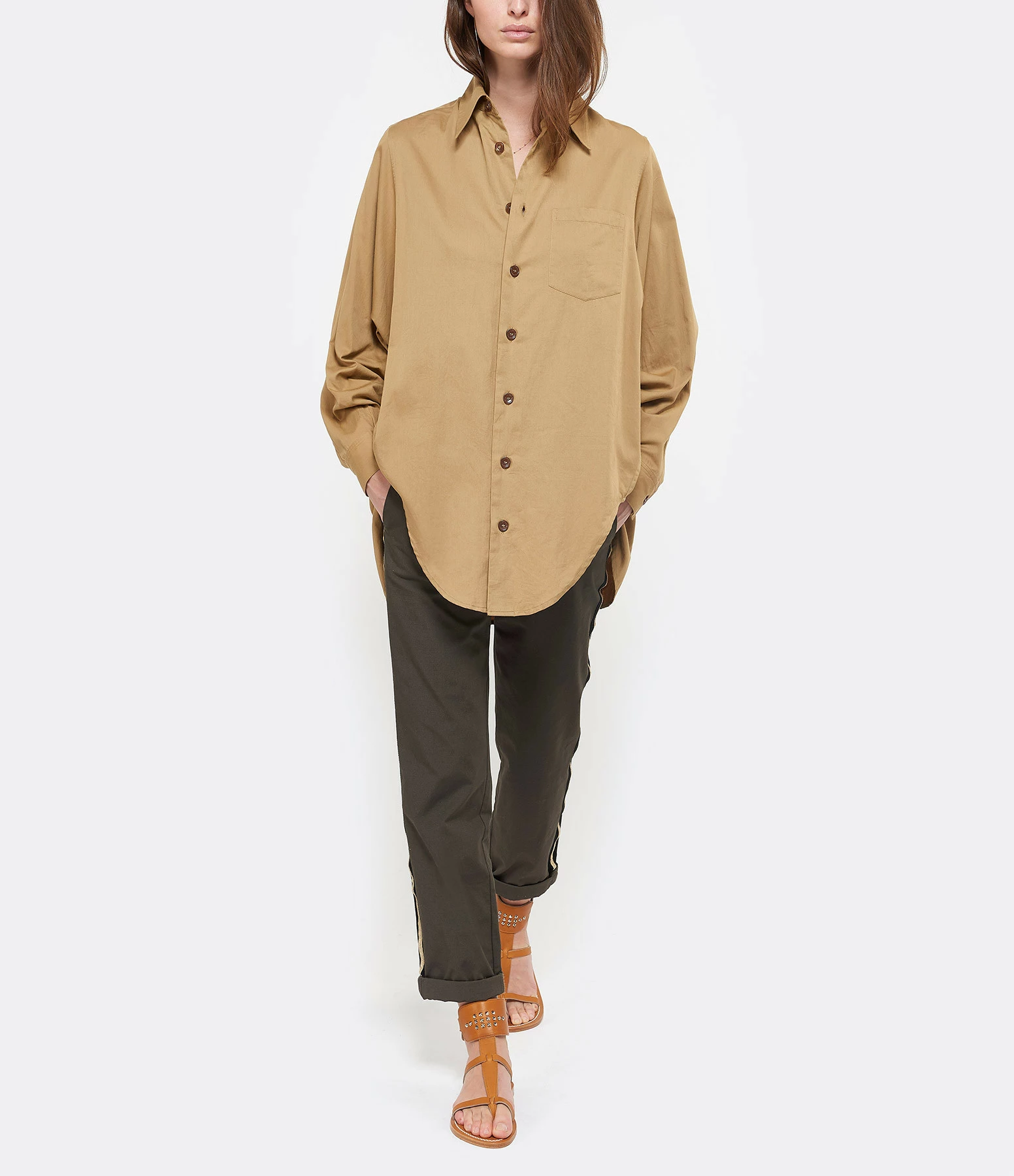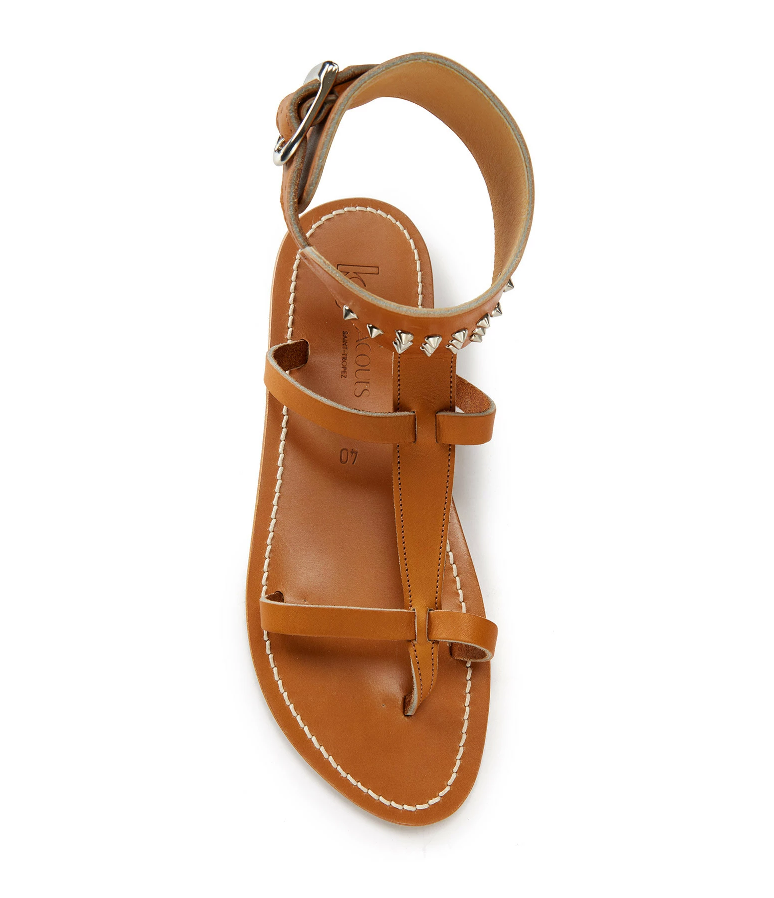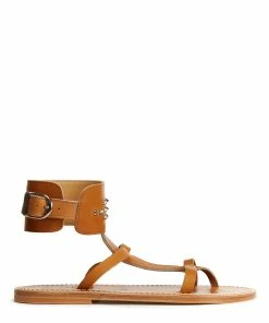 Sandales en cuir. Deux brides sur le pied et une large bride réglable autour de la cheville ornée de rivets métalliques.
