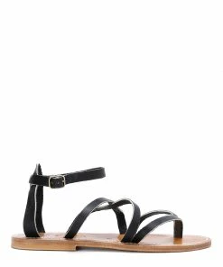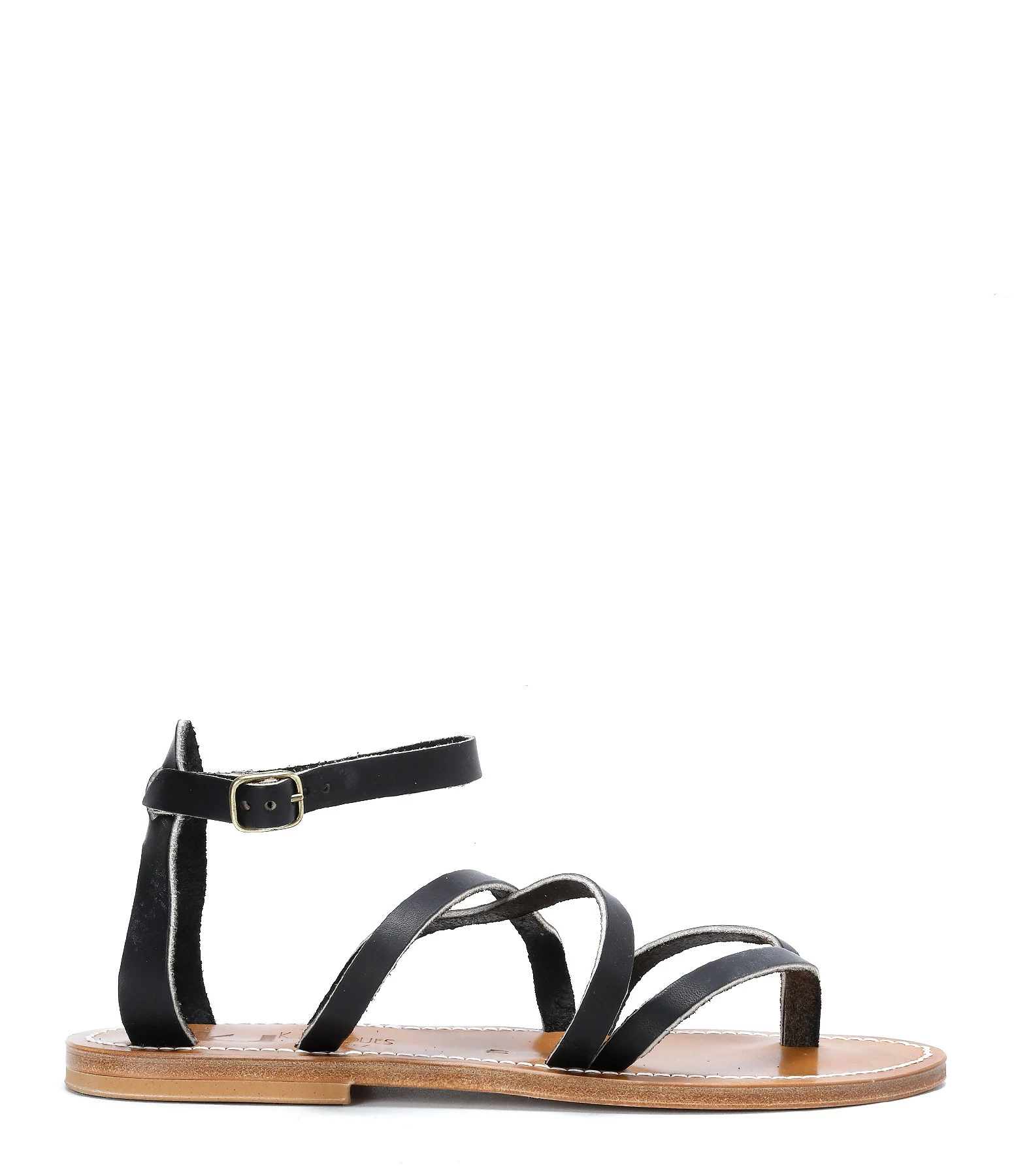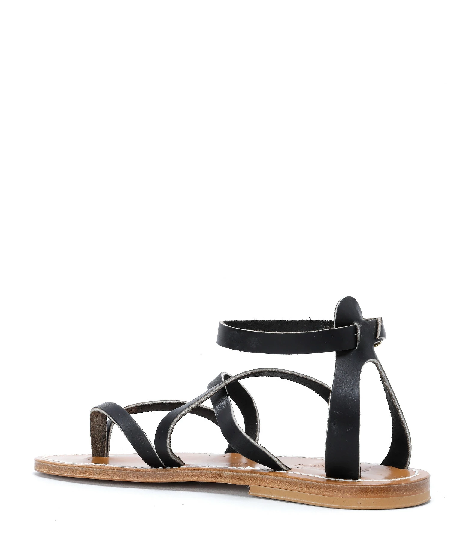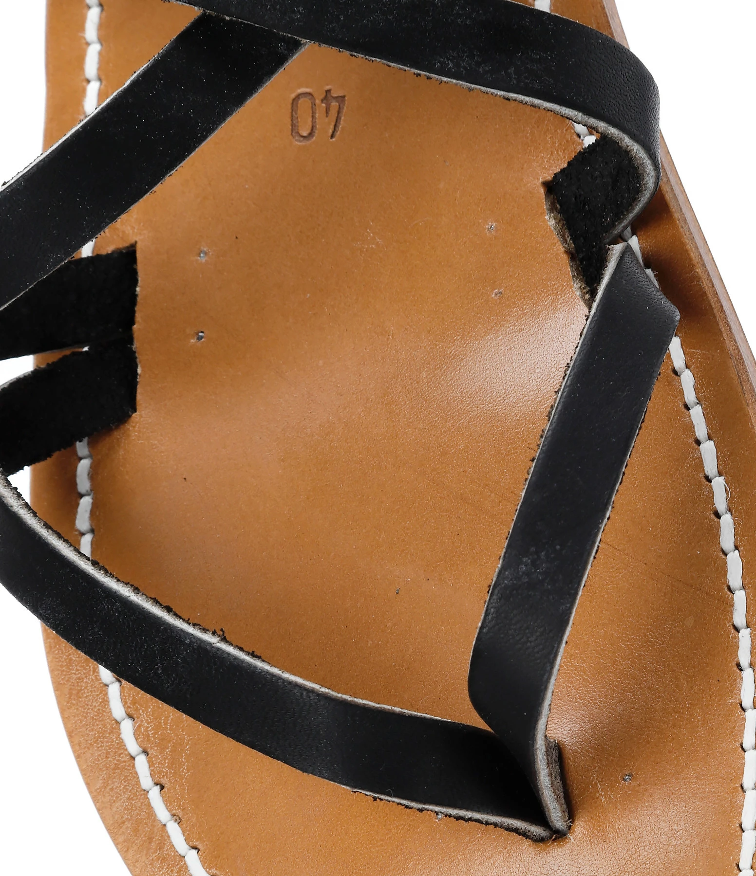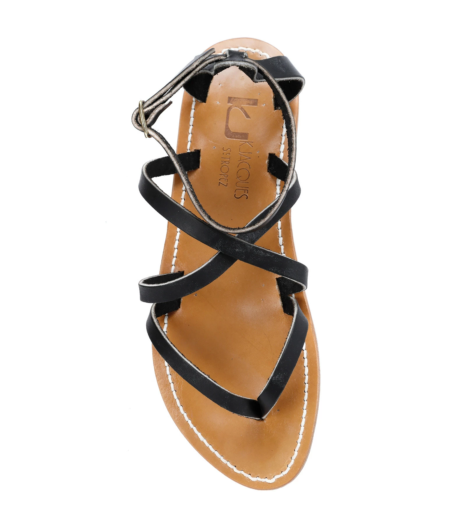 Sandales multi-brides en cuir mat noir, se croise sur le pied. Une bride réglable autour de la cheville. Fabriquées à la main en France à Saint-Tropez.