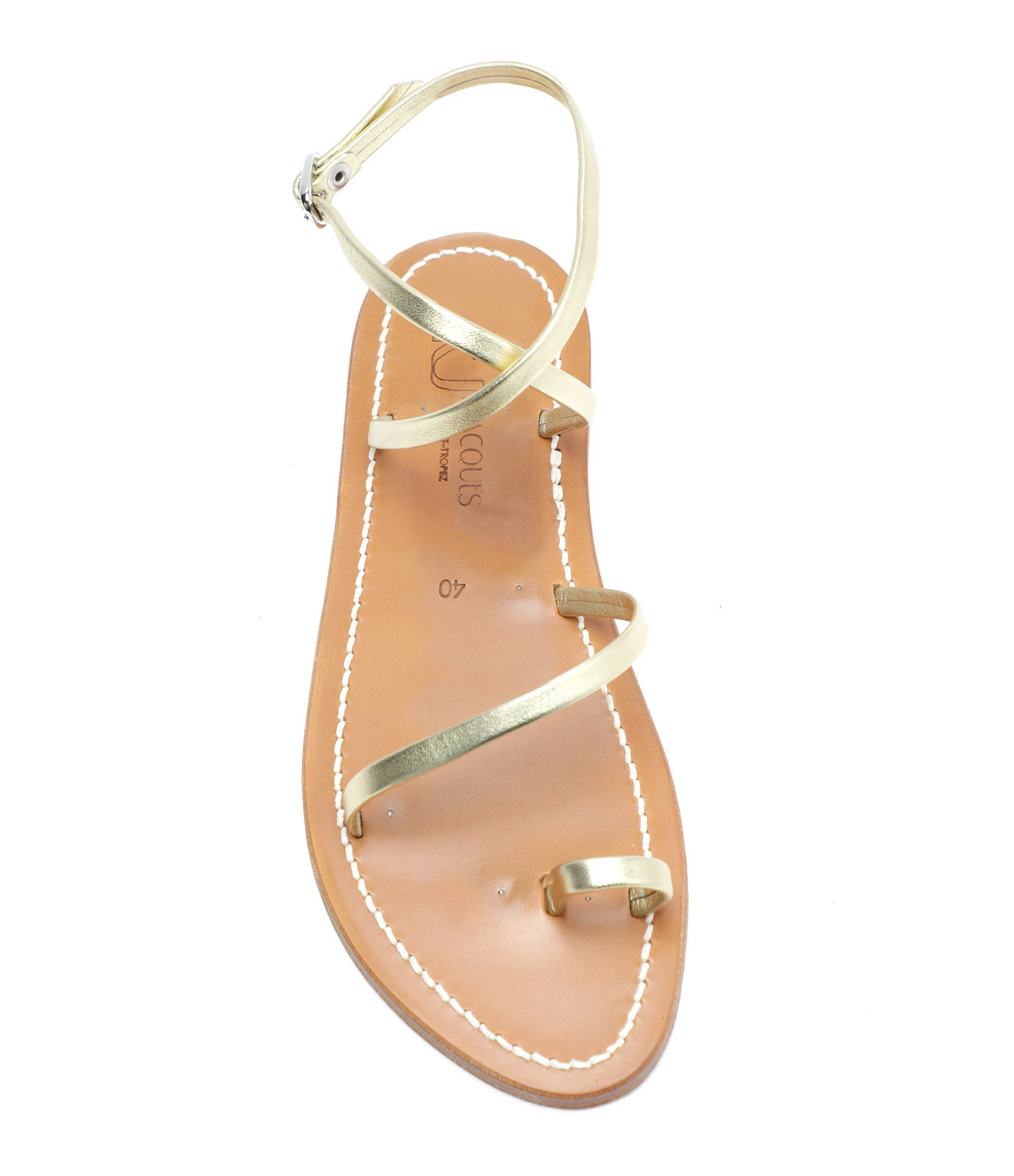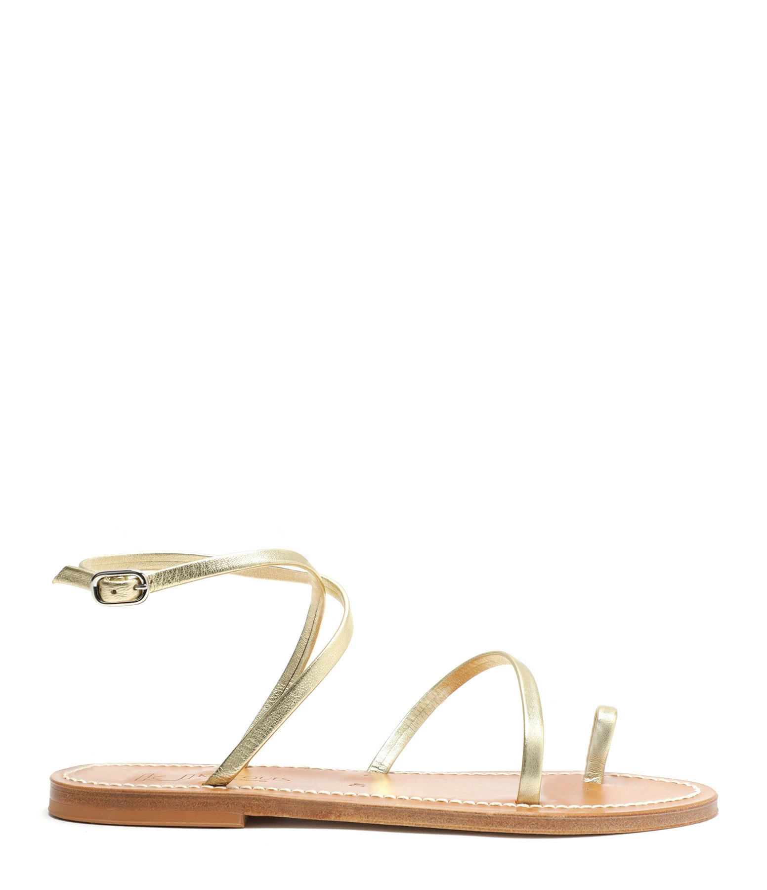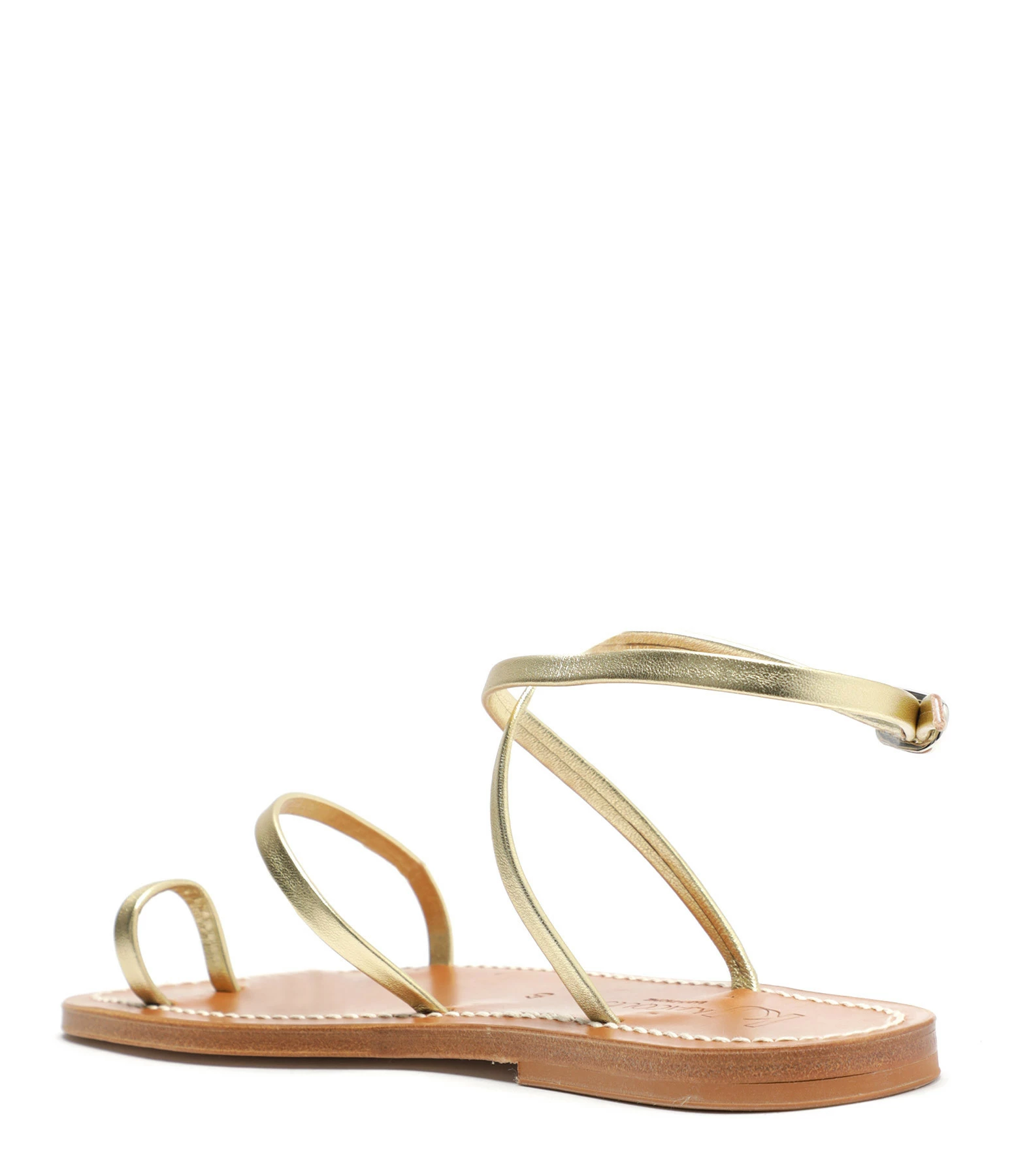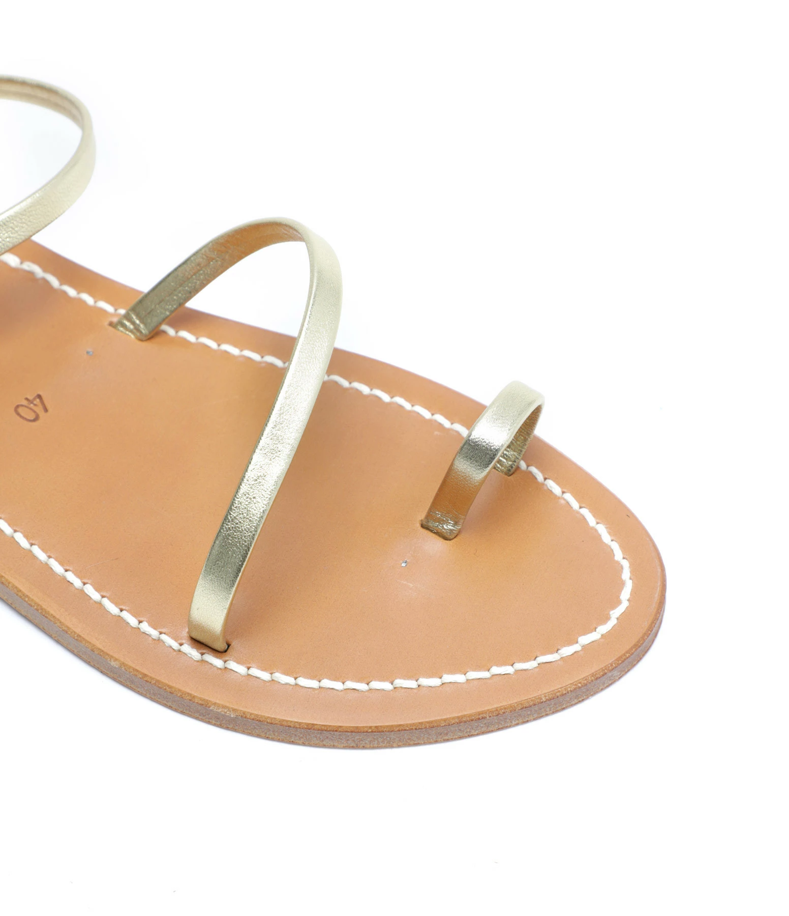 Sandales en cuir. Deux brides sur le pied et une longue bride double-tour réglable autour de la cheville en cuir doré.