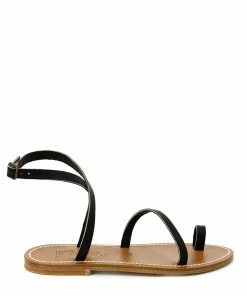 Sandales en cuir. Deux brides sur le pied et une longue bride double-tour réglable autour de la cheville en cuir noir.