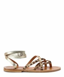 Sandales multi-brides, en cuir pony imprimé léopard. Bride dorée à attacher autour de la cheville.