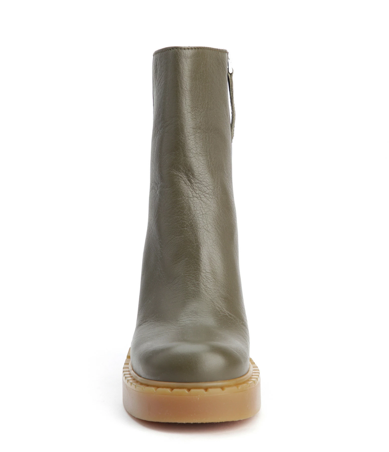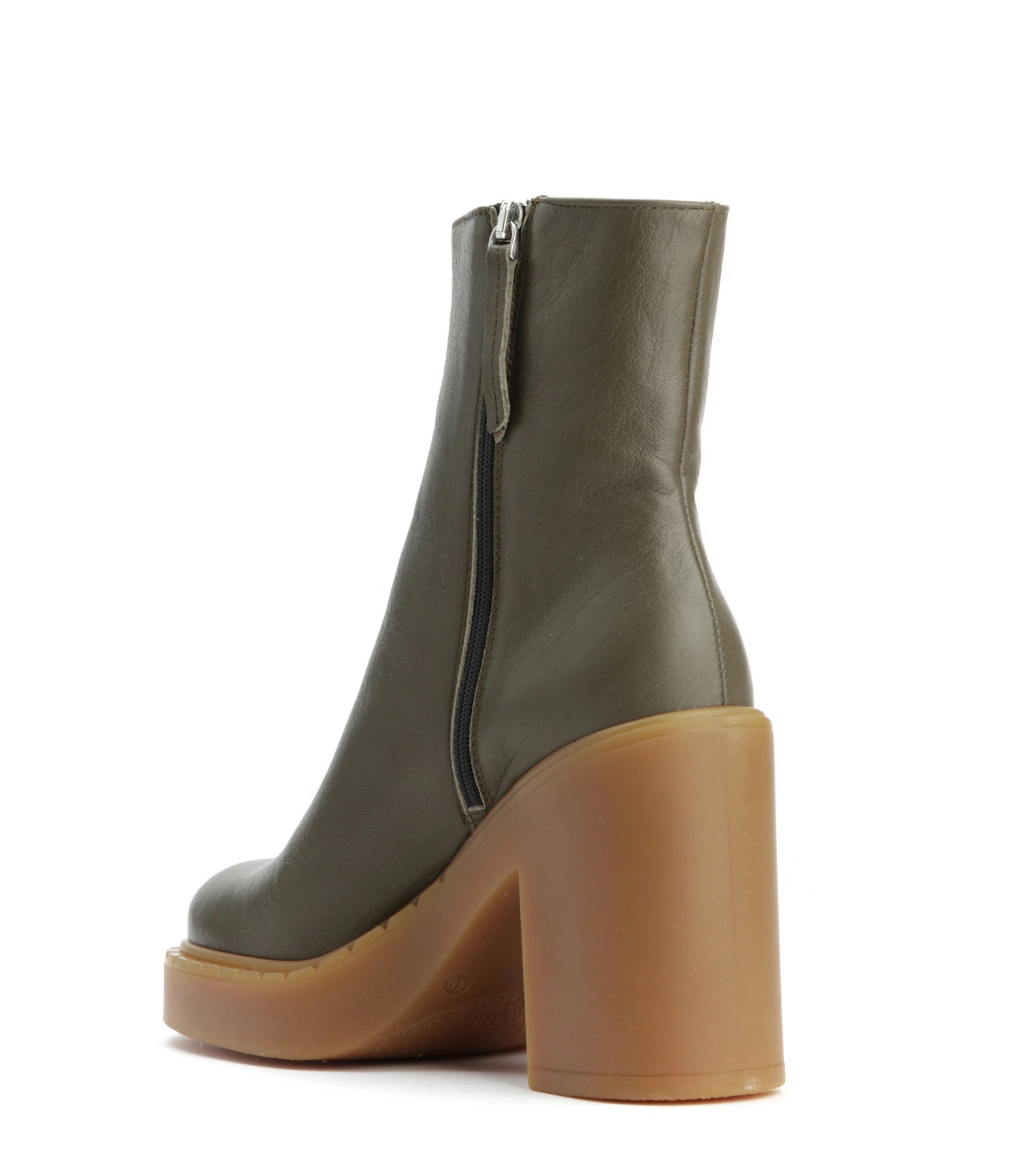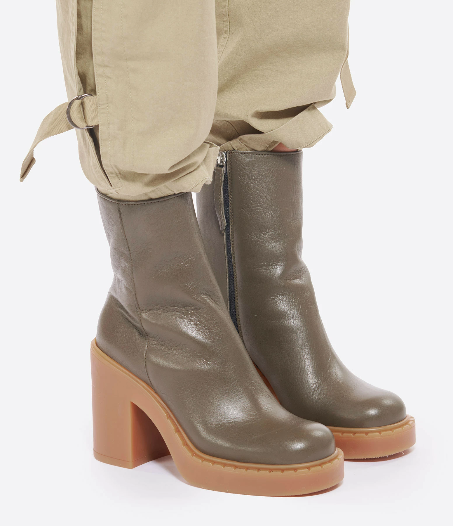 Bottines à talons en cuir lisse kaki. Talons blocs. Bouts arrondis avec trépointes prononcées. Fermeture zippée sur le côté.