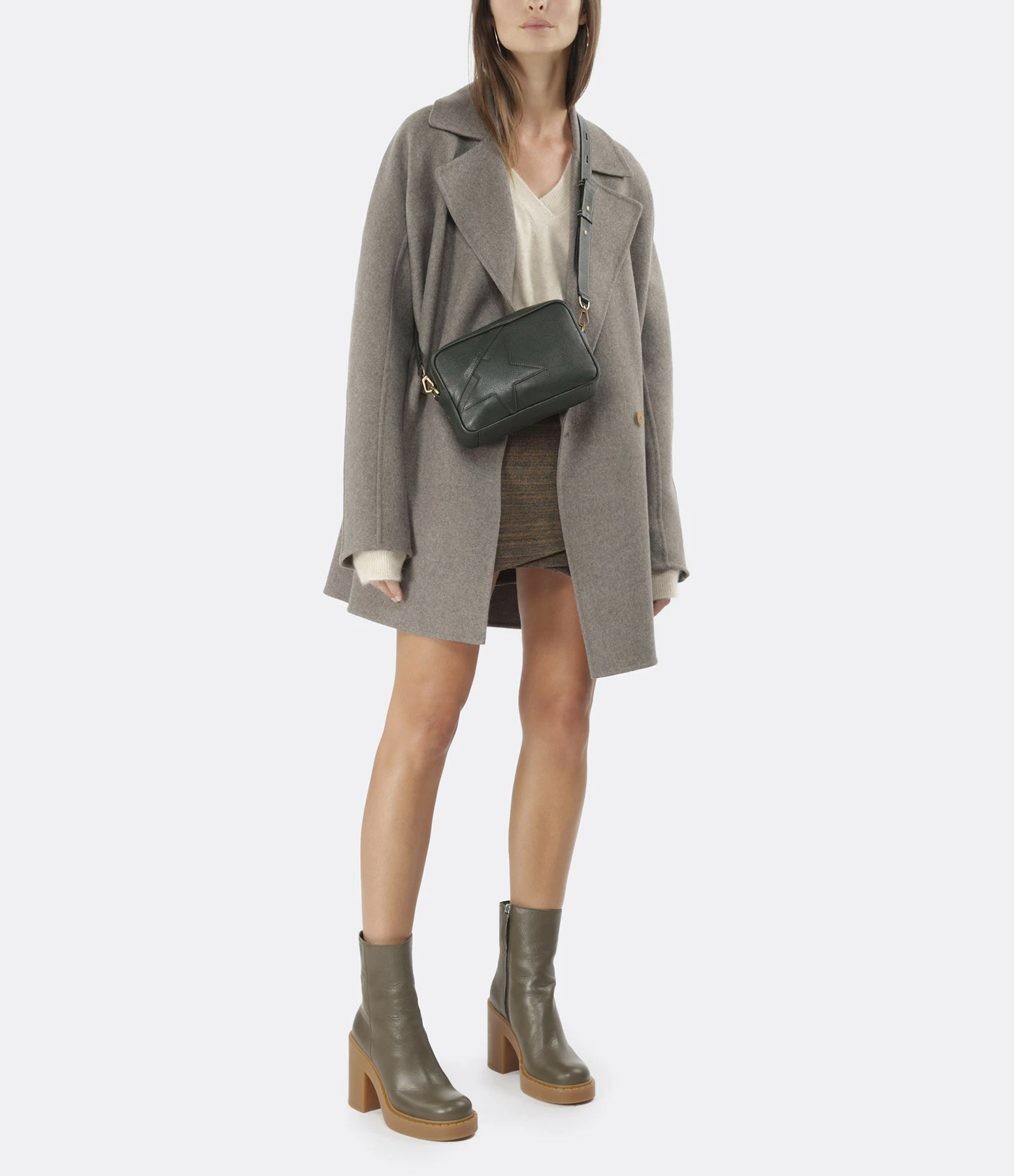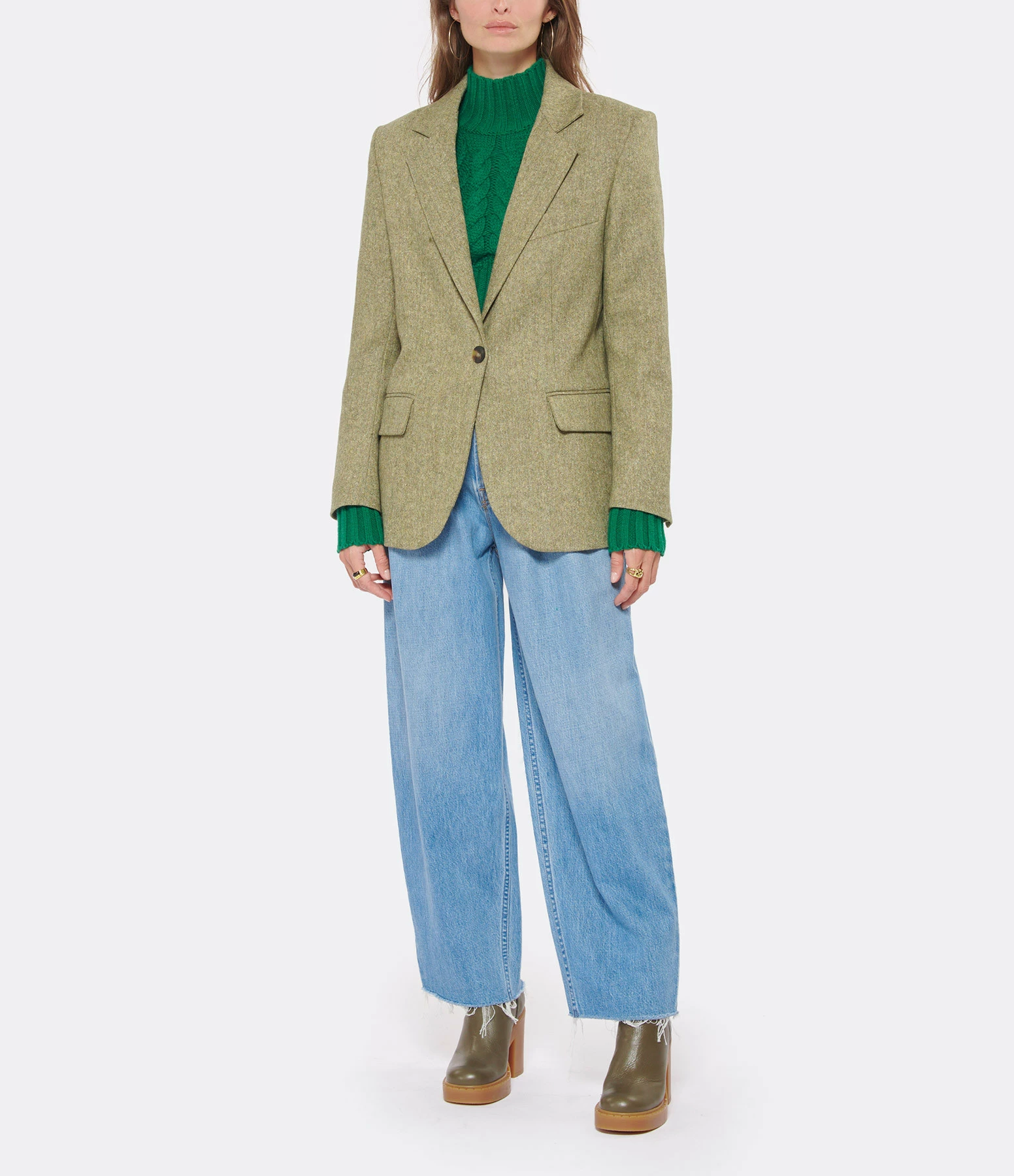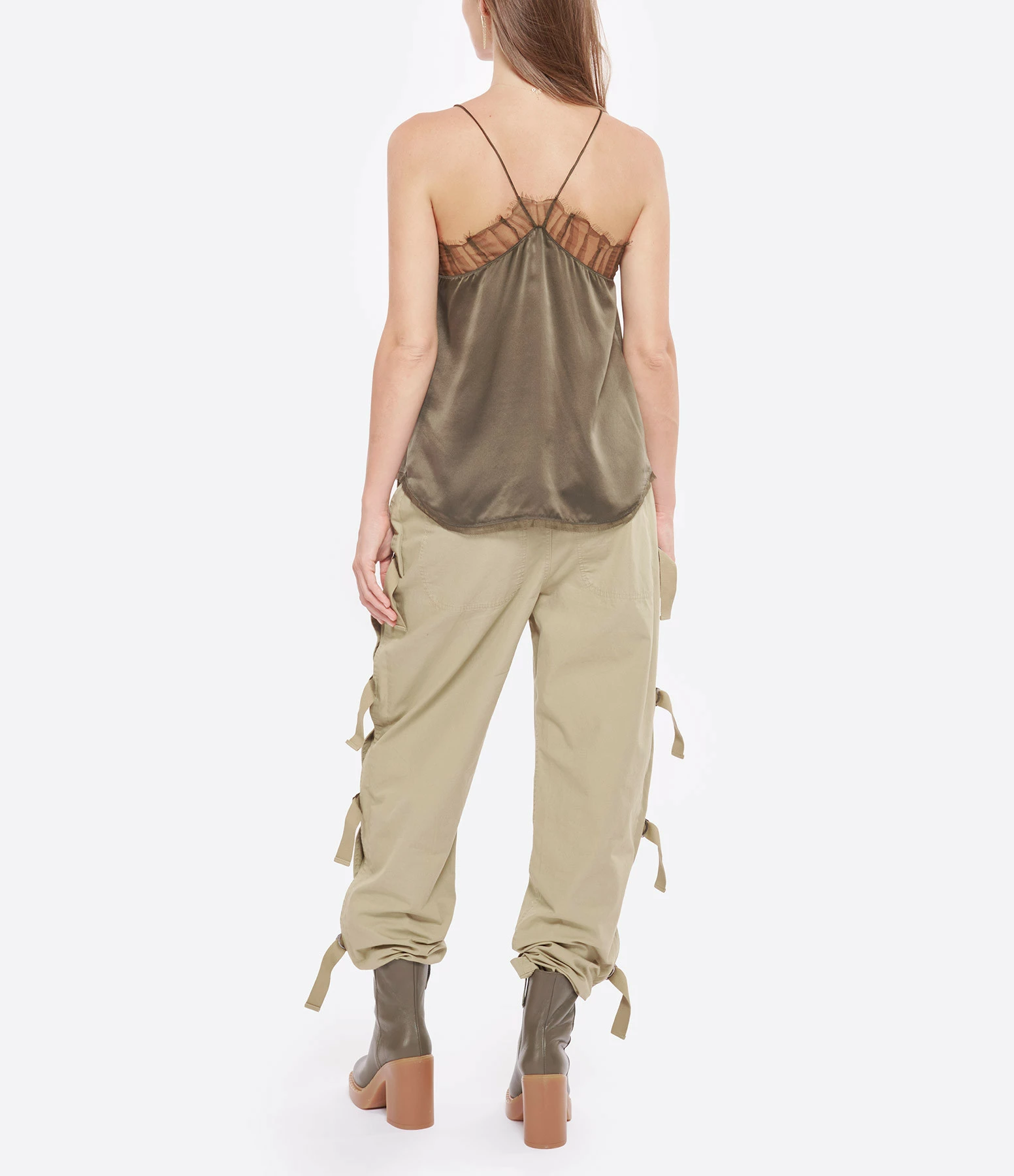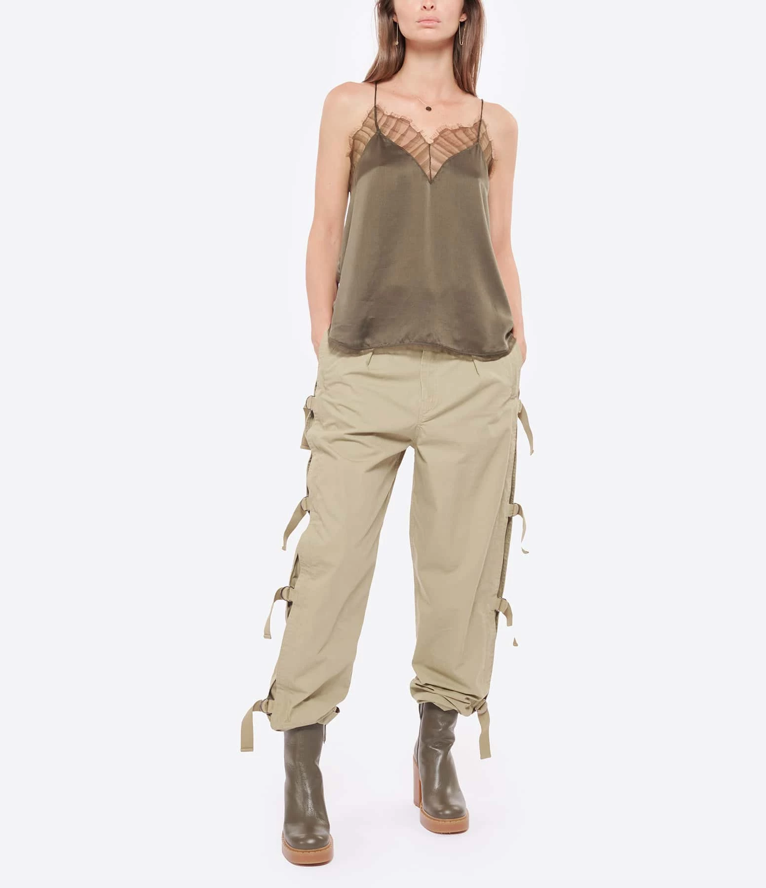 Bottines à talons en cuir lisse kaki. Talons blocs. Bouts arrondis avec trépointes prononcées. Fermeture zippée sur le côté.