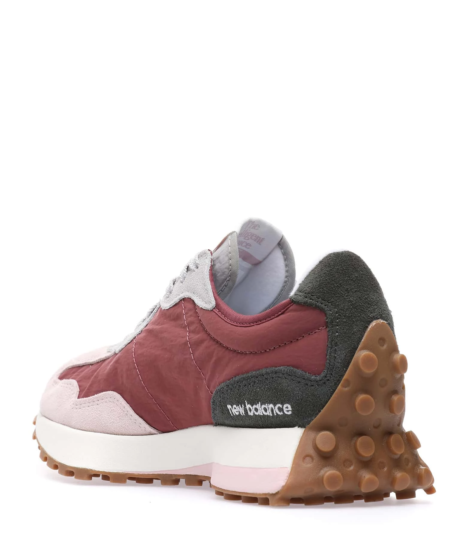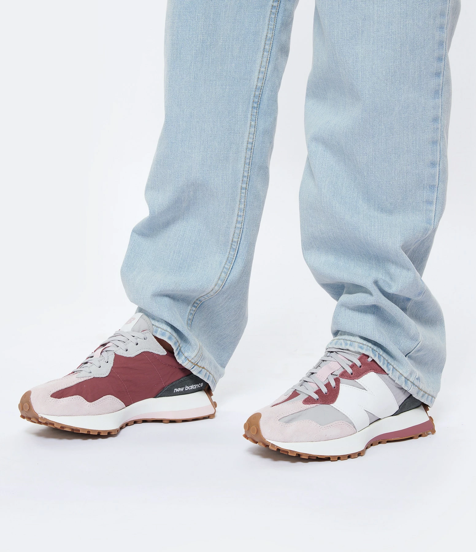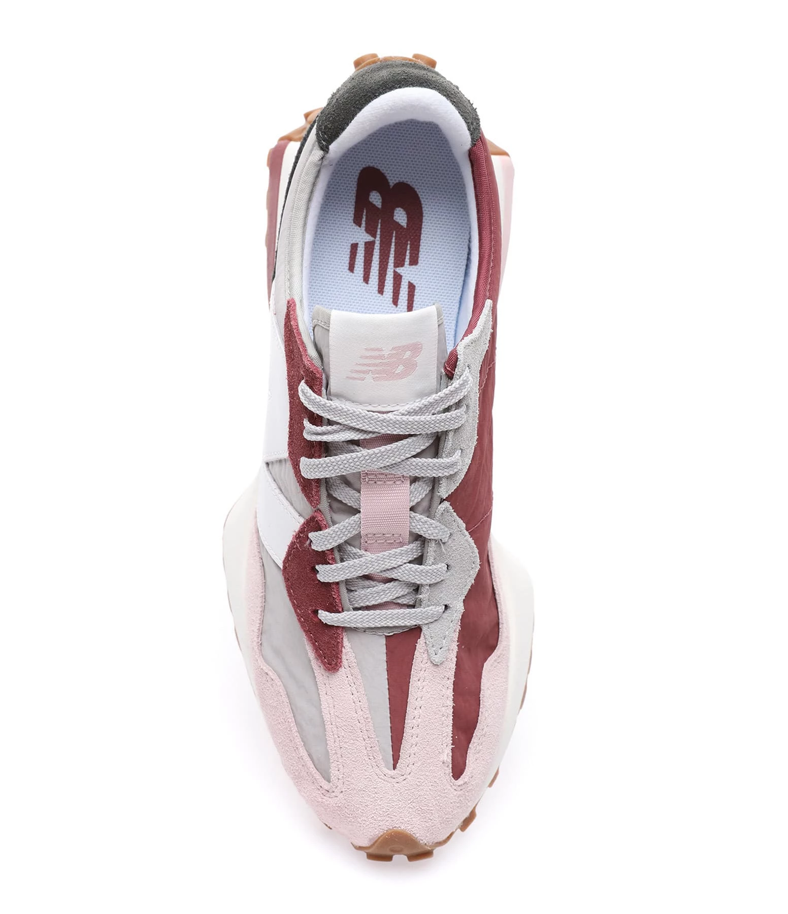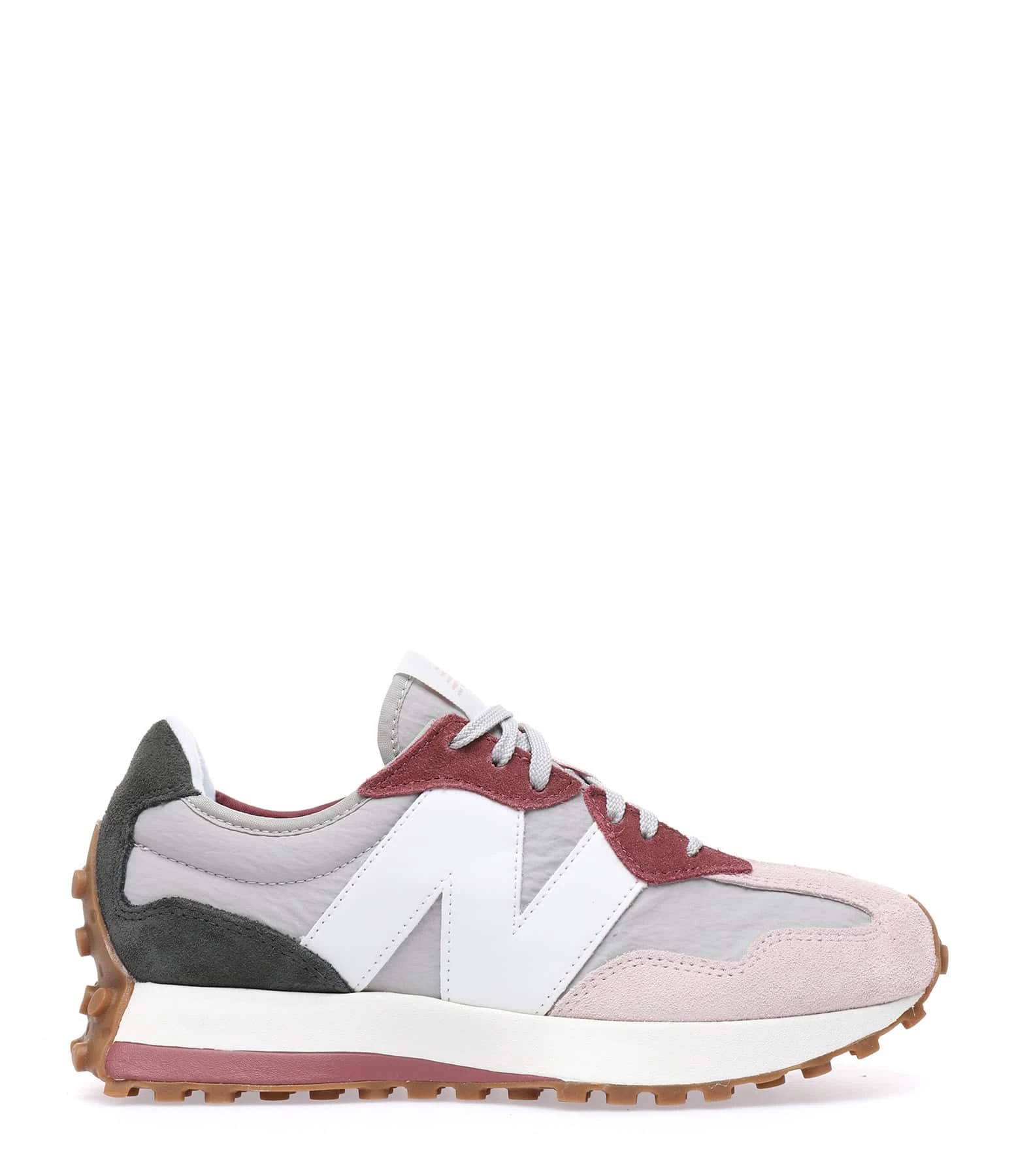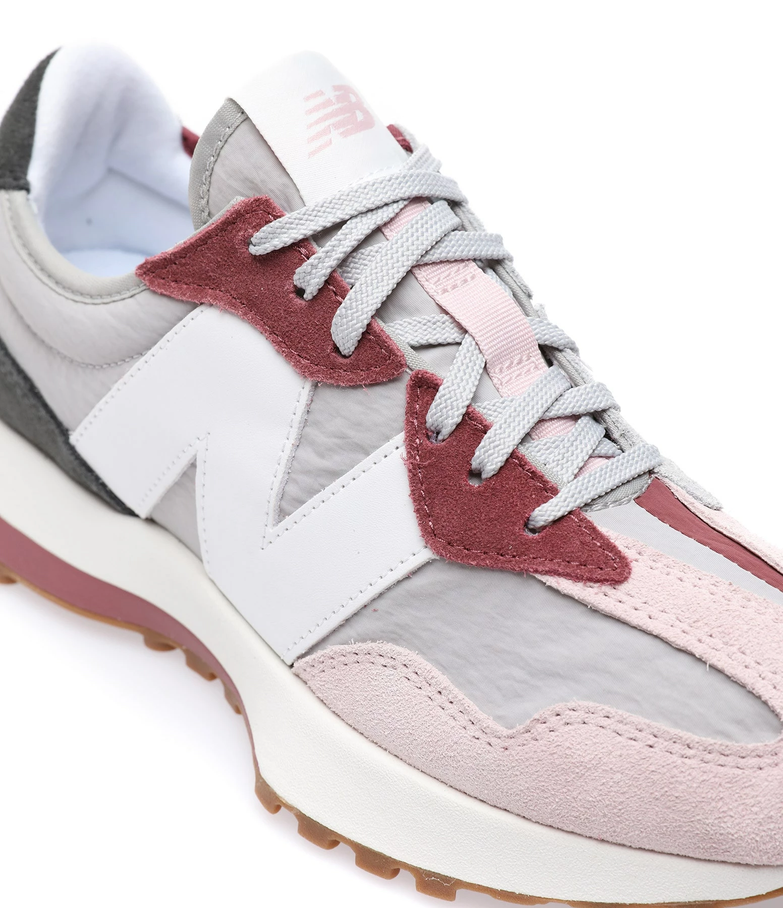 Baskets bi matière daim et toile gris, violet et rose. Lacets gris. Tige en toile grise. Renfort talon en daim gris. Écusson du logo blanc.