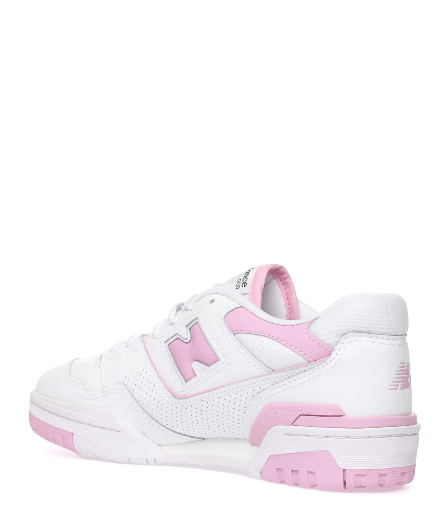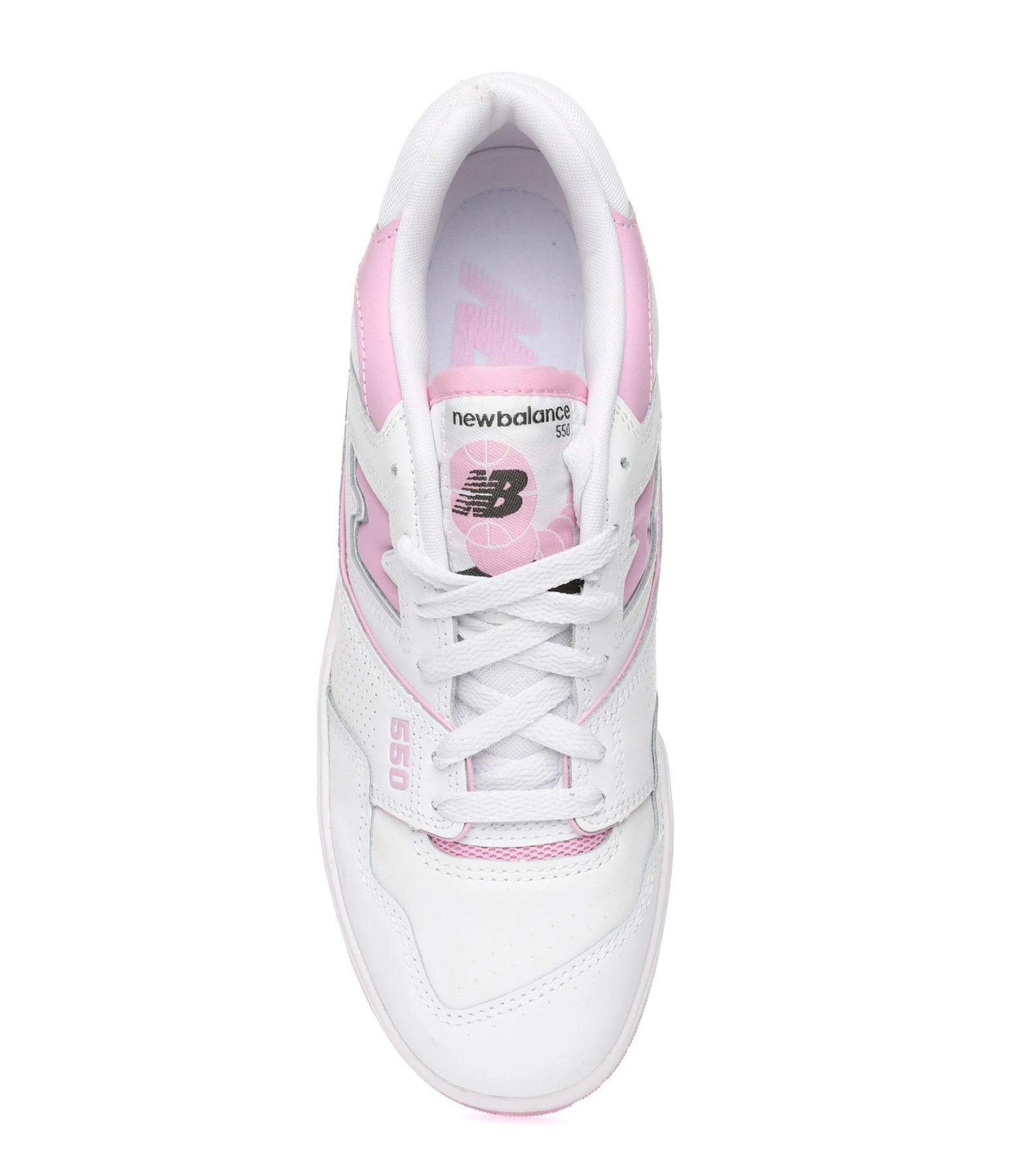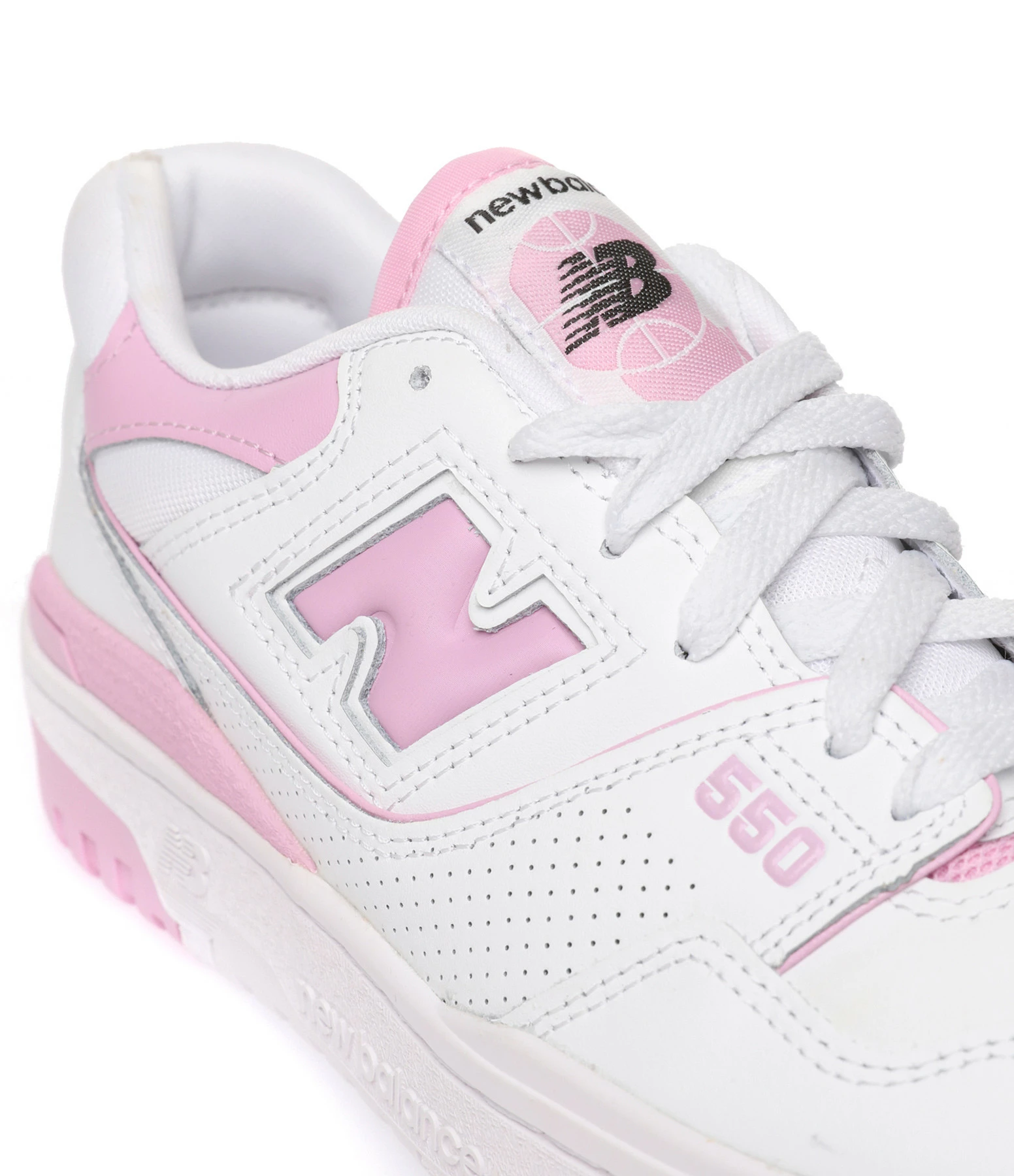 Baskets basses en cuir lisse et perforé blanc. Détails rose. Lacets blancs. Semelle extérieure blanche et rose.