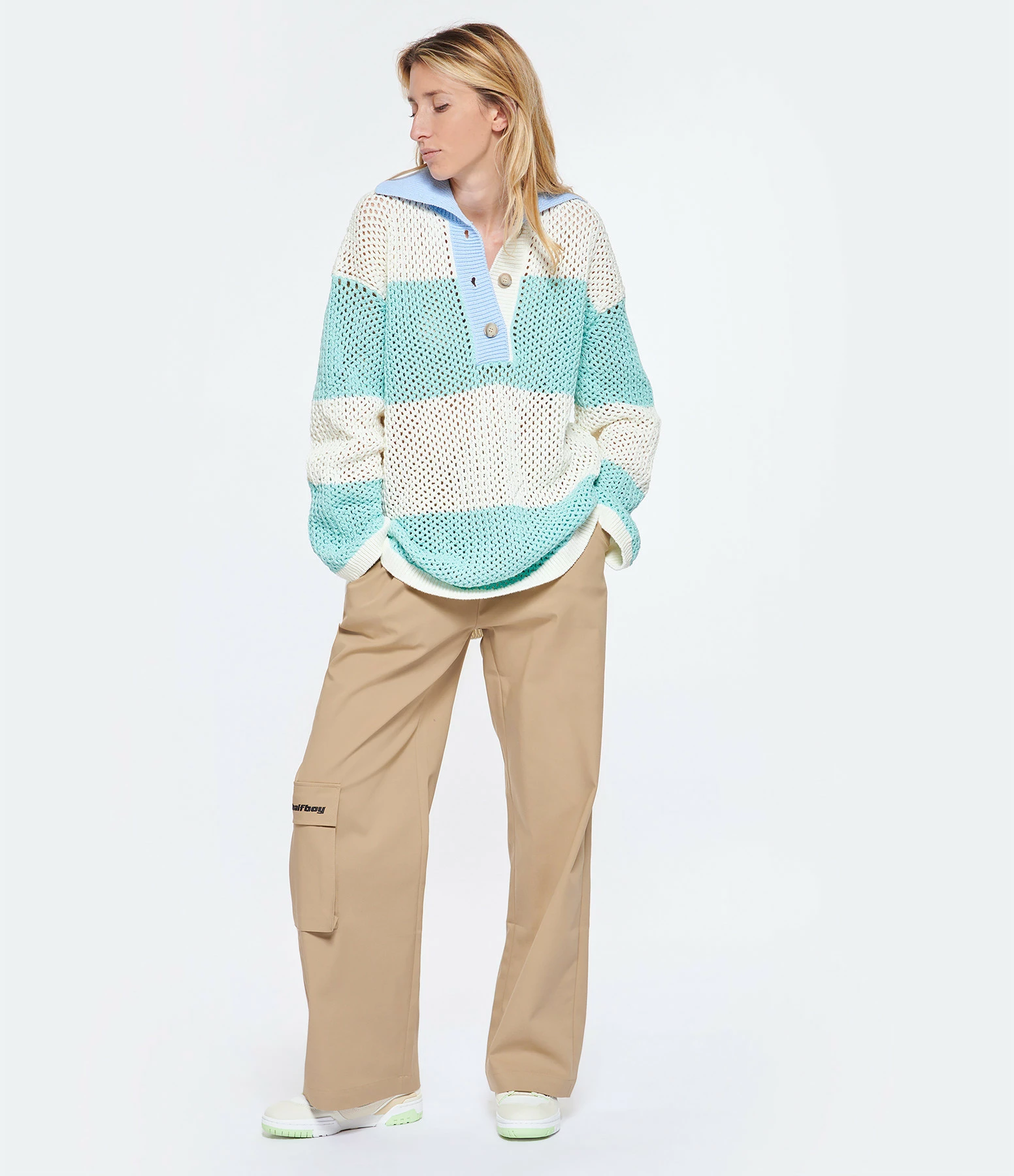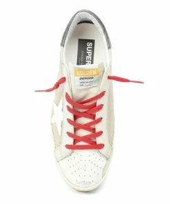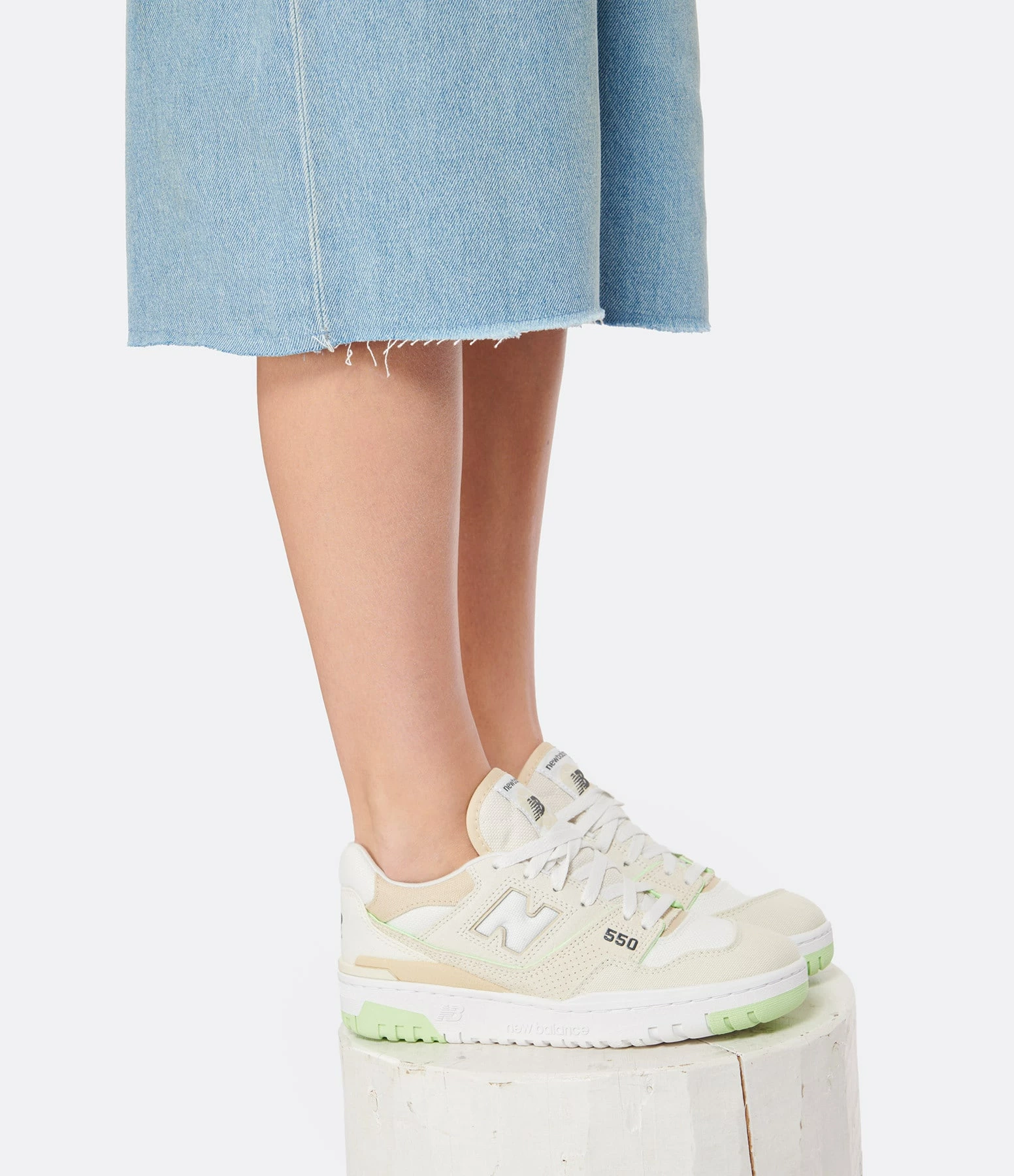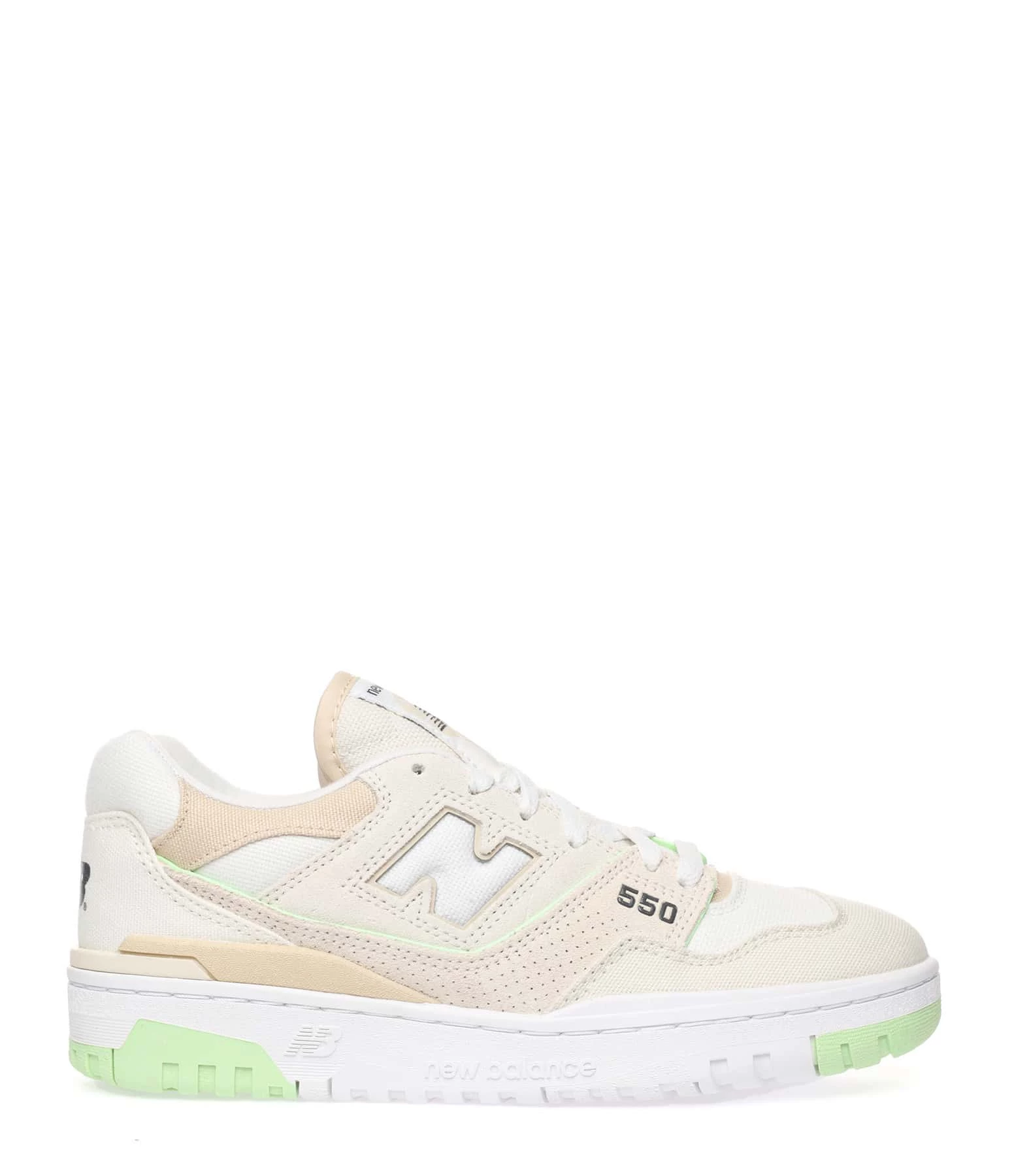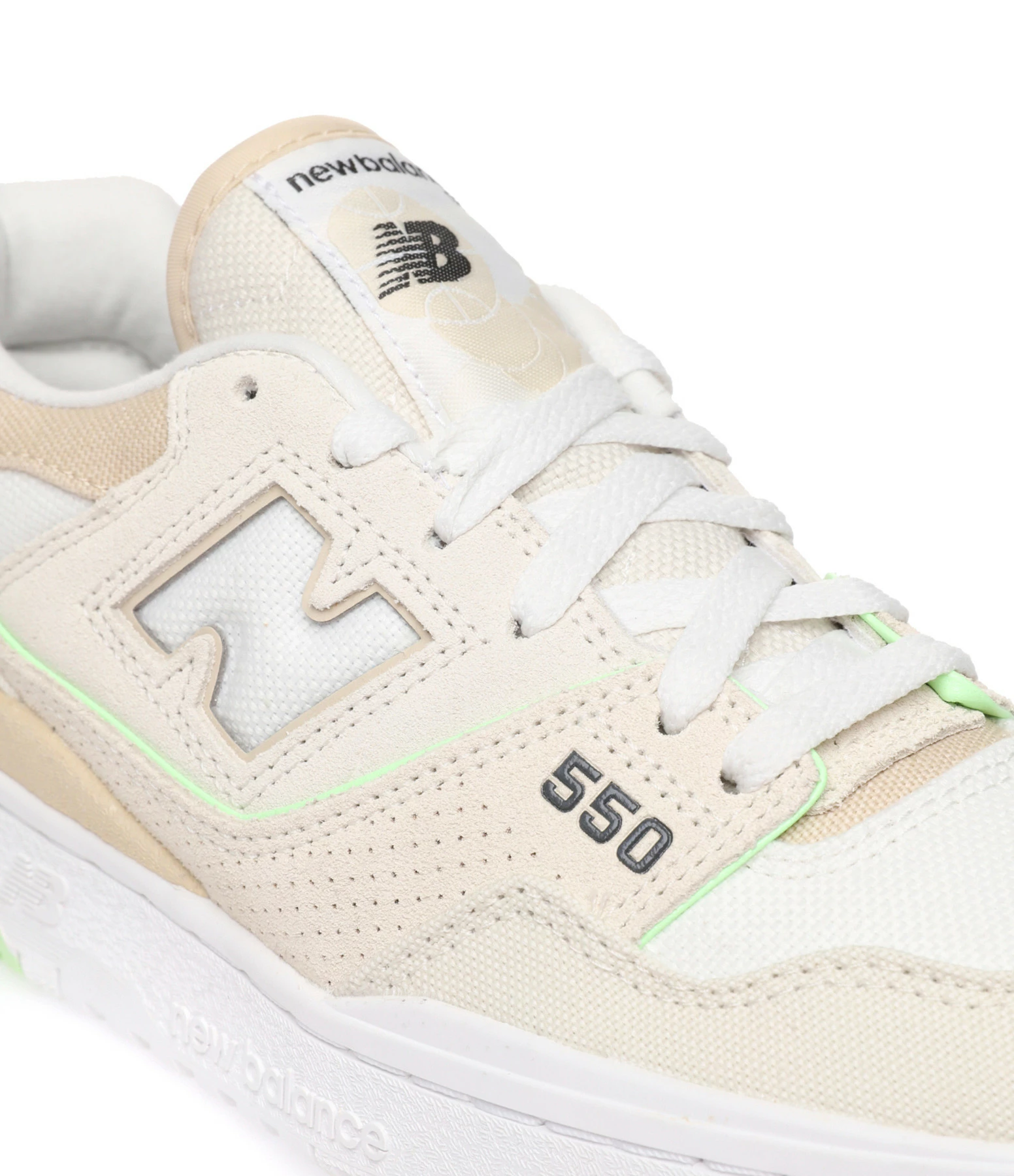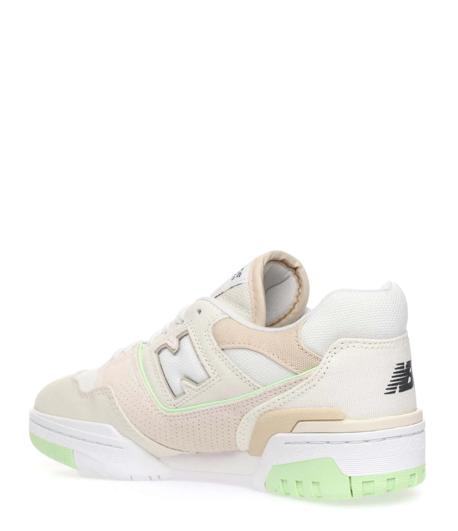 Baskets basses en cuir suédé et perforé beige. Détails vert. Lacets blancs. Semelle extérieure blanche et verte.