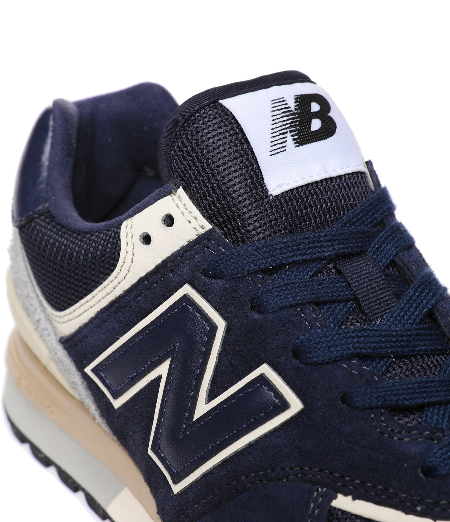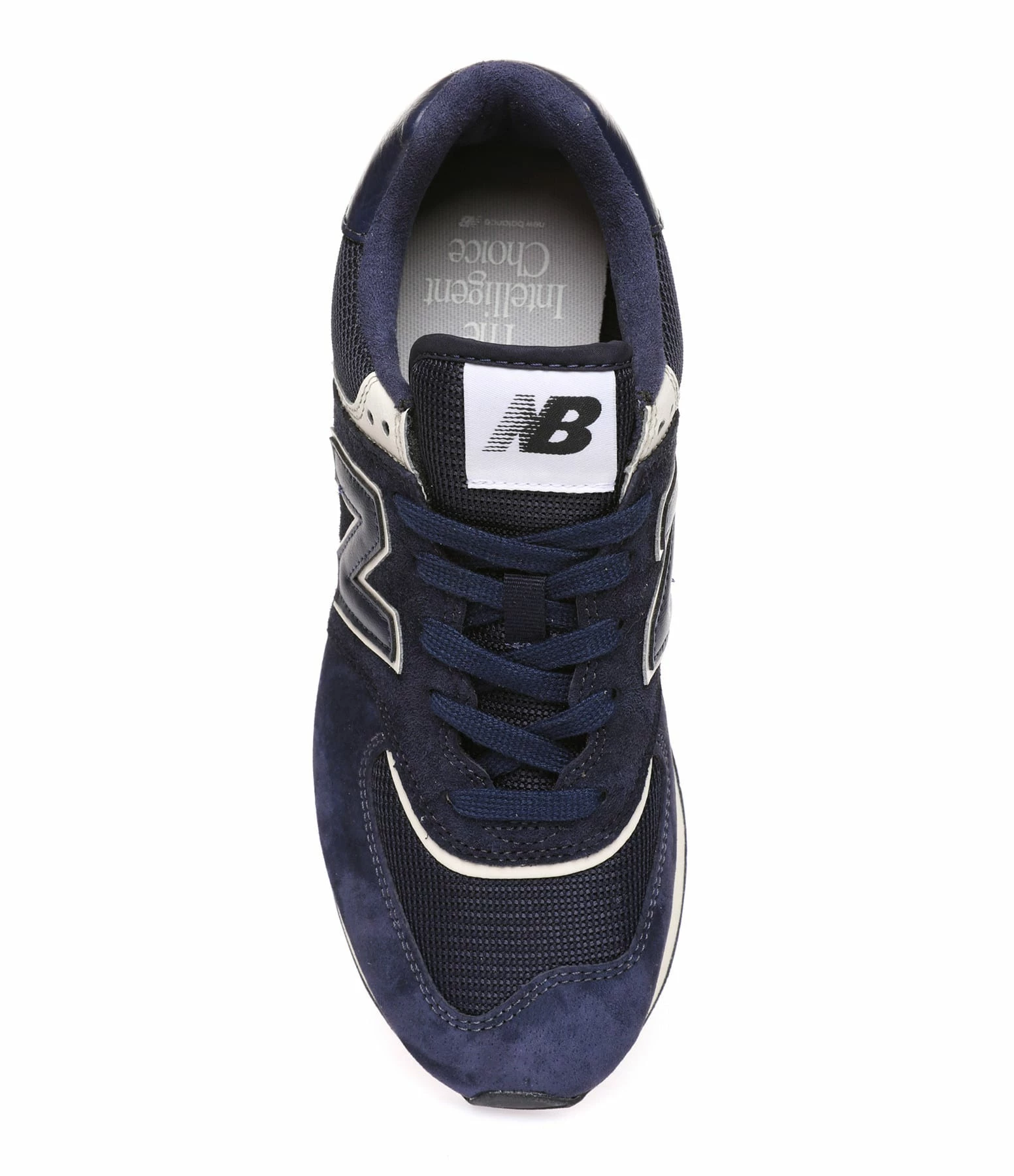 Basket basse bi-matière en cuir suédé et maille filet bleu marine avec empiècement “N” en cuir lisse bleu marine. Languette en tissu bleu marine. Renfort talon bleu marine avec inscription “NEW BALANCE”.