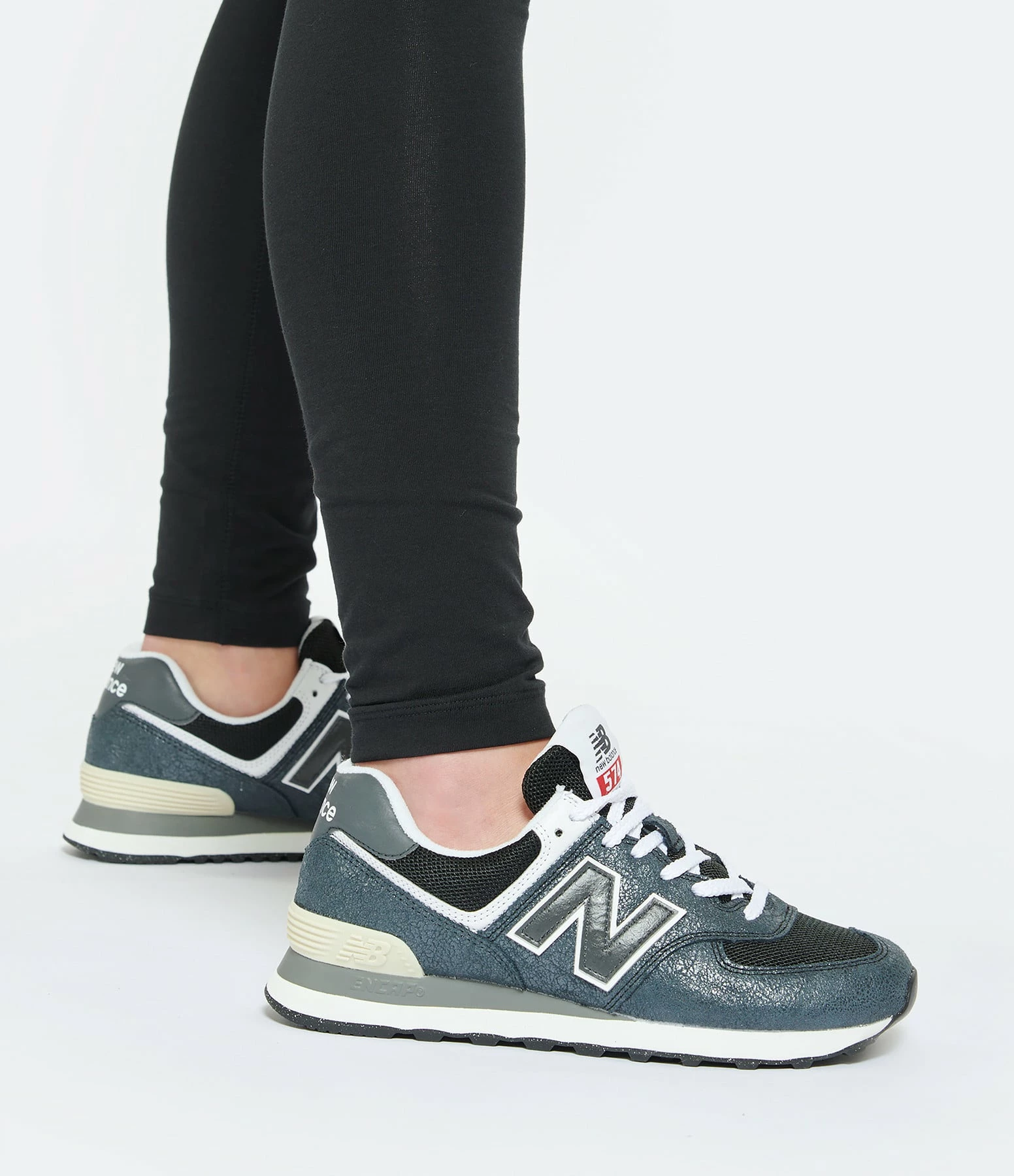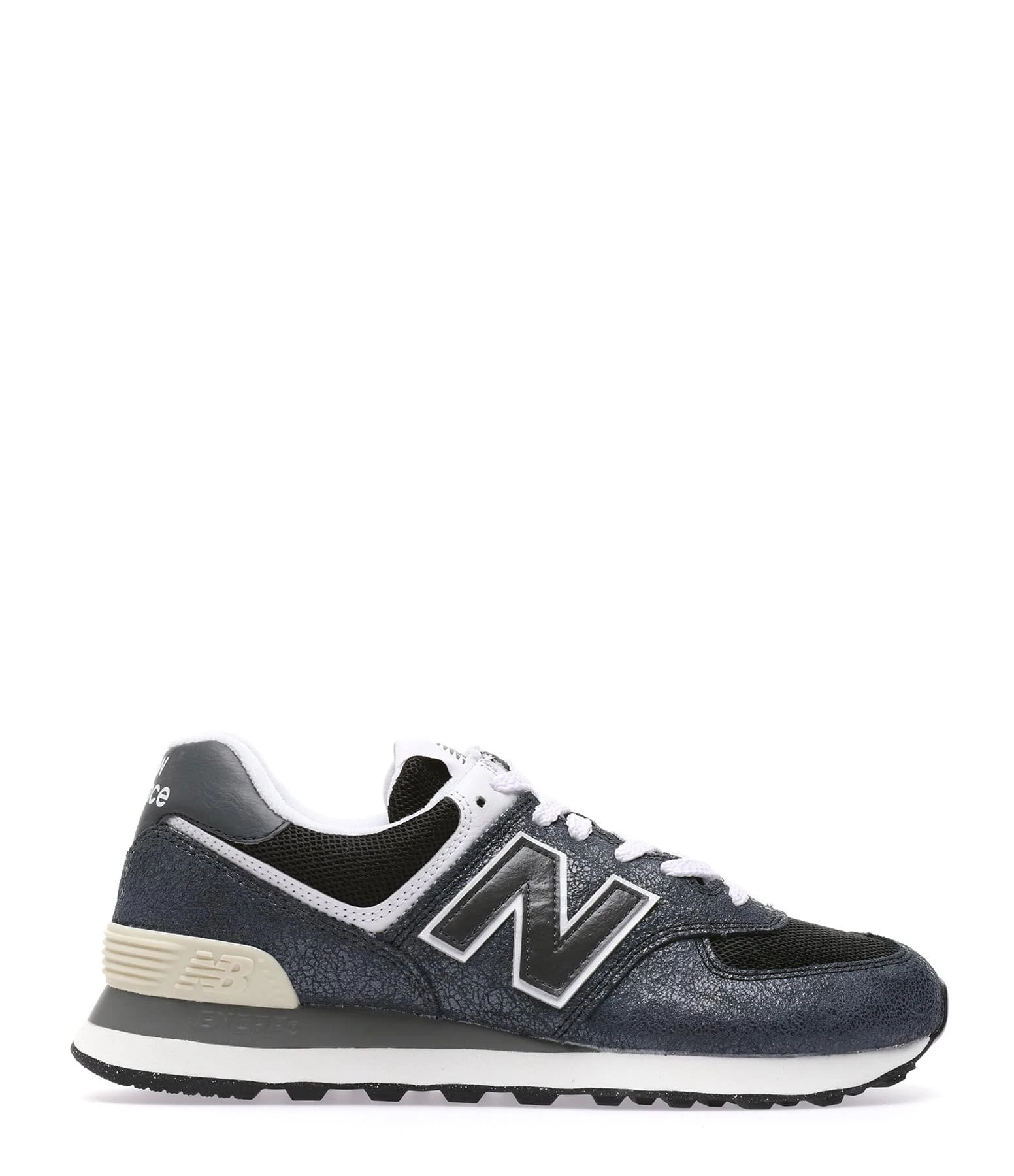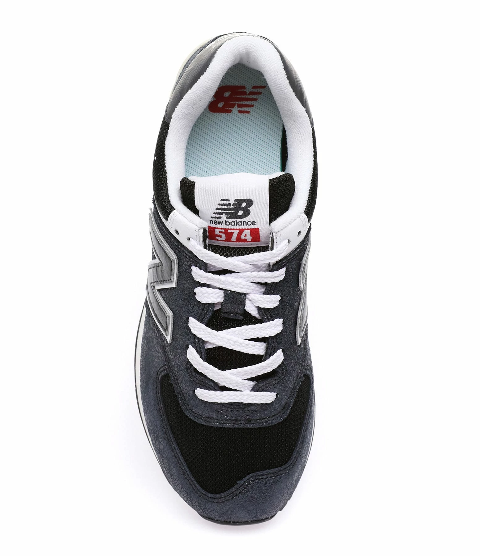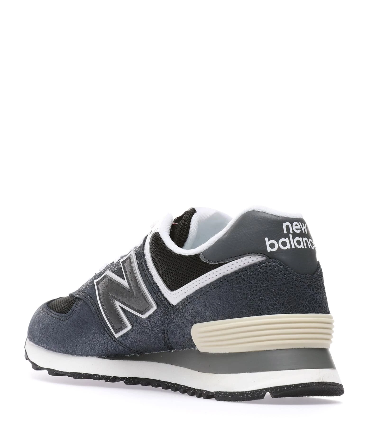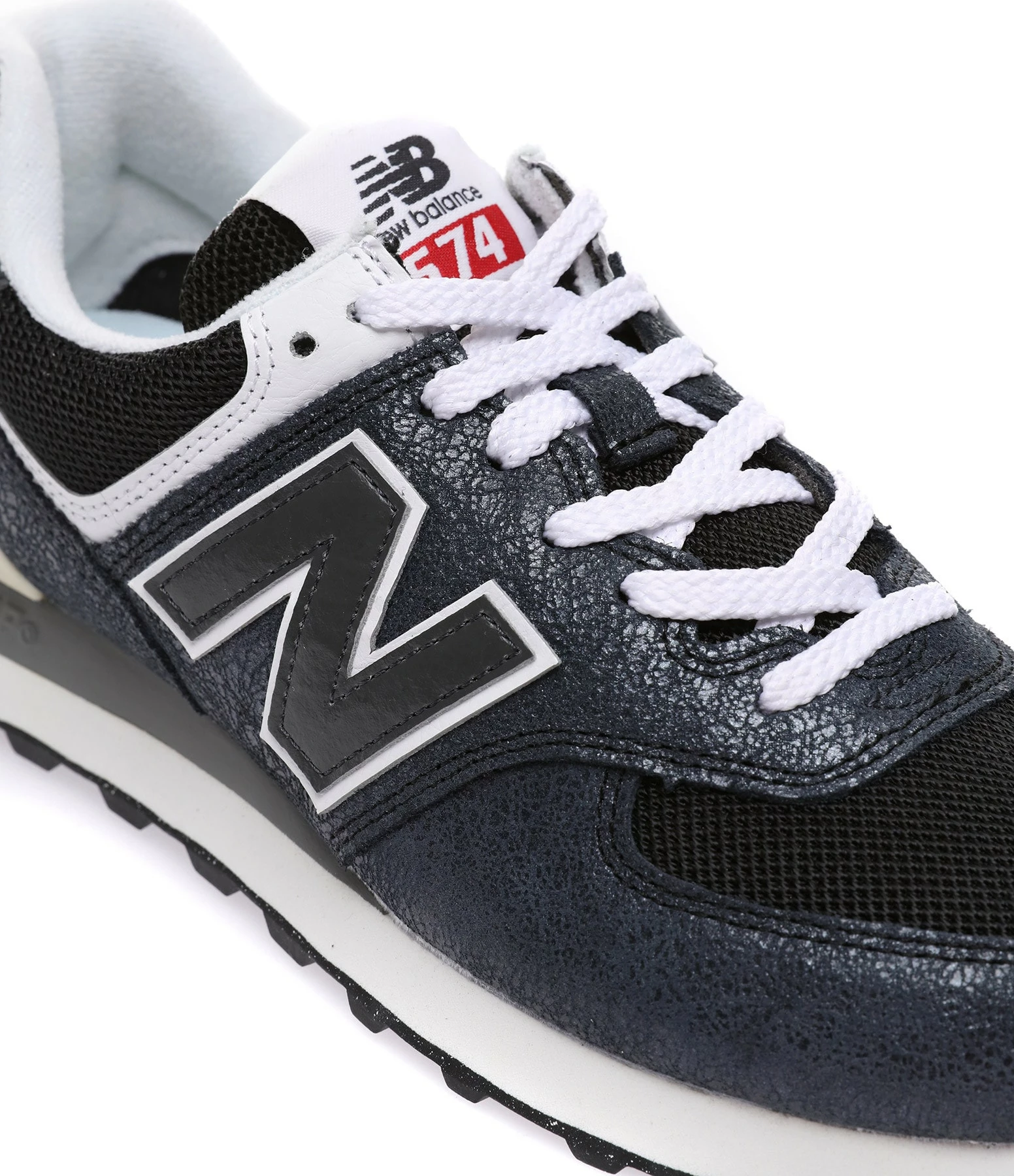 Basket basse bi-matière en cuir bleu et maille filet noire avec empiècement “N” en cuir lisse noir. Languette en tissu noir. Renfort talon vert avec inscription “NEW BALANCE”.