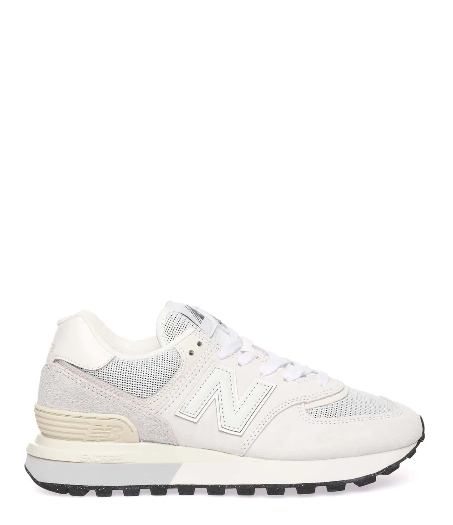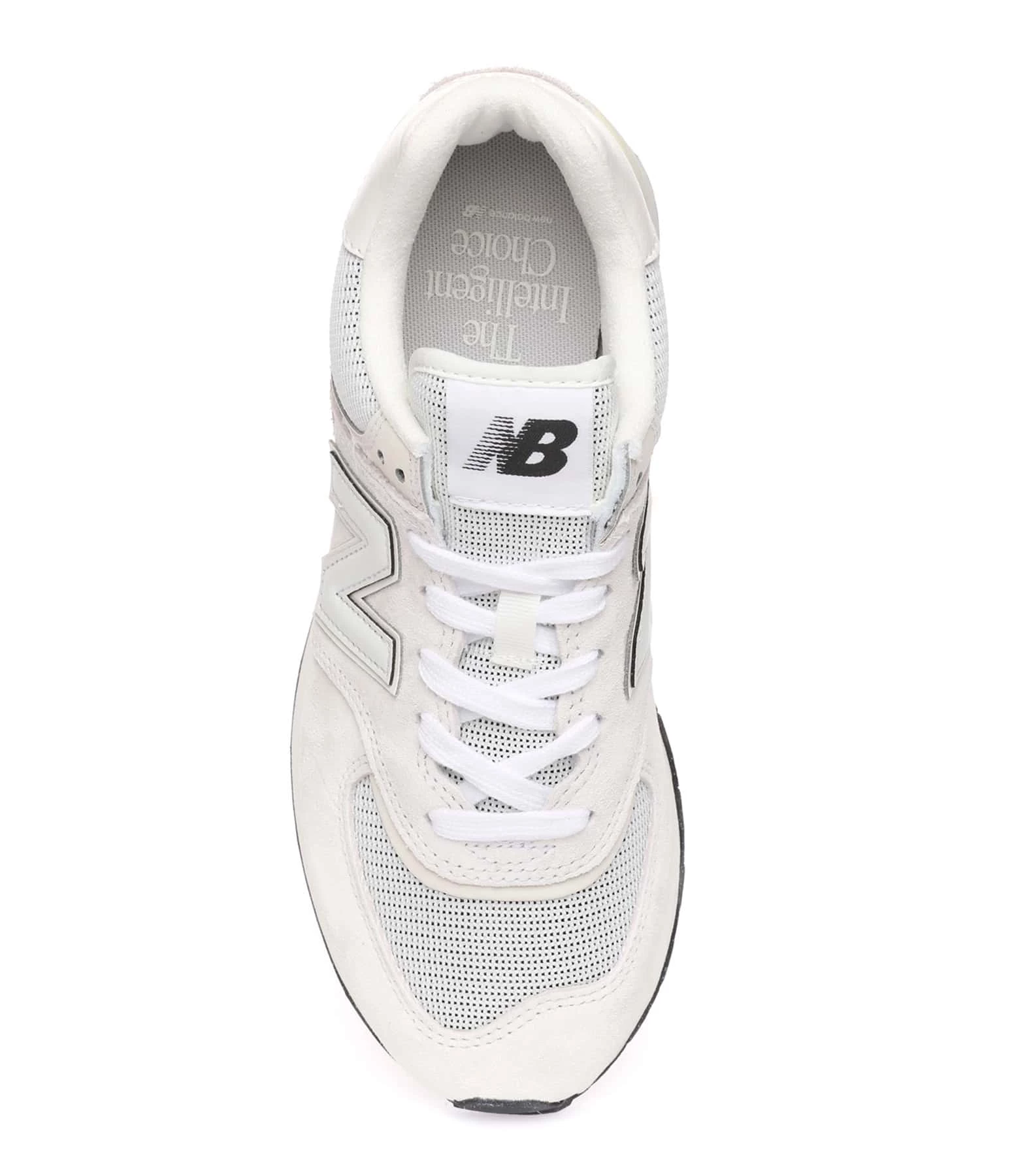 Basket basse bi-matière en cuir suédé et maille filet écru avec empiècement “N” en cuir lisse blanc. Languette en tissu écru. Renfort talon blanc avec inscription “NEW BALANCE”.