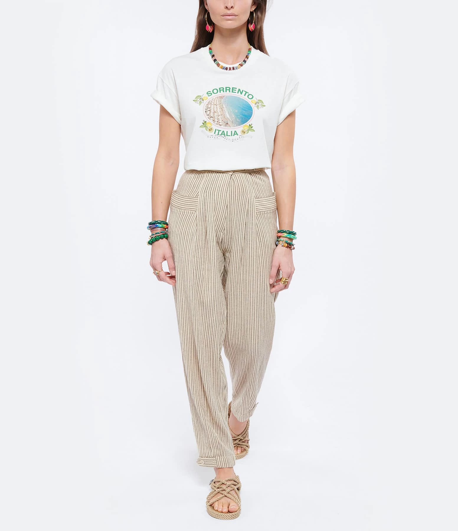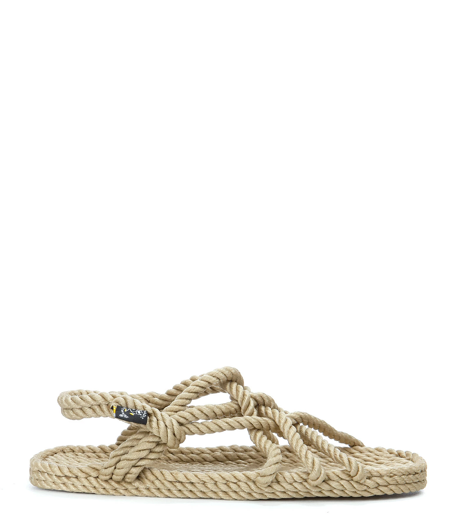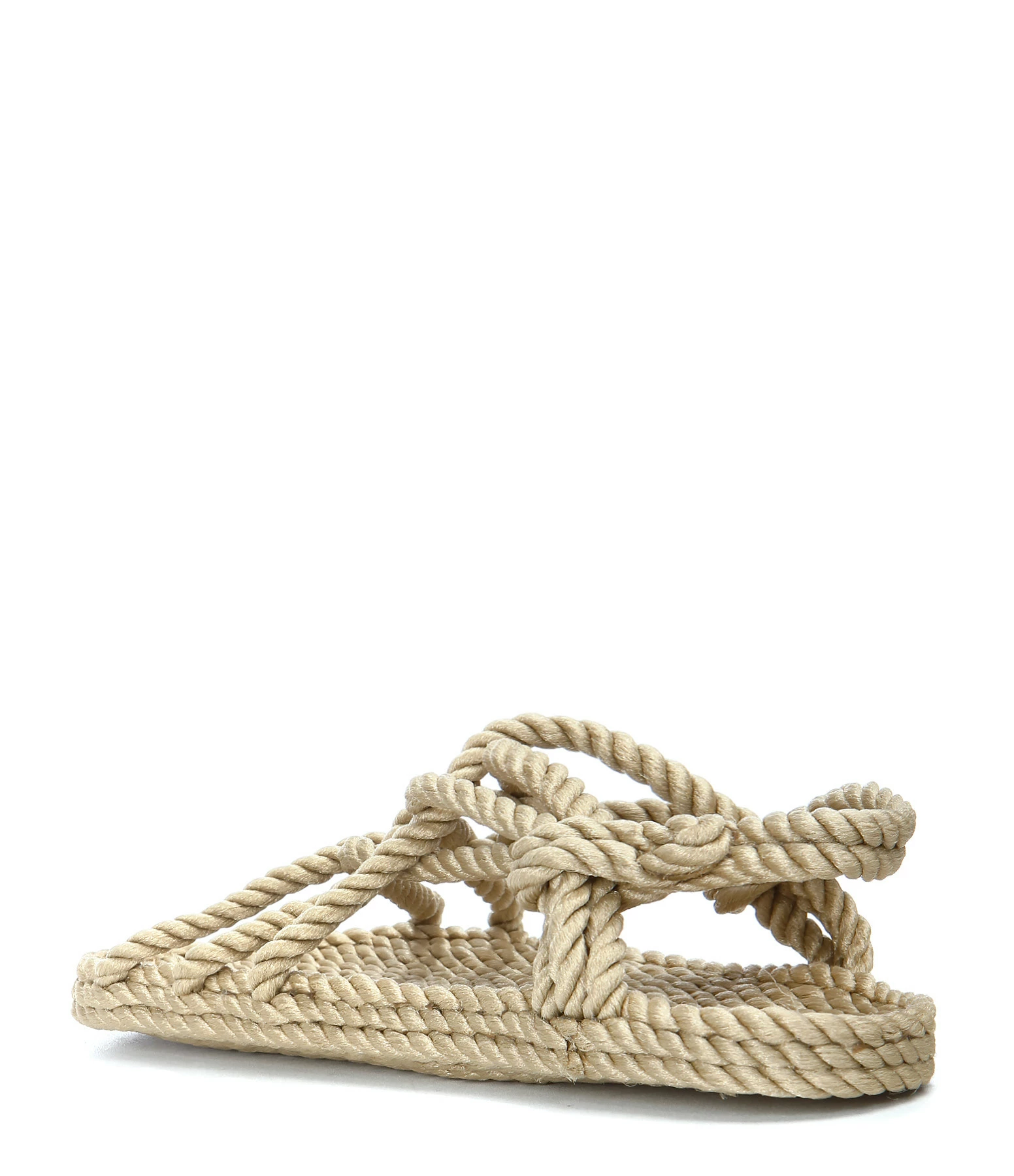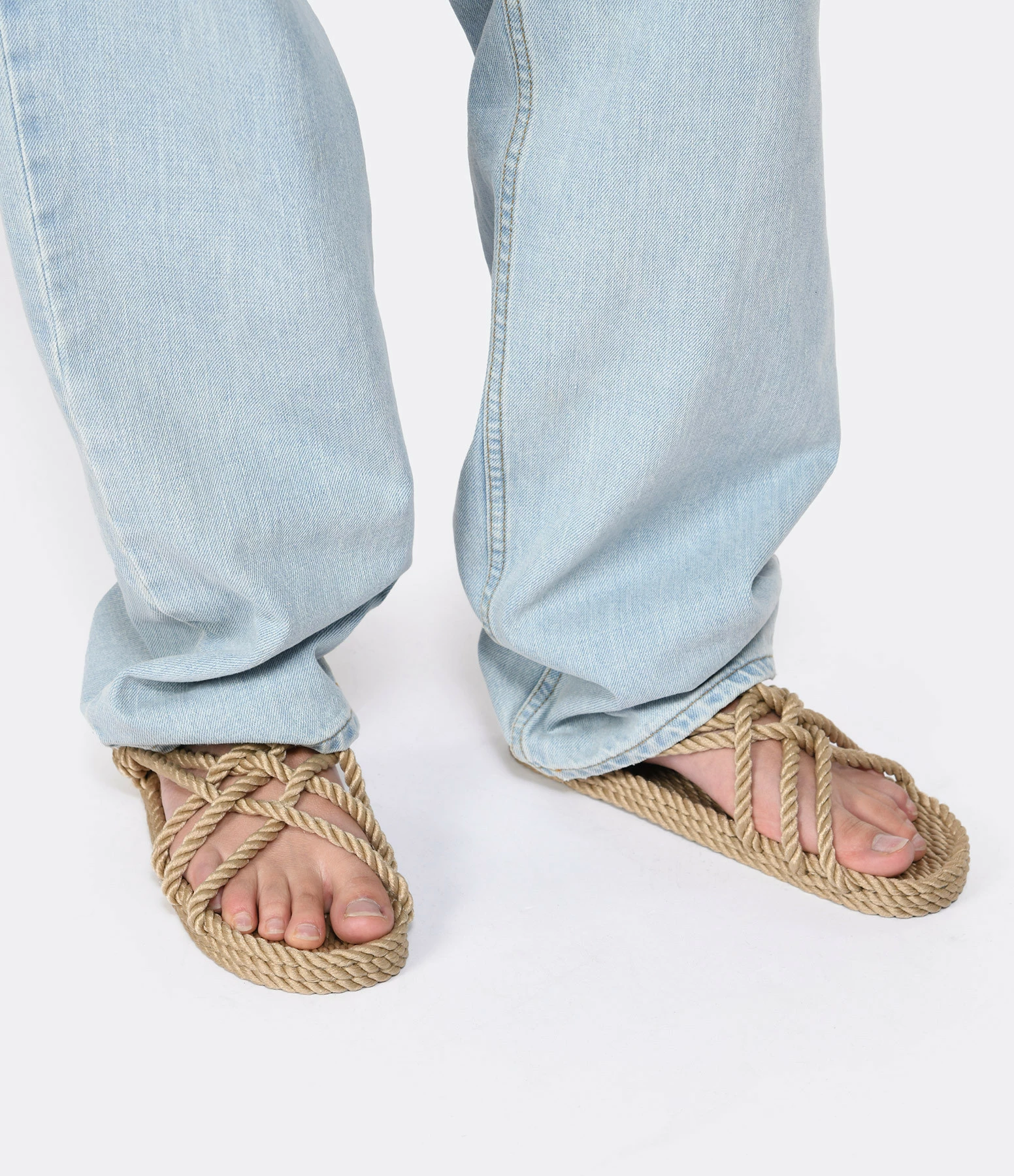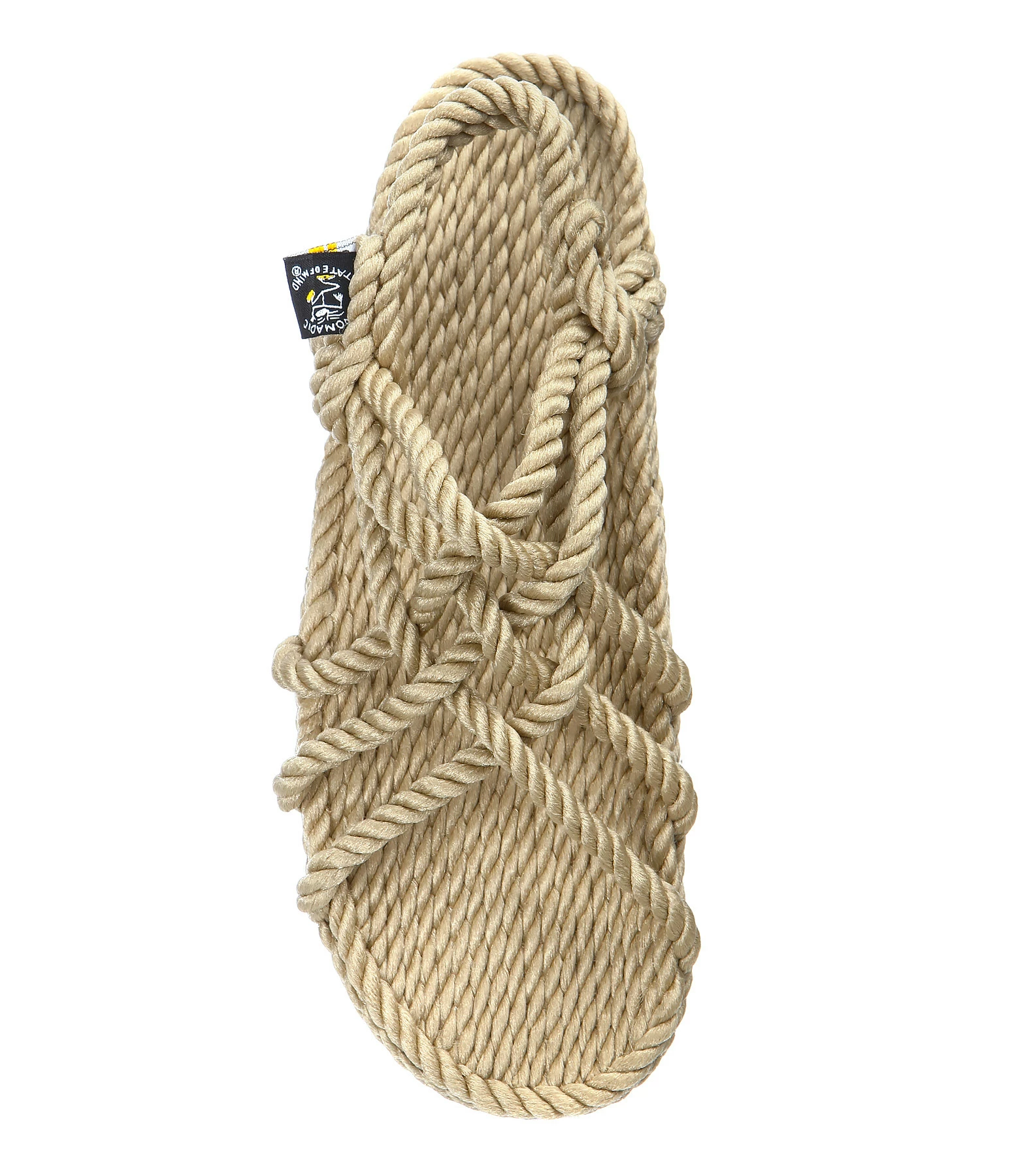 Sandales pour femme, en corde beige, tressage sur le pied, ajustable par corde coulissante au talon.
