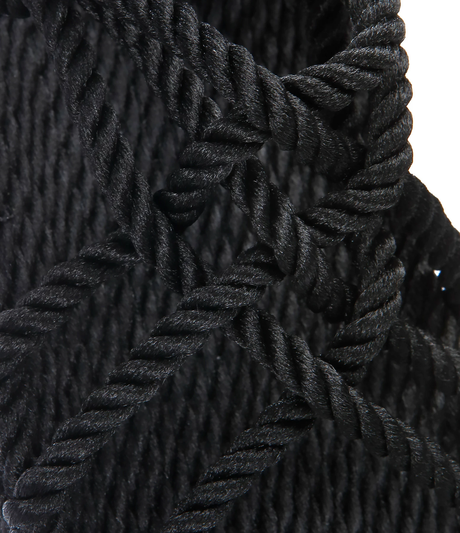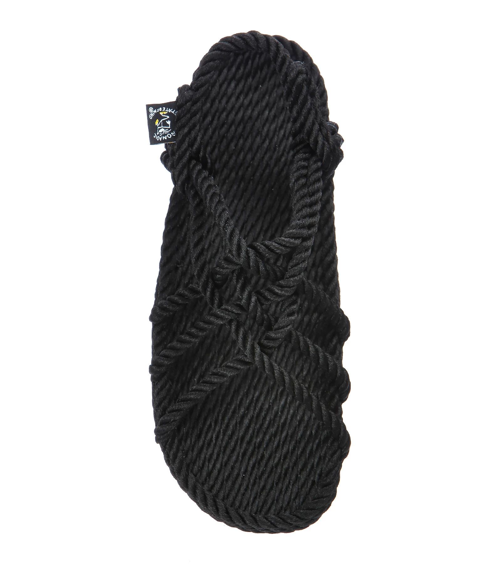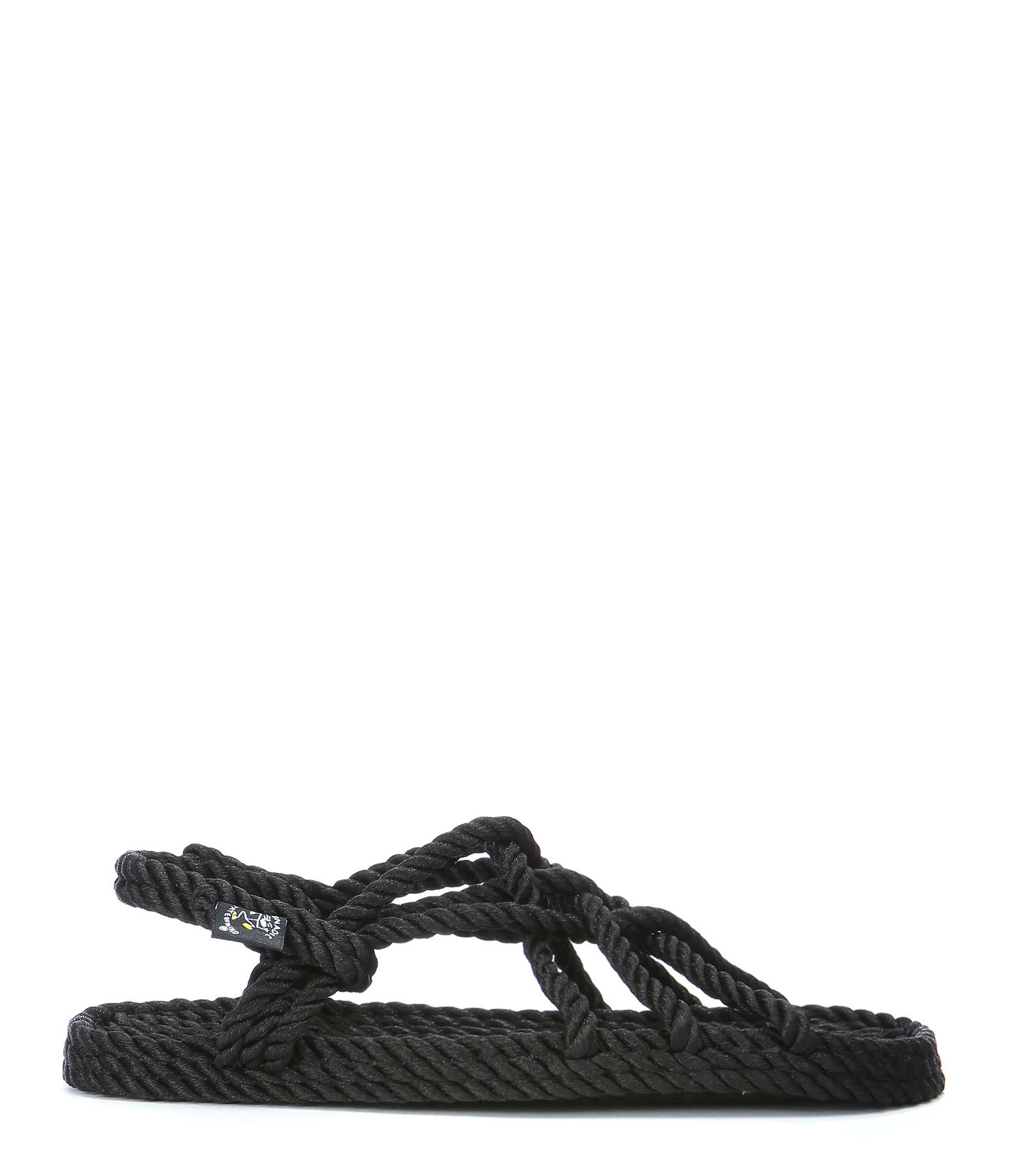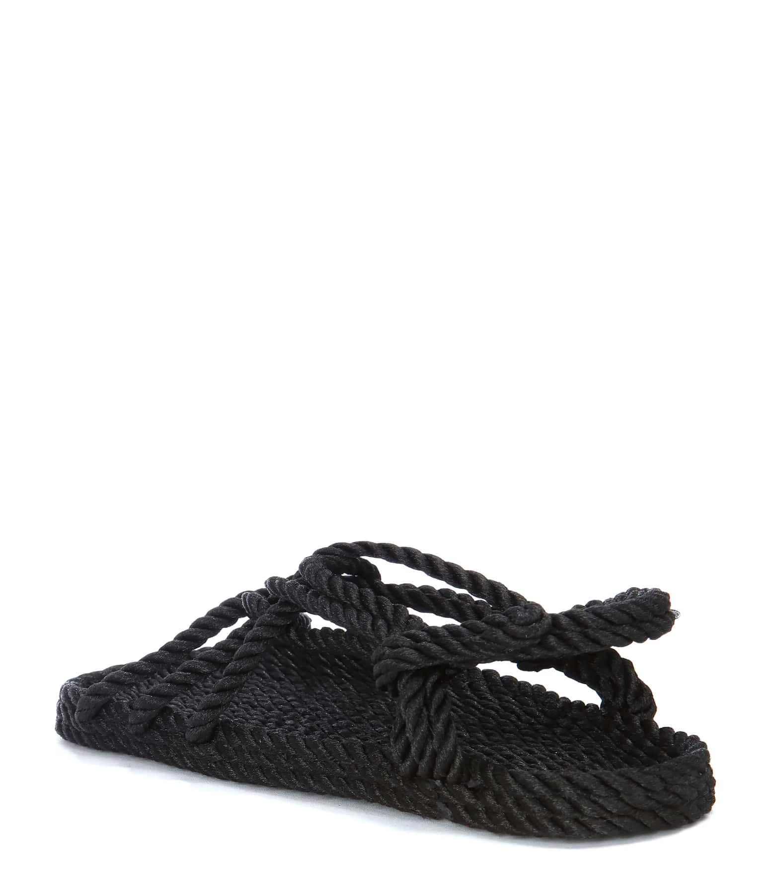 Sandales pour femme, en corde noire, tressage sur le pied, ajustable par corde coulissante au talon.