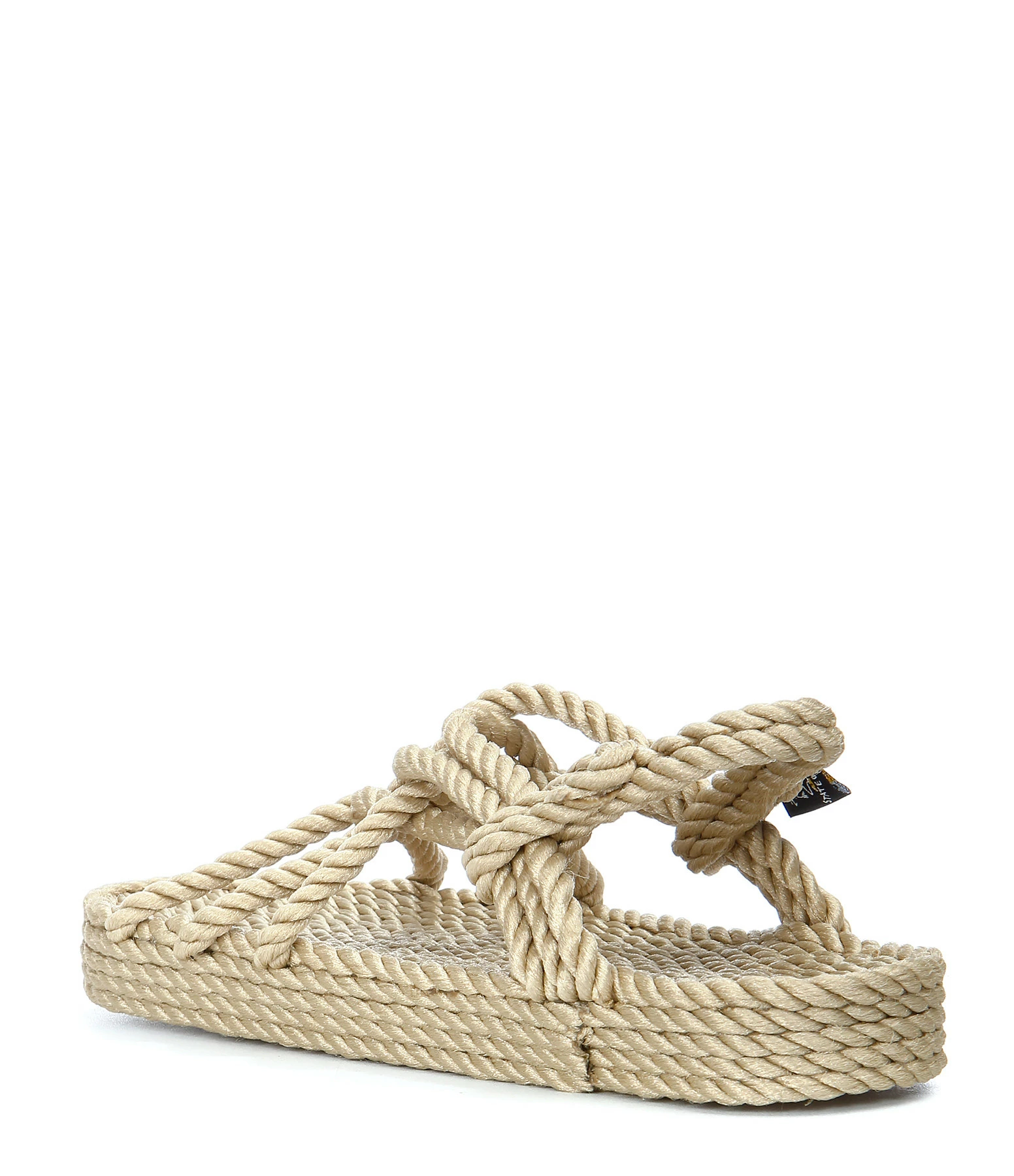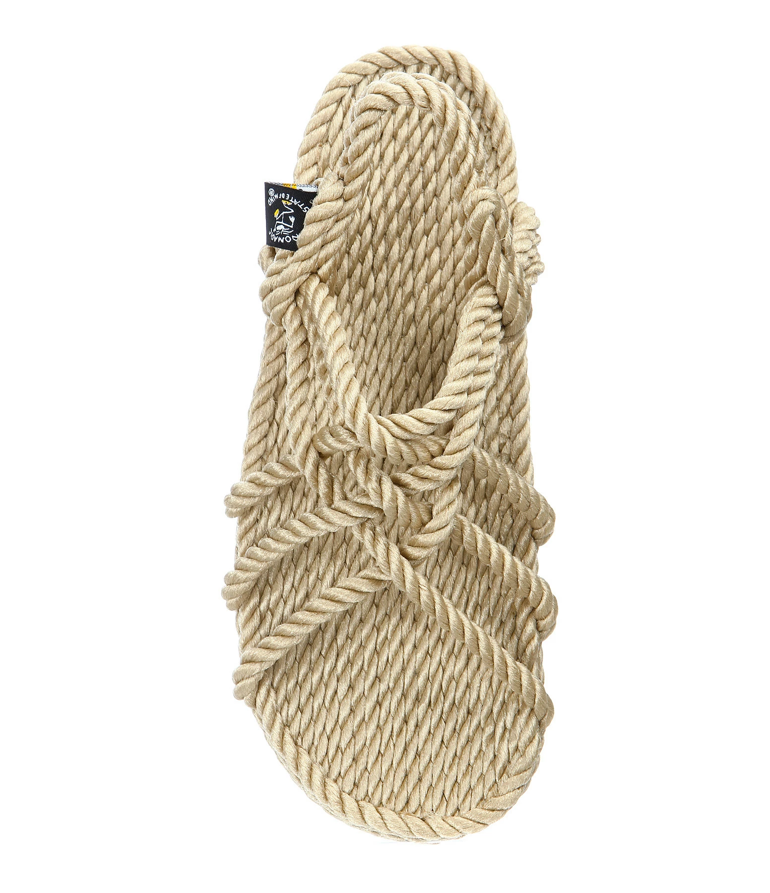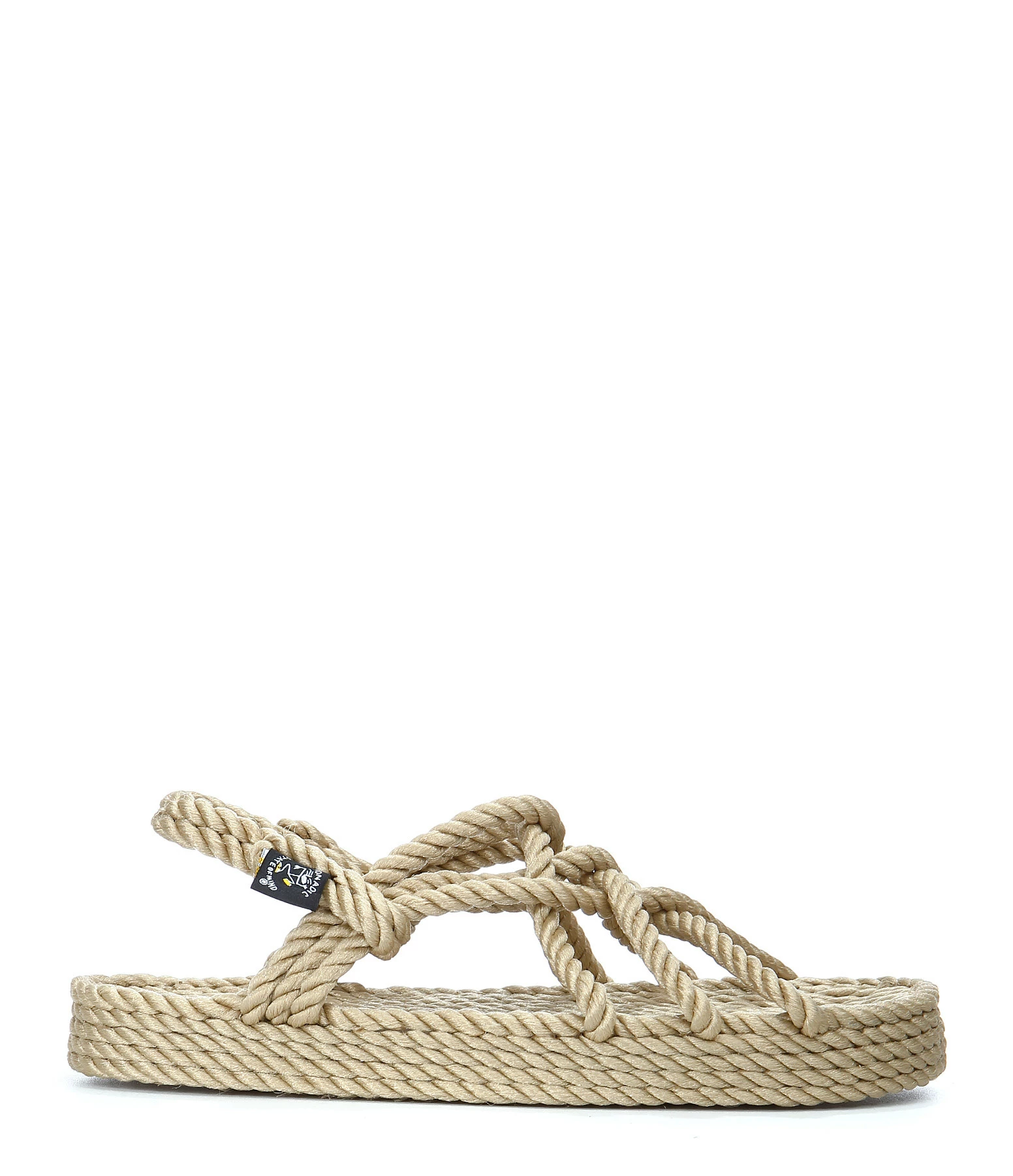 Sandales compensées pour femme, en corde beige, tressage sur le pied, ajustable par corde coulissante au talon.