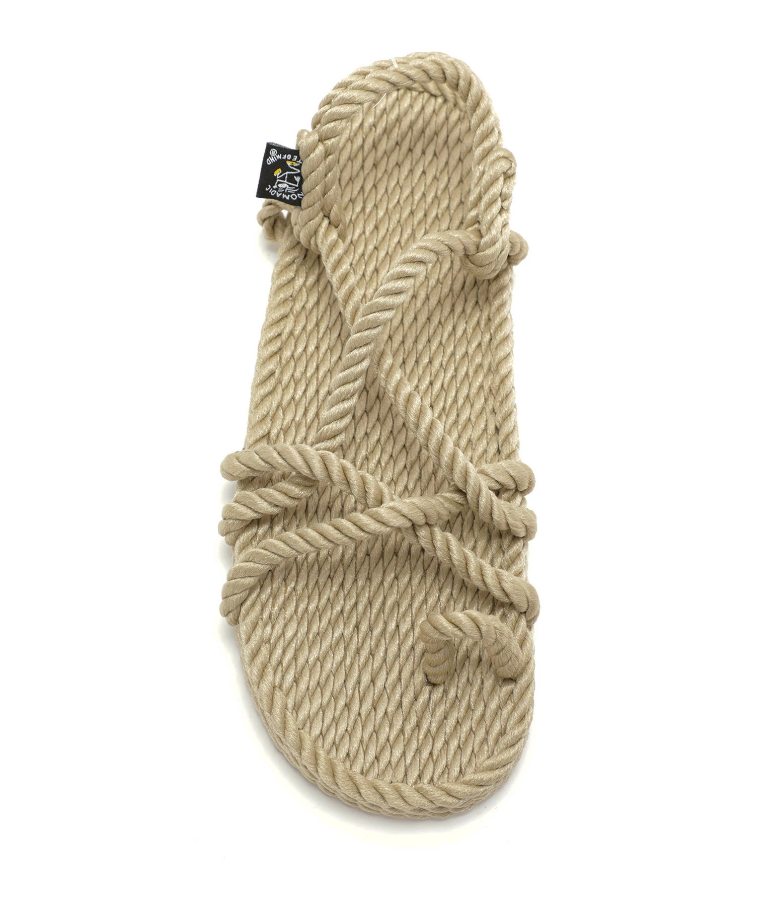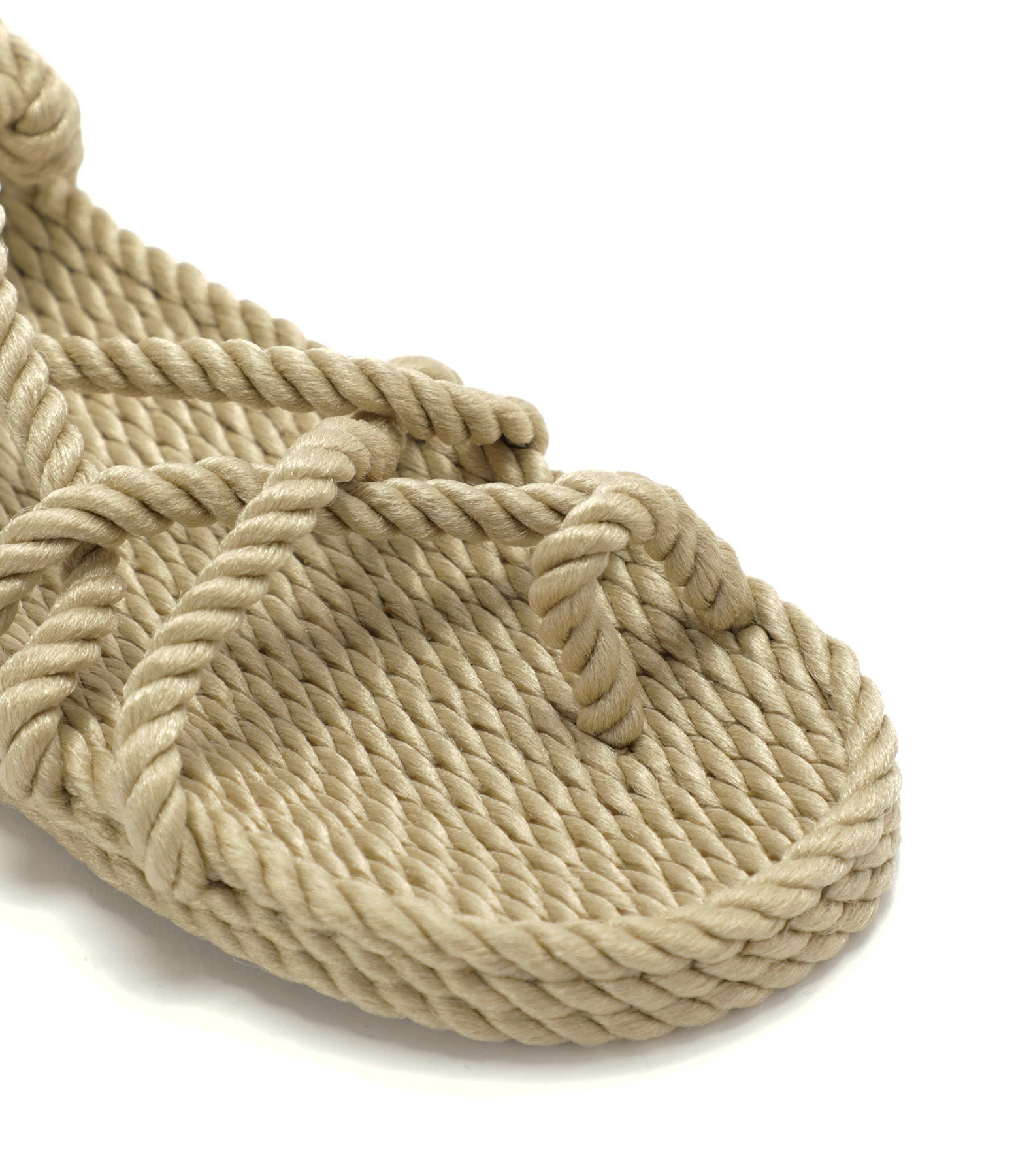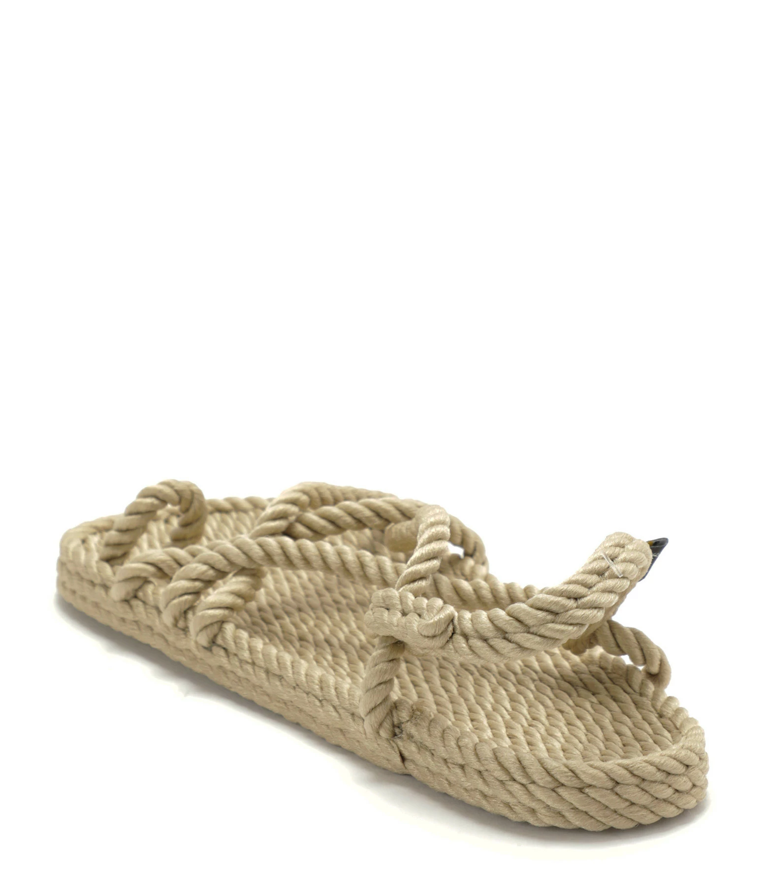 Sandales pour femme, en corde beige, passant pour le pouce et tressage sur le pied.Ajustable par corde coulissante au talon.