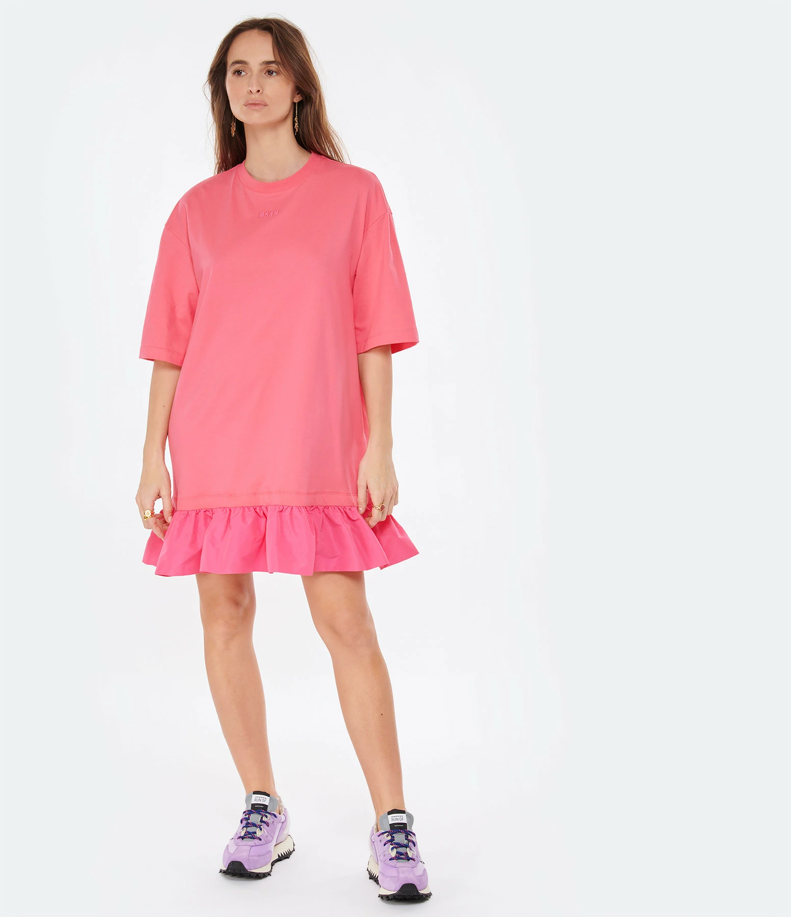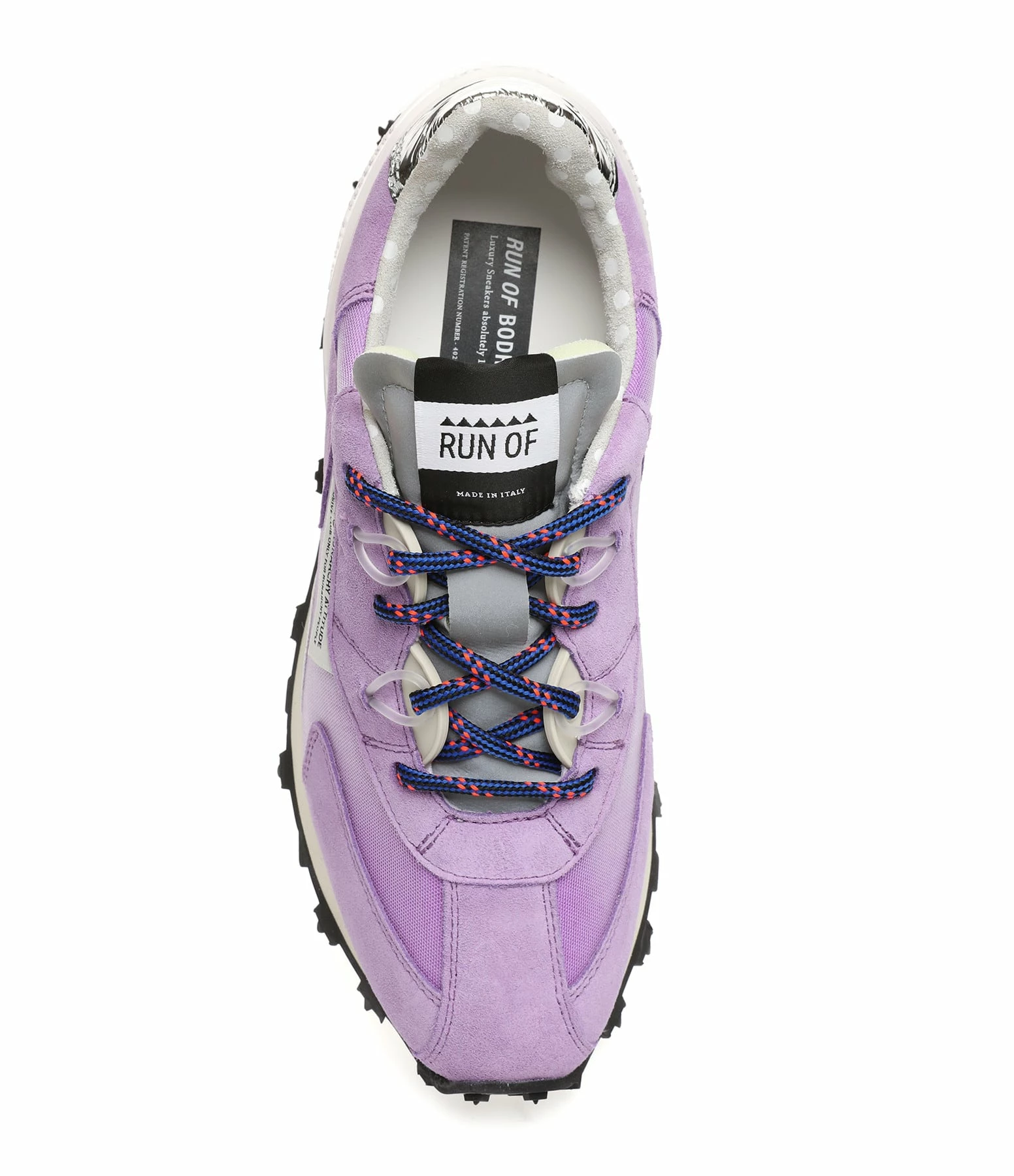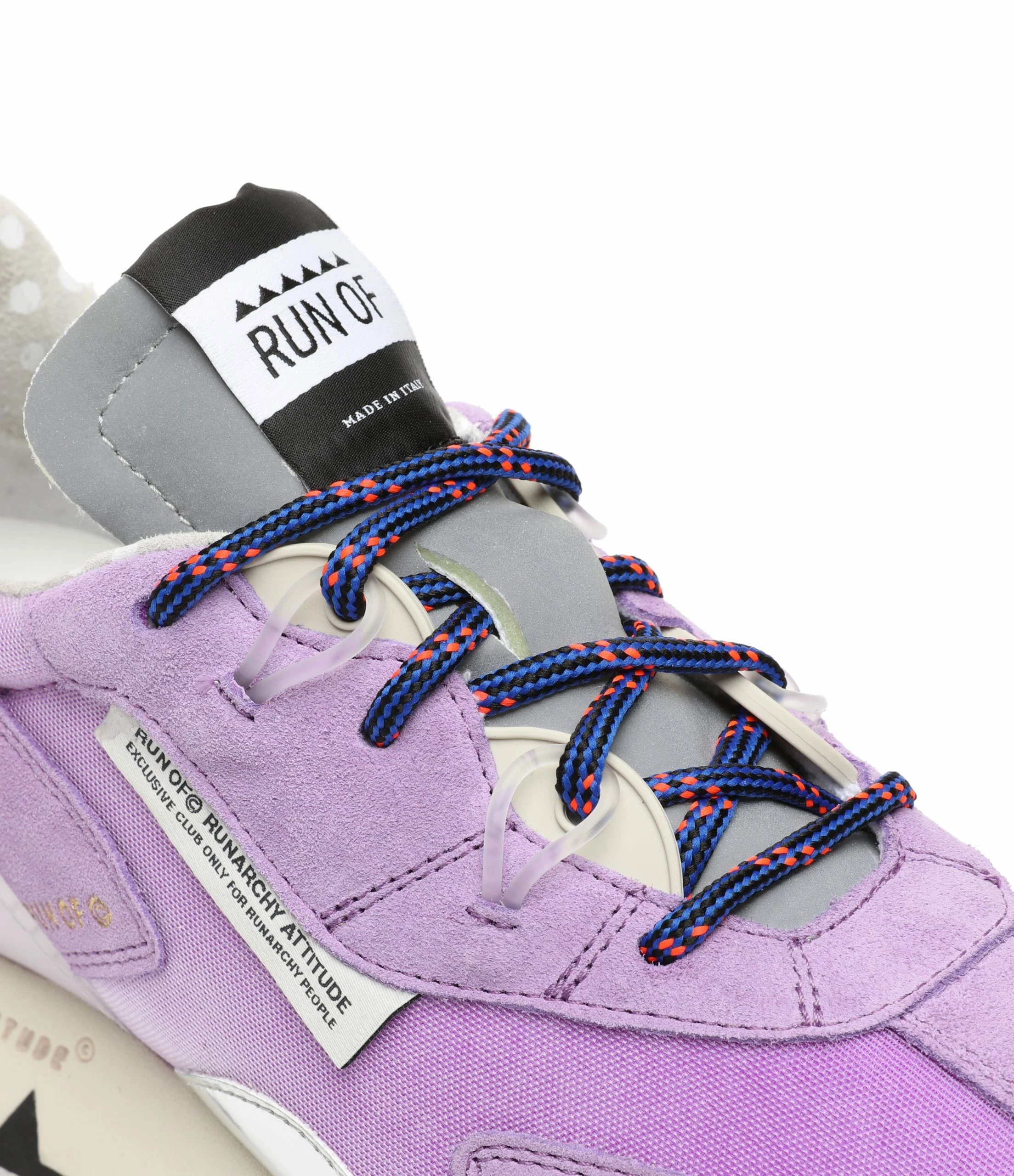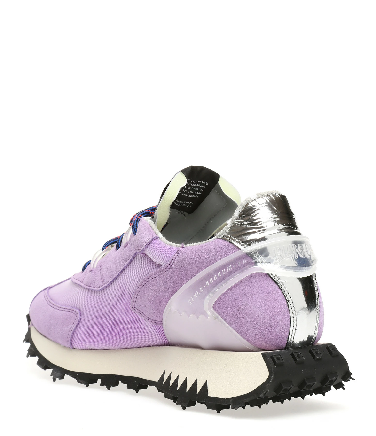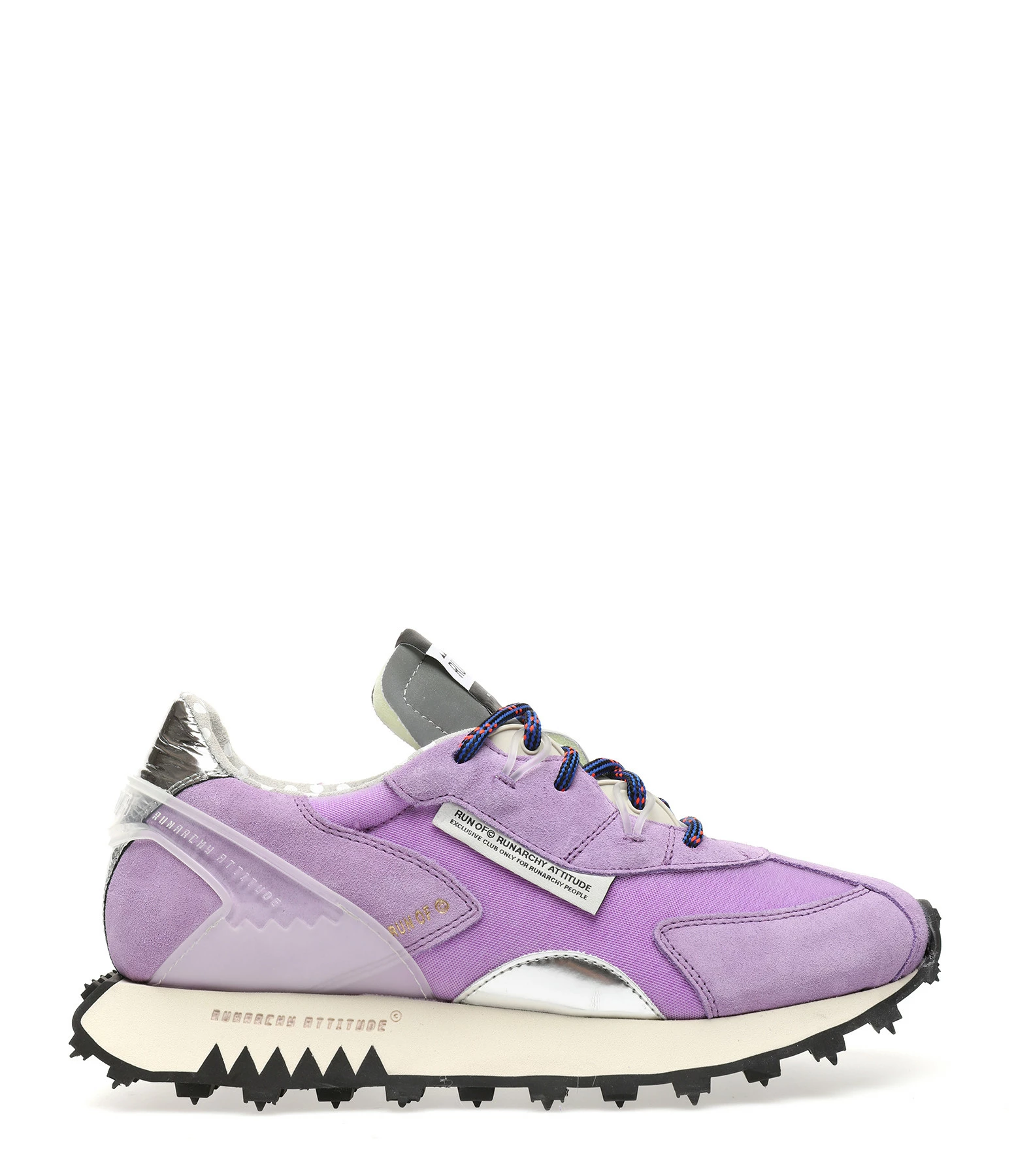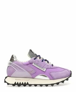 Baskets running violettes à empiècements contrastants multi-matières. Renfort en plastique transparent au talon. Lacets bleus et rouges. Semelle en caoutchouc crantée.